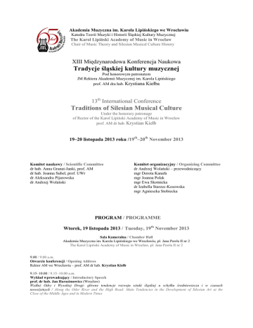 Akademia Muzyczna im. Karola Lipińskiego we Wrocławiu Katedra Teorii Muzyki i Historii Śląskiej Kultury Muzycznej The Karol Lipiński Academy of Music in Wrocław Chair of Music Theory and Silesian Musical Culture History XIII Międzynarodowa Konferencja Naukowa Tradycje śląskiej kultury muzycznej Pod honorowym patronatem JM Rektora Akademii Muzycznej im. Karola Lipińskiego prof. AM dra hab. Krystiana Kiełba 13th International Conference Traditions of Silesian Musical Culture Under the honorary patronage of Rector of the Karol Lipiński Academy of Music in Wrocław prof. AM dr hab. Krystian Kiełb 19–20 listopada 2013 roku /19th–20th November 2013 Komitet naukowy / Scientific Committee dr hab. Anna Granat-Janki, prof. AM dr hab. Joanna Subel, prof. UWr dr Aleksandra Pijarowska dr Andrzej Wolański Komitet organizacyjny / Organizing Committee dr Andrzej Wolański – przewodniczący mgr Dorota Kanafa mgr Joanna Polak mgr Ewa Skotnicka dr Izabella Starzec-Kosowska mgr Agnieszka Stobiecka PROGRAM / PROGRAMME Wtorek, 19 listopada 2013 / Tuesday, 19th November 2013 Sala Kameralna / Chamber Hall Akademia Muzyczna im. Karola Lipińskiego we Wrocławiu, pl. Jana Pawła II nr 2 The Karol Lipiński Academy of Music in Wrocław, pl. Jana Pawła II nr 2 9.00 / 9.00 a.m. Otwarcie konferencji / Opening Address Rektor AM we Wrocławiu – prof. AM dr hab. Krystian Kiełb 9.15–10.00 / 9.15–10.00 a.m. Wykład wprowadzający / Introductory Speech prof. dr hab. Jan Harasimowicz (Wrocław) Wzdłuż Odry i Wysokiej Drogi: główne tendencje rozwoju sztuki śląskiej u schyłku średniowiecza i w czasach nowożytnych / Along the Oder River and the High Road: Main Tendencies in the Development of Silesian Art at the Close of the Middle Ages and in Modern Times Sesja I – Pomiędzy konfesjami Session I – Between Faiths 10.00–11.30 / 10.00–11.30 a.m. Prowadzenie / Host dr hab. Ryszard Wieczorek, prof. UAM (Poznań) 10.00–10.30 / 10.00–10.30 a.m. dr hab. Tomasz Jeż (Warszawa) Repertuar muzyczny pomiędzy konfesjami. Strategie rekatolizacyjne w nyskim śpiewniku Johanna Schubarta (1625) / Musical Repertoire Between Faiths. Re-Catholicisation Strategies in Johann Schubart’s Nysa Church Songbook (1625) 10.30–11.00 / 10.30–11.00 a.m. dr Zenon Mojżysz (Cieszyn) Muzyka ewangelików cieszyńskich w pierwszej połowie XVIII wieku – między pietyzmem a lojalizmem / Music of Cieszyn Evangelicals in the First Half of the 18th Century – Between Pietism and Loyalism 11.00–11.30 /11.00–11.30 a.m. mgr Krzysztof Stefański (Poznań) Kultura muzyczna kościoła św. Bernardyna we Wrocławiu w latach 1648–1741 / Musical Culture in Saint Bernardine’s Church in Wrocław in the Years 1648–1741 11.30–12.00 / 11.30–12.00 p.m. przerwa na kawę / coffee break Sesja II – Wśród bogactwa źródeł Session II – Among the Multitude of Sources 12.00–14.00 / 12.00–2.00 p.m. Prowadzenie / Host dr hab. Remigiusz Pośpiech, prof. UWr/UO (Wrocław, Opole) 12.00–12.30 / 12.00–12.30 p.m. dr hab. Ryszard Wieczorek, prof. UAM (Poznań) Wrocławski Codex 2016: problematyka edycji źródła z przełomu XV/XVI wieku / Wrocław Codex 2016: Issues Related to the Edition of the Source from the Turn of the 15th and 16th Centuries 12.30–13.00 / 12.30–1.00 p.m. dr Dawid Ślusarczyk (Wrocław) Kompozycje Gottloba Siegerta (1789–1868) zachowane w zbiorach Biblioteki Uniwersyteckiej we Wrocławiu / The Works of Gottlob Siegert (1789–1868) Preserved in the Collection of the University of Wrocław Library 13.00–13.30 / 1.00–1.30 p.m. mgr Grzegorz Joachimiak (Wrocław) Krzeszowski epizod czy bliska współpraca? Kompozycje organisty, pedagoga i kompozytora śląskich cystersów Karla Sedlaka zachowane w kolekcji rękopiśmiennych tabulatur lutniowych cystersów krzeszowskich z XVIII wieku / Krzeszów Episode or Close Cooperation? The Works of a Silesian Cistercian Organist, Teacher and Composer Karl Sedlak Preserved in the Krzeszów Cistercians’ Collection of Manuscript Lute Tabulatures from the 18th Century 13.30–14.00 / 1.30–2.00 p.m. mgr Ludmiła Sawicka (Warszawa) Muzykalia ze zbiorów Biblioteki Kapitulnej we Wrocławiu w świetle inwentarza Josepha Engela / Music Materials from the Collection of the Library of the Cathedral Chapter in Wrocław in the Light of Joseph Engel’s Inventory 14.00–15.30 / 2.00–3.30 p.m. przerwa obiadowa / lunch break Sesja III – Pomiędzy narodami Session III – Between Nations 15.30–17.00 / 3.30–5.00 p.m. Prowadzenie / Host dr hab. Joanna Subel, prof. UWr (Wrocław) 15.30–16.00 / 3.30–4.00 p.m. prof. dr hab. Helmut Loos (Lipsk) Berichte über das Breslauer Musikleben in Leipziger Musikzeitschriften / Reports on Wrocław Musical Life in Leipzig Music Press 16.00–16.30 / 4.00–4.30 p.m. dr hab. Remigiusz Pośpiech, prof. UWr/UO (Wrocław, Opole) Józefa Elsnera msza dla Grodkowa / Józef Elsner’s Mass for Grodków 16.30–17.00 / 4.30–5.00 p.m. dr Agnieszka Drożdżewska (Wrocław) Przedweberowskie ujęcie legendy o Duchu Gór. Opera Rübezahl Vincenca Ferrariusa Tučka według rękopisów zachowanych we Wrocławiu i Hamburgu / Pre-Weberian Interpretation of the Legend of the Mountain Spirit. The Opera Rübezahl by Vincenco Ferrarius Tuček as Preserved in the Wrocław and Hamburg Manuscripts 17.00–17.30 / 5.00–5.30 p.m. przerwa na kawę / coffee break Sesja IV – W stronę antropologii. Pomiędzy kulturami Session IV – Towards Anthropology. Between Cultures 17.30–19.00 / 5.30–7.00 p.m. Prowadzenie / Host prof. Grażyna Pstrokońska-Nawratil (Wrocław) 17.30–18.00 / 5.30–6.00 p.m. dr hab. Bożena Muszkalska, prof. UWr/UAM (Wrocław, Poznań) Polifoniczna kultura muzyczna imigrantów z Zagłębia Dąbrowskiego w Wierszynie na Syberii Poliphonic Musical Culture of the Immigrants from the Dąbrowa Basin in the Siberian Village Vershina 18.00–18.30 / 6.00–6.30 p.m. mgr Gabriela Gacek (Warszawa) Muzyczne zakorzenian