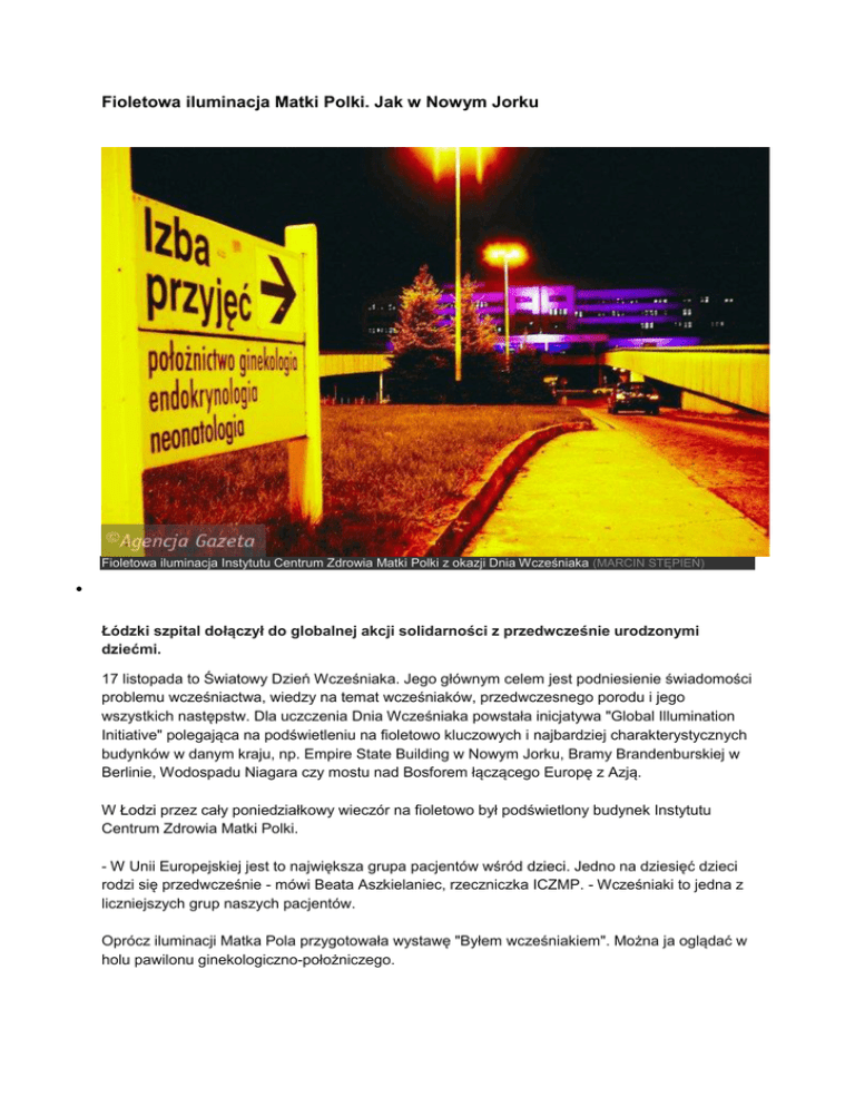 Fioletowa iluminacja Matki Polki. Jak w Nowym Jorku Fioletowa iluminacja Instytutu Centrum Zdrowia Matki Polki z okazji Dnia Wcześniaka (MARCIN STĘPIEŃ) Łódzki szpital dołączył do globalnej akcji solidarności z przedwcześnie urodzonymi dziećmi. 17 listopada to Światowy Dzień Wcześniaka. Jego głównym celem jest podniesienie świadomości problemu wcześniactwa, wiedzy na temat wcześniaków, przedwczesnego porodu i jego wszystkich następstw. Dla uczczenia Dnia Wcześniaka powstała inicjatywa "Global Illumination Initiative" polegająca na podświetleniu na fioletowo kluczowych i najbardziej charakterystycznych budynków w danym kraju, np. Empire State Building w Nowym Jorku, Bramy Brandenburskiej w Berlinie, Wodospadu Niagara czy mostu nad Bosforem łączącego Europę z Azją. W Łodzi przez cały poniedziałkowy wieczór na fioletowo był podświetlony budynek Instytutu Centrum Zdrowia Matki Polki. - W Unii Europejskiej jest to największa grupa pacjentów wśród dzieci. Jedno na dziesięć dzieci rodzi się przedwcześnie - mówi Beata Aszkielaniec, rzeczniczka ICZMP. - Wcześniaki to jedna z liczniejszych grup naszych pacjentów. Oprócz iluminacji Matka Pola przygotowała wystawę "Byłem wcześniakiem". Można ja oglądać w holu pawilonu ginekologiczno-położniczego.