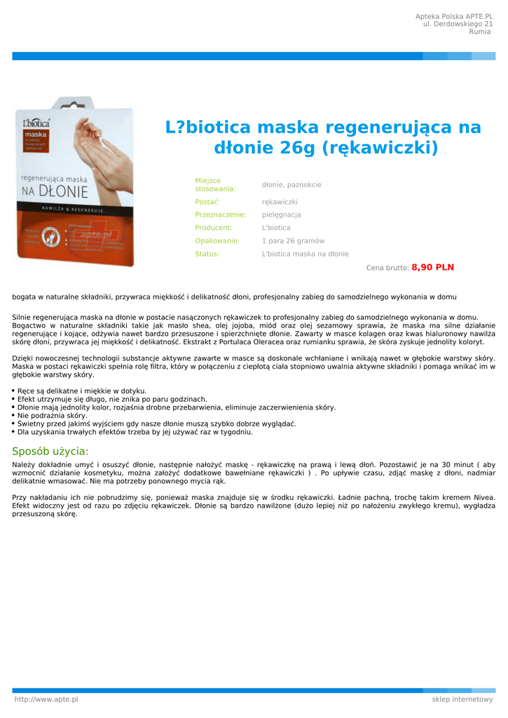 Apteka Polska APTE.PL ul. Derdowskiego 21 Rumia L?biotica maska regenerująca na dłonie 26g (rękawiczki) Miejsce stosowania: dłonie, paznokcie Postać: rękawiczki Przeznaczenie: pielęgnacja Producent: L'biotica Opakowanie: 1 para 26 gramów Status: L'biotica maska na dłonie Cena brutto: 8,90 PLN bogata w naturalne składniki, przywraca miękkość i delikatność dłoni, profesjonalny zabieg do samodzielnego wykonania w domu Silnie regenerująca maska na dłonie w postacie nasączonych rękawiczek to profesjonalny zabieg do samodzielnego wykonania w domu. Bogactwo w naturalne składniki takie jak masło shea, olej jojoba, miód oraz olej sezamowy sprawia, że maska ma silne działanie regenerujące i kojące, odżywia nawet bardzo przesuszone i spierzchnięte dłonie. Zawarty w masce kolagen oraz kwas hialuronowy nawilża skórę dłoni, przywraca jej miękkość i delikatność. Ekstrakt z Portulaca Oleracea oraz rumianku sprawia, że skóra zyskuje jednolity koloryt. Dzięki nowoczesnej technologii substancje aktywne zawarte w masce są doskonale wchłaniane i wnikają nawet w głębokie warstwy skóry. Maska w postaci rękawiczki spełnia rolę filtra, który w połączeniu z ciepłotą ciała stopniowo uwalnia aktywne składniki i pomaga wnikać im w głębokie warstwy skóry. Ręce są delikatne i miękkie w dotyku. Efekt utrzymuje się długo, nie znika po paru godzinach. Dłonie mają jednolity kolor, rozjaśnia drobne przebarwienia, eliminuje zaczerwienienia skóry. Nie podrażnia skóry. Świetny przed jakimś wyjściem gdy nasze dłonie muszą szybko dobrze wyglądać. Dla uzyskania trwałych efektów trzeba by jej używać raz w tygodniu. Sposób użycia: Należy dokładnie umyć i osuszyć dłonie, następnie nałożyć maskę - rękawiczkę na prawą i lewą dłoń. Pozostawić je na 30 minut ( aby wzmocnić działanie kosmetyku, można założyć dodatkowe bawełniane rękawiczki ) . Po upływie czasu, zdjąć maskę z dłoni, nadmiar delikatnie wmasować. Nie ma potrzeby ponownego mycia rąk. Przy nakładaniu ich nie pobrudzimy się, ponieważ maska znajduje się w środku rękawiczki. Ładnie pachną, trochę takim kremem Nivea. Efekt widoczny jest od razu po zdjęciu rękawiczek. Dłonie są bardzo nawilżone (dużo lepiej niż po nałożeniu zwykłego kremu), wygładza przesuszoną skórę. http://www.apte.pl sklep internetowy