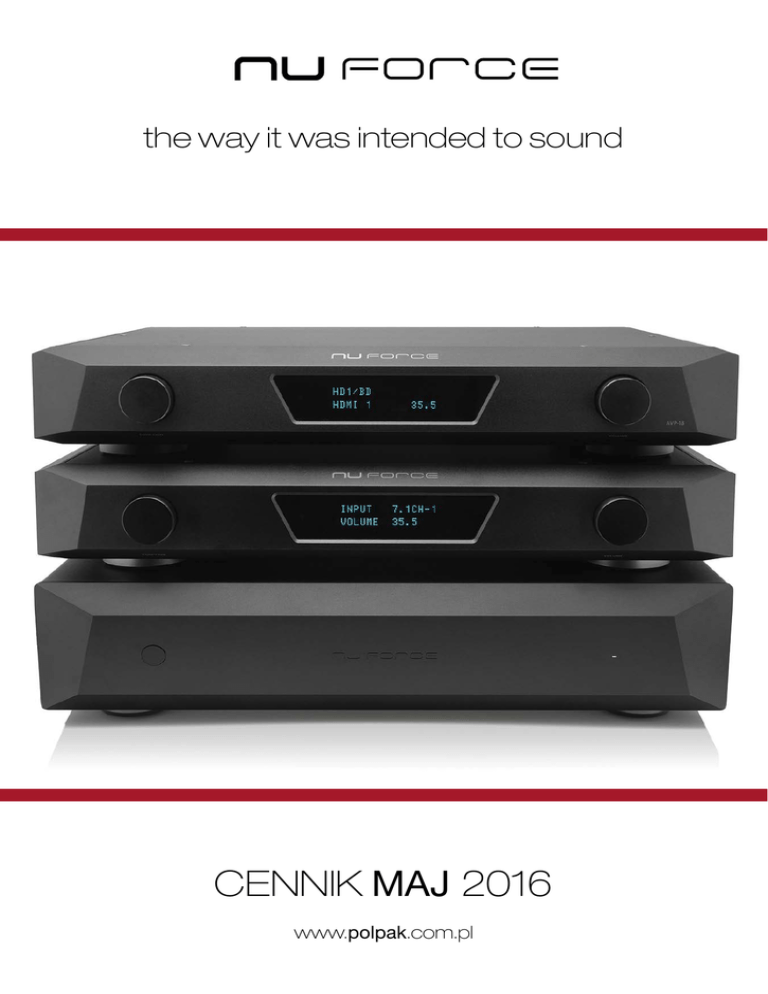 the way it was intended to sound CENNIK MAJ 2016 www.polpak.com.pl Końcówki mocy 8598 PLN MCA-20 MCA-20 jest wielokanałowym wzmacniaczem oferującym entuzjastom audio 8 kanałów dźwięku premium od NuForce. Zaprojektowany jako audiofilska alternatywa dla klasycznych wzmacniaczy oferowanych w zestawach kina domowego dla tych użytkowników, którzy myślą poważnie o dźwięku domowego systemu. Moc wyjściowa 278W x 8Ch @ 4 Ohm 150W x 8Ch @ 8 Ohm Szczytowa moc wyjściowa 352W x 8Ch @ 4 Ohm 187W x 8Ch @ 8 Ohm Zniekształcenia harmoniczne 0.01% Wejściowa impedancja 20 kOhm Wyjściowa impedancja 2.2 kOhm Wzmocnienie 26.5 dB Pasmo przenoszenia 10Hz - 50kHz Zużycie energii 1.6 W Napięcie wyjściowe 0dB, 1kHz: RCA 4.0Vrms Czułość 1.38 V Sygnał / Szum > 91 dB Wejścia 8 x RCA Wyjścia 8 x 5-drożne gniazda głośnikowe CENA DETALICZNA Szt. kolory: Czarny Wymiary (S x G x W) 432 x 340 x 90 mm Waga netto 11 kg / szt. 5598 PLN STA-200 Zaprojektowana dla purystów audio, 2-kanałowa końcówka mocy zapewnia referencyjnej jakości dźwięk zamknięty w pięknej metalowej obudowie. Pasujący do każdego wystroju wnętrza elegancki wygląd, a także niewielkie rozmiary sprawiają, że wzmacniacz może stać się zarówno dziełem sztuki wystawionym w widocznym miejscu lub zostać w ukryciu. Moc wyjściowa 80W x2Ch @ 8 Ohm Zniekształcenia harmoniczne <0.03% Wejściowa impedancja 51 kOhm Wyjściowa impedancja 30 mOhm Wzmocnienie 34.8dB Pasmo przenoszenia 20Hz - 80kHz Czułość 0.45Vrms Zużycie energii 1.57A Napięcie wyjściowe 0.6V Sygnał / Szum 100dB Wejścia RCA L + P Wyjścia 2 x 5-drożne gniazda głośnikowe CENA DETALICZNA Szt. kolory: Srebrny Wymiary (S x G x W) 355 x 224 x 87 mm Waga netto 6 kg / szt. 4298 PLN MCA-18 MCA-18 jest wielokanałowym wzmacniaczem oferującym entuzjastom audio 8 kanałów dźwięku premium od NuForce. Zaprojektowany jako audiofilska alternatywa dla klasycznych wzmacniaczy oferowanych w zestawach kina domowego dla tych użytkowników, którzy myślą poważnie o dźwięku domowego systemu. str. 1 Moc wyjściowa 110W x 8Ch @ 4 Ohm 55W x 8Ch @ 8 Ohm Szczytowa moc wyjściowa 150W x 8Ch @ 4 Ohm 80W x 8Ch @ 8 Ohm Zniekształcenia harmoniczne 0.01% Wejściowa impedancja 25 kOhm Wyjściowa impedancja 2.2 kOhm Wzmocnienie 23 dB Pasmo przenoszenia 10Hz - 50kHz Zużycie energii .44 W (Standby) 600W (Maximum) Napięcie wyjściowe 0dB, 1kHz: RCA 4.0Vrms Czułość 0.89 V Sygnał / Szum > 91 dB Wejścia 8 x RCA Wyjścia 8 x 5-drożne gniazda głośnikowe Cennik NuForce CENA DETALICZNA Szt. kolory: Czarny Wymiary (S x G x W) 432 x 341 x 80 mm Waga netto 6.7 kg / szt. Wzmacniacze 3438 PLN STA-120 Wzmacniacz / Końcówka mocy CENA DETALICZNA Szt. Audiofilskiej klasy układ zasilania, oraz duży toroidalny transformator zapewniają moc potrzebną do precyzyjnego wysterowania dowolnych głośników na satysfakcjonującym poziomie, bez wprowadzania dodatkowych szumów lub zniekształceń. Bardzo wydajna konstrukcja zużywa mniej energii, oraz generuje mniej ciepła zapewniając jednocześnie niezawodność i doskonałe właściwości ekologiczne. Moc wyjściowa 85W x2Ch@8 Ohm 1 25W x2Ch@4 Ohm Szczytowa moc wyjściowa 300W Zużycie energii 12W Stosunek Sygnał / Szum 115dB Zniekształcenia harmoniczne 0.008% Wejściowa impedancja 22 kOhm Wyjściowa impedancja 300 mOhm Wzmocnienie 25.5dB Pasmo przenoszenia 10Hz-40kHz Czułość 1Vrms Wejścia RCA L+P Wyjścia 2 x 5-drożne gniazda głośnikowe Zasilanie 115V/230V kolory: Czarny, Srebrny Wymiary (S x G x W) 215 x 320 x 50 mm Waga netto 3.5 kg / szt. 3240 PLN DDA-120 Wzmacniacz zintegrowany CENA DETALICZNA Szt. DDA120 stworzyliśmy z jednego prostego powodu: zapewnienia fantastycznej jakości dźwięku z dowolnego źródła audio. Niewielki rozmiar, oraz elegancki, stylowy wygląd skrywają zaawansowany technologicznie wzmacniacz zdolny odtworzyć każdy niuans i szczegół Twojej muzycznej kolekcji. DDA120 stworzyliśmy na podstawie wielokrotnie nagradzanego poprzednika DDA100. Moc wyjściowa 50W / kanał (8Ohm) 75W / kanał (4Ohm) Szczytowa moc wyjściowa 250W / kanał Zużycie energii 2W Typ połączeń 5-drożne terminale głośnikowe Max bit rate 176.4 Bit resolution 24 bit Wzmocnienie Cyfrowe 11.625dB Analogowe 31dB Próbkowanie USB 44.1,48,96kHz Pasmo przenoszenia 20Hz-20kHz, +/- 0.1dB Czułość Wejście cyfrowe 0dB Analogowe .047Vrms Wejścia Analogowe RCA, USB 2.0-B, S/PDIF koncentryczne 75Ohm, 2 x Toslink, 1 x USB-A dla odbiornika Bluetooth Wyjścia Toslink, 5 wyjść głośnikowych Stosunek sygnał/szum >95dB klasa-A Zasilanie 90-264V~ 50/60Hz 2.5A Wsparcie HD Audio 176.4/24 kolory: Czarny, Srebrny Wymiary (S x G x W) 241 x 216 x 51 mm Waga netto 1.2 kg / szt. 1740 PLN HA-200 Wzmacniacz słuchawkowy HA200 zaprojektowano tak, aby spełniał wymagania największych entuzjastów Moc wyjściowa 393mW @ 16 Ohm 747mW @ 32 Ohm audio. Umożliwia wysterowanie dowolnych słuchawek z dużą dozą 383mW @ 100 Ohm 129mW @ 300 Ohm szczegółowości, transparentnością oraz niuansami dźwięku. 70mW @ 600 Ohm HA200 zaprojektowano tak, aby spełniał wymagania największych entuzjastów audio. Umożliwia wysterowanie dowolnych słuchawek z dużą dozą szczegółowości, transparentnością oraz niuansami dźwięku. str. 2 Moc szczytowa 600mW @ 16 Ohm 937mW @ 32 Ohm 530mW @ 100 Ohm 180mW @ 300 Ohm 96.3mW @ 600 Ohm Wejściowa impedancja 22 kOhm Wyjściowa impedancja 5 Ohm Zalecana impedancja słuchawek 32 do 600 Ohm Pasmo przenoszenia 10Hz - 20KHz Sygnał / Szum >106dB Tryb zbalansowany 0.0005% Wejścia RCA L+P, pojedyncze XLR Wyjścia 6.3mm Stereo jack, pojedyncze XLR Zasilanie 115V/230V Cennik NuForce CENA DETALICZNA Szt. kolory: Czarny Wymiary (S x G x W) 217 x 231 x 44 mmWaga netto 2.2 kg / szt. Procesory AV 5080 PLN AVP-18 AVP-18 skupia się na jak najlepszej jakości dźwięku. Dostępne tylko cyfrowe wejścia zapewniają najczystsze audio wykorzystując tę samą technologię co najlepsze przetworniki C/A, AVP-18 został z