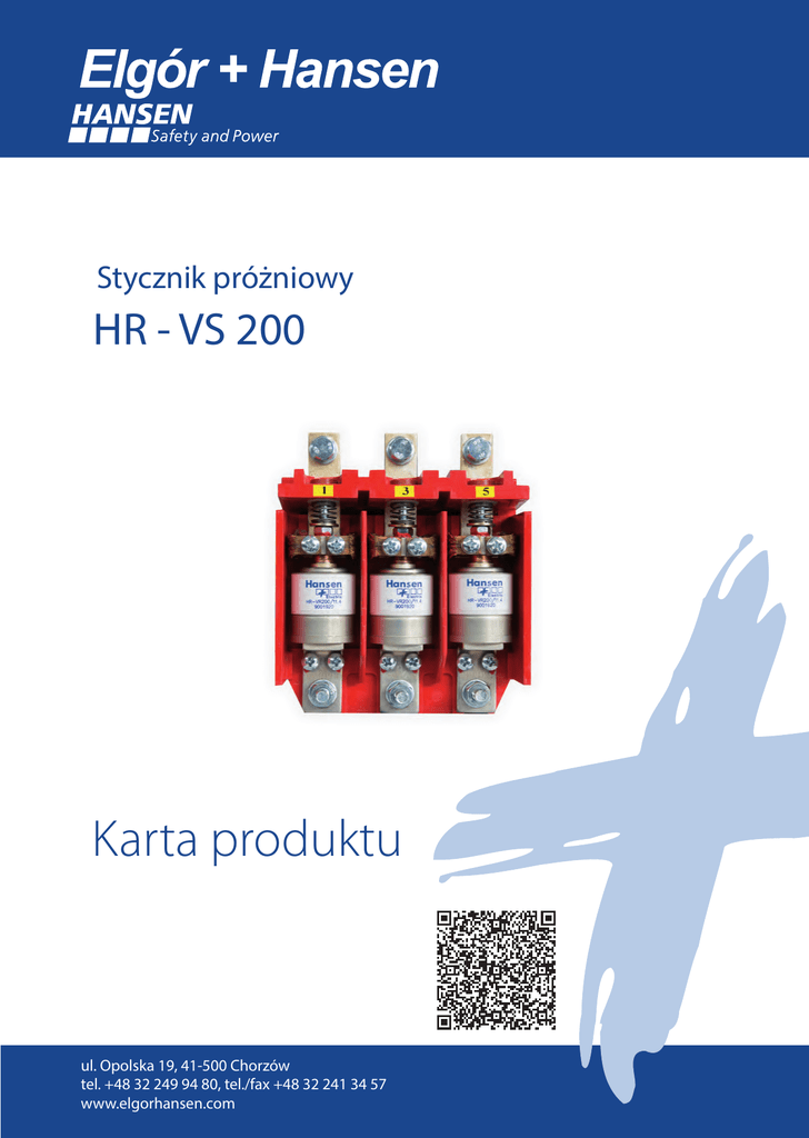 Stycznik próżniowy HR - VS 200 Karta produktu ul. Opolska 19, 41-500 Chorzów tel. +48 32 249 94 80, tel./fax +48 32 241 34 57 www.elgorhansen.com Stycznik próżniowy HR - VS 200 CECHY CHARAKTERYSTYCZNE • • • • • duża trwałość mechaniczna i łączeniowa minimalne wymagania konserwacyjne przez cały okres użytkowania zwarta konstrukcja i niewielkie gabaryty minimalny pobór mocy w stanie zamkniętym wysokie bezpieczeństwo dla środowiska. BUDOWA Stycznik próżniowy typu HR - VS 200 jest łącznikiem manewrowym przeznaczonym do stosowania w trudnych warunkach środowiskowych. Trzy jednotorowe komory próżniowe sterowane napędem elektromagnetycznym zapewniają dużą częstość łączeń również w kategorii AC 4. Minimalne wymagania dotyczące konserwacji umożliwiają stosowanie stycznika w obwodach specjalnych stosowanych w przemyśle o szczególnych wymaganiach eksploatacyjnych np.: chemia, górnictwo. DANE TECHNICZNE Napięcie łączeniowe 1000V Częstotliwość 50 Hz Prąd : cieplny 200A - łączeniowy 200A - załączeniowy 2400A - wyłączeniowy 2000A - krótkotrwały 3200A - szczytowy wytrzymywany 16000A Zwarciowa zdolność łączeniowa 4000A; cosφ =0,4 Częstość łączeń 1200 cykli/h Kategoria użytkowania AC 1-AC 4 Trwałość mechaniczna 1x106 cykli Napięcie izolacji (obwodów pomocniczych) Napięcie zasilania napędu 250V 220V ;50Hz SCHEMAT ul. Opolska 19, 41-500 Chorzów tel. +48 32 249 94 80, tel./fax +48 32 241 34 57 www.elgorhansen.com