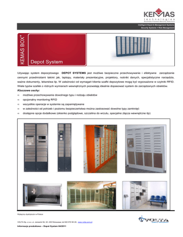 Intelligent Depot & Management Systems Security Systems Risk Management Używając system depozytowego DEPOT SYSTEMS jest możliwe bezpieczne przechowywanie i efektywne zarządzanie cennymi przedmiotami takimi jak, laptopy, materiały prezentacyjne, projektory, nośniki danych, specjalistyczne narzędzia, ważne dokumenty, lekarstwa itp. W zależności od wymagań klienta szafki depozytowe mogą być wyposażone w czytniki RFID. Wiele typów szafek o różnych wymiarach wewnętrznych pozwalają idealnie dopasować system do zarządzanych obiektów. Kluczowe cechy: • możliwe przechowywanie dowolnego typu i rodzaju obiektów • opcjonalny monitoring RFID • wszystkie operacje w systemie są zapamiętywane • w zależności od potrzeb i poziomu bezpieczeństwa można zastosować dowolne typy zamknięć • dostępne opcje dodatkowe (okienko podglądowe, szczelina do wrzutu, specjalne złącza wewnętrzne itp) Wyłączny dystrybutor w Polsce: VOLTA Sp. z o.o. ul. Jutrzenki 94, 02 -230 Warszawa; tel 022 572 90 20; www.volta.com.pl Informacja produktowa – Depot System 04/2011 Intelligent Depot & Management Systems Security Systems Risk Management Dostępne modele i ich wymiary: Lp. Model Ilość depozytów 90 1 FS large 16-90 (S) 16 (12) 2 FS large 14-90 (S) 14 (10) 3 FS large 8-200 (S) 4 FS large 4-420 (S) 5 FS large Mix (S) 6 FS large 4-310/1-420 7 FS large 640 / 420 / 3-200 8 FS small 16-90 (S) 16 (12) 14 (10) 115 200 310 Wys xSzer x Gł 420 530 640 1990 x 450 x 450 mm 1990 x 450 x 450 mm 8 (6) 1990 x 450 x 450 mm 4 (3) 2 (1) 2 (2) 1990 x 450 x 450 mm 2 (1) 1 (1) 1990 x 450 x 450 mm 4 1 1990 x 450 x 450 mm 3 1 1 1990 x 450 x 450 mm 1990 x 254 x 280 mm 9 FS small 14-90 (S) 10 FS small 12-115 (S) 12 (9) 1990 x 254 x 280 mm 1990 x 254 x 280 mm 11 FS small 10-115 (S) 10 (7) 1990 x 254 x 280 mm 12 FS small 3-530 3 1990 x 254 x 280 mm (S) Moduł główny do zabudowania kontrolera 1 [ Moduł stojący, szeroki: WxSxG = 1990 x 450 x 450 mm [ Szafka depozytowa, duża: SxG = 350 x 420 mm [ Moduł stojący, wąski: WxSxG = 1990 x 254 x 280 mm [ Szafka depozytowa, mała: SxG = 155 x 270 mm [ Dostępne wysokości szafek: 90 / 115 / 200 / 310 / 420 mm 4 8 Wyłączny dystrybutor w Polsce: VOLTA Sp. z o.o. ul. Jutrzenki 94, 02 -230 Warszawa; tel 022 572 90 20; www.volta.com.pl Informacja produktowa – Depot System 04/2011 2 3 5 9 6 10 11 12 Intelligent Depot & Management Systems Security Systems Risk Management Dane Techniczne: Charakterystyka: Obiekt: Kontroler: Płyta z procesorem i niulotną pamięcią Obiekty różne, klucze i pęki kluczy Bufor zdarzeń z 3000 wpisów Wymiary modułu: 1990 x 254 x 280 mm Możliwe zarządzanie do 512 depozytów Waga: mały 90 kg / duży ok. 120 kg Komunikacja LAN (TCP/IP) Warunki środowiskowe: Możliwa praca Offline Zastosowanie wewnętrzne Bezpieczeństwo: Temperatura: +5°C - +45°C Identyfikacja użytkownika: Wilgotność: < 95%, bez kondensacji Odporność pożarowa: Zgodne z normą DIN EN 60950 / wszystkie komponenty wewnętrzne Klasa V-1 PIN ♦ ID / card (ISO 7810 ID-1)♦ chip ♦ biometria Mechanicznie zwalniana blokada bezpieczeństwa: Pełen monitoring depozytów (waga do 1kg); obudowa zgodną z klasą 5V Alarm główny Obwody elektryczne: Inne cechy i funkcje: Klasa ochrony 1, IP 41 Wersje montażu naściennego lub wolnostojącego Napięcie zasilania: 110-230V Tolerancja zasilania: -15% do +10% Zamek elektryczny lub elektromagnetyczny Dzwiczki i panel przedni ze stali nierdzewnej Częstotliwość: 40Hz do 60Hz Różne kolory lakierowania korpusu – paleta RAL Pobór prądu: 200W (max.) Sygnały alarmowe: Podwójne drzwiczki (wersja szeroka) Opcje dodatkowe: Prace serwisowe Utrata zasilania Utrata komunikacji Zasilanie: 12V/DC max. z akumulatorem buforowym do 130Ah Monitoring RFID Sygnalizacja diodą LED o zawartości szafki (ok, pusta, nieprawidłowa Inspekcja Awaryjne otwarcie Rozdzielenie modułów Kamera włączona/wyłączona (opcja) zawartość) Okienko do wpisywania numerów lub oznaczeń depozytów Okienko podglądowe Szczelina wrzutowa Utrata depozytu (opcja) Zintegrowane gniazdo zasilania Otwarcie szafki (opcja) Wewnętrzny kable sieci LAN Zintegrowane gniazdo do ładowania urządzeń przenośnych Wyłączny dystrybutor w Polsce: VOLTA Sp. z o.o. ul. Jutrzenki 94, 02 -230 Warszawa; tel 022 572 90 20; www.volta.com.pl Informacja produktowa – Depot System 04/2011