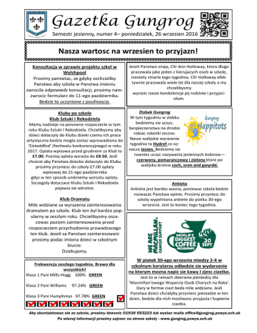 Gazetka Gungrog Semestr jesienny, numer 4– poniedzialek, 26 wrzesien 2016 Nasza wartosc na wrzesien to przyjazn! Konsultacja w sprawie projektu szkol w Welshpool Prosimy pamietac, ze gdyby zechcieliby Panstwo aby szkola w Panstwa imieniu zwrocila odpowiedz konsultacji, prosimy namzwrocic formularz do 11-ego pazdziernika. Bedzie to uczynione z poufnoscia. Kluby po szkole Klub Sztuki I Rekodziela Mamy nadzieje na ponowne rozpoczecie w tym roku Klubu Sztuki I Rekodziela. Chcielibysmy aby dzieci dolaczyly do Klubu dzieki czemu ich praca artystyczna bedzie mogla zostac wprowadzona do ‘Eisteddfod’ (festiwalu konkurencyjnego) w roku 2017. Oplata wpisowa przed grudniem za Klub to £7.00. Pozniej oplata wzrasta do £8.50. Jesli chcecie aby Panstwa dziecko dolaczylo do Klubu prosimy przyniesc do szkoly £7.00 oplaty wpisowej do 21-ego pazdziernika gdyz w ten sposob unikniemy wzrostu oplaty. Szczegoly dotyczace Klubu Sztuki I Rekodziela pojawia sie wkrotce. Klub Dramatu Mile widziane sa wyrazenia zainteresowania dramatem po szkole. Klub ten byl bardzo popularny w zeszlym roku. Chcielibysmy oszacowac poziom zainteresowania przed rozpoczeciem przychodzenia prowadzacego ten klub. Jezeli sa Panstwo zainteresowani prosimy podac imiona dzieci w szkolnym biurze. Dziekujemy. Frekwencja zeszlego tygodnia. Brawo dla wszystkich! Klasa 1 Pani Mills-Hogg 100% GREEN Klasa 2 Pani Williams 97.24% GREEN Klasa 3 Pani Humphreys 97.78% GREEN Jezeli Panstwo znaja, Cllr Ann Holloway, ktora dlugo pracowala jako jeden z kierujacych osob w szkole, niestety zmarla tego tygodnia. Cllr Holloway efektywnie pracowala wiele lat dla naszej szkoly a my chcielibysmy wyrazic nasze kondolencje jej rodzinie i przyjaciolom. Zlobek Gungrog W tym tygodniu w zlobku bedziemy sie uczyc, bezpieczenstwa na drodze robiac robotki reczne. Nasze walijskie wyrazenie tygodnia to Hydref co oznacza Jesien. Bedziemy sie rowniez uczyc nazywania jesiennych kolorow— czerwony, pomaranczowy i zielony ktore po walijsku brzmia coch, oren and gwyrdd. Ankieta Ankieta jest bardzo wazna, poniewaz szkola bedzie rozwazac Panstwa opinie. Prosimy przyniesc do szkoly wypelniona ankiete do piatku 30-ego wrzesnia. Jest to koniec tego tygodnia. W piatek 30-ego wrzesnia miedzy 2-4 w szkolnym korytarzu odbedzie sie wydarzenie na ktorym mozna napic sie kawy I zjesc ciastko. Jest to w ramach zbierania pieniedzy dla ’Macmillan’owego Wsparcia Osob Chorych na Raka’. Dary w formie ciast beda mile widziane. Jesli Panstwa dzieci chcialyby przyniesc pieniadze w ten dzien, bedzie dla nich mozliwosc przyjscia I kupienia ciastka. Aby skontaktowac sie ze szkola, prosimy dzwonic 01938 553223 lub wyslac maila [email protected] Po wiecej informacji prosimy zajrzec na strone szkoly - www.gungrog.powys.sch.uk