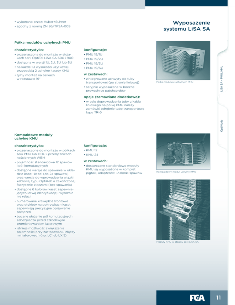 ĆŘwykonano przez: Huber+Suhner Wyposażenie systemu LiSA SA ĆŘzgodny z normą ZN 96/TPSA-009 Półka modułów uchylnych PMU charakterystyka: konfiguracje: ĆŘprzeznaczona do montażu w stojakach serii OptiTel LiSA SA 600 i 900 ĆŘPMU 19/1U ĆŘdostępna w wersji 1U, 2U, 3U lub 6U ĆŘPMU 19/3U ĆŘtylny montaż na belkach w rozstawie 19" ĆŘPMU 19/6U w zestawach: ĆŘzintegrowane uchwyty do tuby transportowej (po stronie liniowej) Półka modułów uchylnych PMU ĆŘseryjnie wyposażone w boczne prowadnice patchcordów LiSA SA – PMU, KMU ĆŘna każde 1U wysokości użytkowej przypadają 2 uchylne kasety KMU ĆŘPMU 19/2U opcje (zamawiane dodatkowo): OptiNode ĆŘw celu doprowadzenia tuby z kabla liniowego na półkę PMU należy zamówić odrębnie tubę transportową typu TR-5 Kompaktowe moduły uchylne KMU charakterystyka: konfiguracje: ĆŘprzeznaczone do montażu w półkach serii PMU lub ODU i przełącznicach naściennych WBH ĆŘKMU 12 ĆŘpojemność standardowa 12 spawów i pól komutacyjnych ĆŘdostępne wersje do spawania w układzie kabel–kabel (do 24 spawów) oraz wersja do wprowadzenia wiązki kablowej typu OptiKab a zakończonej fabrycznie złączami (bez spawania) ĆŘKMU 24 w zestawach: ĆŘdostarczane standardowo moduły KMU są wyposażone w komplet pigtaili, adapterów i osłonki spawów Kompaktowy moduł uchylny KMU ĆŘdostępne 6 kolorów kaset zapewniających łatwą identyfikację i wyróżnienie relacji ĆŘnumerowane krawędzie frontowe oraz etykiety na pokrywkach kaset zapewniają precyzyjne opisywanie połączeń ĆŘboczne ułożenie pól komutacyjnych zabezpiecza przed szkodliwym promieniowaniem laserowym ĆŘistnieje możliwość zwiększenia pojemności przy zastosowaniu złączy miniaturowych (np. LC lub LX.5) Moduły KMU w stojaku serii LiSA SA 11