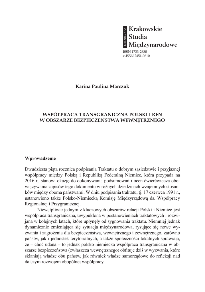 XIII: 2016 nr 2 ISSN 1733-2680 e-ISSN 2451-0610 Karina Paulina Marczuk WSPÓŁPRACA TRANSGRANICZNA POLSKI I RFN W OBSZARZE BEZPIECZEŃSTWA WEWNĘTRZNEGO Wprowadzenie Dwudziesta piąta rocznica podpisania Traktatu o dobrym sąsiedztwie i przyjaznej współpracy między Polską i Republiką Federalną Niemiec, która przypada na 2016 r., stanowi okazję do dokonywania podsumowań i ocen ćwierćwiecza obowiązywania zapisów tego dokumentu w różnych dziedzinach wzajemnych stosunków między oboma państwami. W dniu podpisania traktatu, tj. 17 czerwca 1991 r., ustanowiono także Polsko-Niemiecką Komisję Międzyrządową ds. Współpracy Regionalnej i Przygranicznej. Niewątpliwie jednym z kluczowych obszarów relacji Polski i Niemiec jest współpraca transgraniczna, uwypuklona w postanowieniach traktatowych i rozwijana w kolejnych latach, które upłynęły od sygnowania traktatu. Niemniej jednak dynamicznie zmieniająca się sytuacja międzynarodowa, rysujące się nowe wyzwania i zagrożenia dla bezpieczeństwa, wewnętrznego i zewnętrznego, zarówno państw, jak i jednostek terytorialnych, a także społeczności lokalnych sprawiają, że – choć udana – to jednak polsko-niemiecka współpraca transgraniczna w obszarze bezpieczeństwa (zwłaszcza wewnętrznego) obfituje dziś w wyzwania, które skłaniają władze obu państw, jak również władze samorządowe do refleksji nad dalszym rozwojem obopólnej współpracy. 94 KARINA PAULINA MARCZUK Tematem artykułu jest współpraca transgraniczna między Polską i RFN w dziedzinie bezpieczeństwa wewnętrznego, czyli na poziomie lokalnym, od momentu podpisania traktatu z 1991 r. oraz wyzwania dla niej w czasach współczesnych. Założono – biorąc pod uwagę rozwój sytuacji międzynarodowej – że głównym polem wyzwań w ramach współpracy transgranicznej Polski i Niemiec jest obszar zapewniania bezpieczeństwa wewnętrznego na szczeblu społeczności lokalnych. Na potrzeby prowadzonych badań przyjęto szerokie rozumienie bezpieczeństwa wewnętrznego – jako ochrony przed zagrożeniami nie tylko wnętrza państwa, lecz także społeczeństwa (tu – społeczności lokalnej) „[…] w warunkach poszanowania prawa i wolności obywatelskich […], a także [pojmuje się je] jako zdolność państwa do zachowania stabilności ustrojowo-politycznej oraz zapewnienia bezpieczeństwa publicznego i porządku publicznego”1. Pytania badawcze, na które szukano odpowiedzi, dotyczą, po pierwsze, podstaw prawnych i obszarów dotychczasowej współpracy transgranicznej Polski i RFN, po drugie – obecnych wyzwań w tym zakresie. W pracy posłużono się w głównej mierze analizą dokumentów i materiałów źródłowych. Artykuł kończy zwięzłe zestawienie wniosków. Podstawy prawne i obszary współpracy transgranicznej Polski i RFN Z prawnego punktu widzenia współpracę transgraniczną Polski i RFN na początku lat 90. XX w. umożliwiły zwłaszcza dwa akty prawne, które władze Polski sygnowały w pierwszych latach po zmianie systemowej. Pierwszym z tych dokumentów była Europejska konwencja ramowa o współpracy transgranicznej między wspólnotami i władzami terytorialnymi podpisana w Madrycie w maju 1980 r. Polska przystąpiła do niej w 1993 r. Drugim dokumentem był podpisany 17 czerwca 1991 r. Traktat między Rzecząpospolitą Polską a Republiką Federalną Niemiec o dobrym sąsiedztwie i przyjaznej współpracy. W dalszej kolejności – chronologicznie – należy wymienić zapisy ustawy zasadniczej Polski. Przyjęta w 1997 r. (już po ratyfikacji powyższych dokumentów) konstytucja w art. 172 pkt 2 głosi, że „Jednostka samorządu terytorialnego ma prawo przystępowania do międzynarodowych zrzeszeń społeczności lokalnych i regionalnych oraz współpracy ze społecznościami lokalnymi i regionalnymi innych państw”2. Zapis otwiera zatem możliwość zawierania partnerskich inicjatyw z zagranicznymi władzami lokalnymi. Należy także odnotować znaczenie dla umożliwienia współpracy transgranicznej zmian związanych z decentralizacją administracji K.P. Marczuk, Bezpieczeństwo wewnętrzne państw członkowskich Unii Europejskiej: od bezpieczeństwa państwa do bezpieczeństwa ludzi, Warszawa 2012, s. 50. 2 Konstytucja Rzeczypospolitej Polskiej z dnia 2 kwietnia 1997 r. uchwalona przez Zgromadzenie Narodowe w dniu 2 kwietnia 1997 r., przyjęta przez Naród w referendum konstytucyjnym w dniu 25 maja 1997 r., podpisana przez Prezydenta Rzeczypospolitej Polskiej w dniu 16 lipca 1997 r., Dz.U. 1997, nr 78, poz. 483. 1 WSPÓŁPRACA TRANSGRANICZNA POLSKI I RFN... 95 w Polsce oraz wprowadzeniem trójpodziału administracyjnego. Z kolei w konstytucji Niemiec zastrzega się, że za stosunki z państwami trzecimi odpowiadają władze federalne, jakkolwiek za ich zgodą także władze krajów związkowych mogą zawierać umowy z innymi państwami3. Kluczowe dla rozwoju współpracy transgranicznej Polski i Niemiec są zapisy traktatu z 1991 r. Traktat w art. 12 z jednej strony postulował pogłębianie i rozwój dwustronnych relacji w zakresie współpracy transgranicznej obu państw w różnych sferach. Z drugiej strony twórcy traktatu położyli nacisk na dwustronną współpracę w kwestiach związanych z zapewnianiem bezpieczeństwa wewnętrznego. Trzeba pamiętać, że traktat był przygotowywany na początku lat 90. XX w., gdy problematyka bezpieczeństwa wewnętrznego nie była jeszcze języczkiem u wagi dla rządów państw europejskich. Biorąc to pod uwagę, można wskazać kilka priorytetowych obszarów transgranicznej współpracy polsko-niemieckiej. Po pierwsze, przewidziano współpracę zwłaszcza przygranicznych jednostek terytorialnych obu państw w różnych dziedzinach (art. 12): 1. Umawiające się Strony przywiązują duże znaczenie do partnerskiej współpracy między regionami, miastami, gminami i innymi jednostkami terytorialnymi, w szczególności na obszarach przygranicznych. 2. U