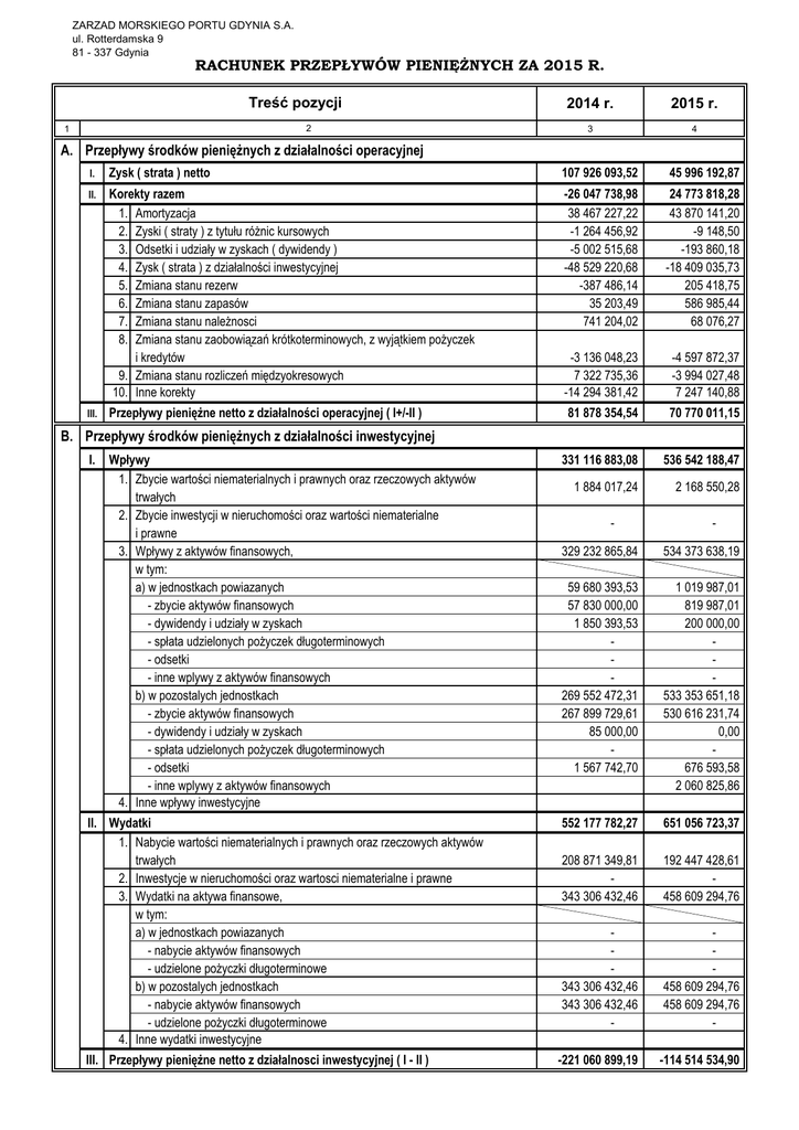 ZARZAD MORSKIEGO PORTU GDYNIA S.A. ul. Rotterdamska 9 81 - 337 Gdynia RACHUNEK PRZEPŁYWÓW PIENIĘŻNYCH ZA 2015 R. Treść pozycji 2 1 2014 r. 2015 r. 3 4 A. Przepływy środków pieniężnych z działalności operacyjnej I. Zysk ( strata ) netto 107 926 093,52 45 996 192,87 II. Korekty razem 1. Amortyzacja 2. Zyski ( straty ) z tytułu różnic kursowych 3. Odsetki i udziały w zyskach ( dywidendy ) 4. Zysk ( strata ) z działalności inwestycyjnej 5. Zmiana stanu rezerw 6. Zmiana stanu zapasów 7. Zmiana stanu należnosci 8. Zmiana stanu zaobowiązań krótkoterminowych, z wyjątkiem pożyczek i kredytów 9. Zmiana stanu rozliczeń międzyokresowych 10. Inne korekty -26 047 738,98 38 467 227,22 -1 264 456,92 -5 002 515,68 -48 529 220,68 -387 486,14 35 203,49 741 204,02 24 773 818,28 43 870 141,20 -9 148,50 -193 860,18 -18 409 035,73 205 418,75 586 985,44 68 076,27 -3 136 048,23 7 322 735,36 -14 294 381,42 -4 597 872,37 -3 994 027,48 7 247 140,88 Przepływy pieniężne netto z działalności operacyjnej ( I+/-II ) 81 878 354,54 70 770 011,15 331 116 883,08 536 542 188,47 1 884 017,24 2 168 550,28 III. B. Przepływy środków pieniężnych z działalności inwestycyjnej I. Wpływy 1. Zbycie wartości niematerialnych i prawnych oraz rzeczowych aktywów trwałych 2. Zbycie inwestycji w nieruchomości oraz wartości niematerialne i prawne 3. Wpływy z aktywów finansowych, w tym: a) w jednostkach powiazanych - zbycie aktywów finansowych - dywidendy i udziały w zyskach - spłata udzielonych pożyczek długoterminowych - odsetki - inne wplywy z aktywów finansowych b) w pozostalych jednostkach - zbycie aktywów finansowych - dywidendy i udziały w zyskach - spłata udzielonych pożyczek długoterminowych - odsetki - inne wplywy z aktywów finansowych 4. Inne wpływy inwestycyjne II. Wydatki 1. Nabycie wartości niematerialnych i prawnych oraz rzeczowych aktywów trwałych 2. Inwestycje w nieruchomości oraz wartosci niematerialne i prawne 3. Wydatki na aktywa finansowe, w tym: a) w jednostkach powiazanych - nabycie aktywów finansowych - udzielone pożyczki długoterminowe b) w pozostalych jednostkach - nabycie aktywów finansowych - udzielone pożyczki długoterminowe 4. Inne wydatki inwestycyjne III. Przepływy pieniężne netto z działalnosci inwestycyjnej ( I - II ) - - 329 232 865,84 534 373 638,19 59 680 393,53 57 830 000,00 1 850 393,53 269 552 472,31 267 899 729,61 85 000,00 1 567 742,70 1 019 987,01 819 987,01 200 000,00 533 353 651,18 530 616 231,74 0,00 676 593,58 2 060 825,86 552 177 782,27 651 056 723,37 208 871 349,81 343 306 432,46 192 447 428,61 458 609 294,76 343 306 432,46 343 306 432,46 - 458 609 294,76 458 609 294,76 - -221 060 899,19 -114 514 534,90 ZARZAD MORSKIEGO PORTU GDYNIA S.A. ul. Rotterdamska 9 81 - 337 Gdynia RACHUNEK PRZEPŁYWÓW PIENIĘŻNYCH ZA 2014 R. Treść pozycji 2014 r. 2015 r. 3 4 2 1 C. Przepływy środków pieniężnych z działalności finansowej I. II. Wpływy 1. Wpływy netto z wydania udziałów ( emisji akcji ) i innych instrumentów kapitałowych oraz dopłat do kapitału 2. Kredyty i pożyczki 3. Emisja dłużnych papierów wartościowych 4. Inne wpływy finansowe 136 132 703,93 78 043 118,06 136 132 703,93 78 043 118,06 608 240,75 0,00 Wydatki 1. Nabycie udziałów ( akcji ) własnych 2. Dywidendy i inne wypłaty na rzecz właścicieli 3. Inne niż wypłaty na rzecz właścicieli, wydatki z tytułu podziału zysku 4. Spłaty kredytów i pożyczek 5. Wykup dłużnych papierów wartościowych 6. Wydatki z tytułu innych zobowiązań finansowych 7. Płatności zobowiązań z tytułu umow leasingu finansowego 8. Odsetki 9. Inne wydatki finansowe III. Przepływy pieniężne netto z działalnosci finansowej ( I - II ) 608 240,75 - 135 524 463,18 78 043 118,06 D. Przepływy pieniężne netto razem ( A.III+/-B.III+/-C.III ) -3 658 081,47 34 298 594,31 E. Bilansowa zmiana stanu środków pieniężnych, -2 189 958,52 33 361 967,72 -31 256,50 -250 276,75 101 696 462,10 98 038 380,63 98 038 380,63 132 336 974,94 244 993,83 221 574,80 w tym: - zmiana stanu środków pieniężnych z tytułu różnic kursowych F. Środki pieniężne na początek okresu G. Środki pieniężne na koniec okresu ( F+/-D ), w tym: - o ograniczonej możliwości dysponowania Gdynia, 26.02.2016 r. GŁÓWNY KSIĘGOWY WICEPREZES ZARZĄDU Helena Mrula Krystyna Szambelańczyk WICEPREZES ZARZĄDU Walery Tankiewicz PREZES ZARZĄDU Janusz Jarosiński