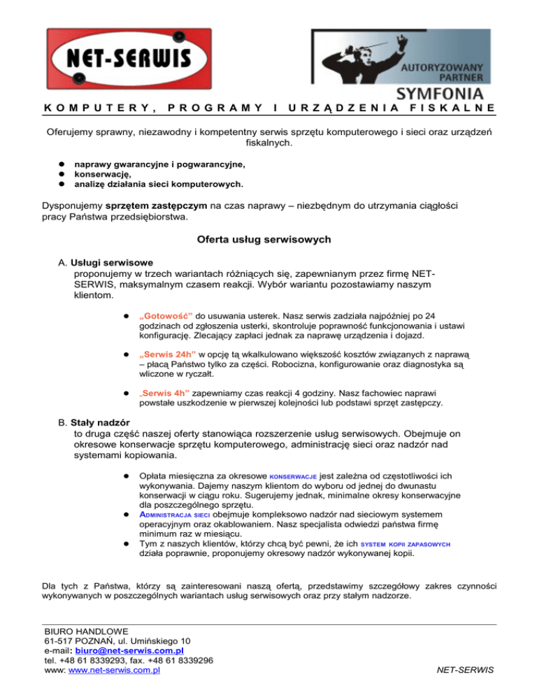 K O MP U T E R Y , P R O G R AM Y I U R Z ĄD Z E N I A FI S K AL N E Oferujemy sprawny, niezawodny i kompetentny serwis sprzętu komputerowego i sieci oraz urządzeń fiskalnych. naprawy gwarancyjne i pogwarancyjne, konserwację, analizę działania sieci komputerowych. Dysponujemy sprzętem zastępczym na czas naprawy – niezbędnym do utrzymania ciągłości pracy Państwa przedsiębiorstwa. Oferta usług serwisowych A. Usługi serwisowe proponujemy w trzech wariantach różniących się, zapewnianym przez firmę NETSERWIS, maksymalnym czasem reakcji. Wybór wariantu pozostawiamy naszym klientom. „Gotowość” do usuwania usterek. Nasz serwis zadziała najpóźniej po 24 godzinach od zgłoszenia usterki, skontroluje poprawność funkcjonowania i ustawi konfigurację. Zlecający zapłaci jednak za naprawę urządzenia i dojazd. „Serwis 24h” w opcję tą wkalkulowano większość kosztów związanych z naprawą – płacą Państwo tylko za części. Robocizna, konfigurowanie oraz diagnostyka są wliczone w ryczałt. „Serwis 4h” zapewniamy czas reakcji 4 godziny. Nasz fachowiec naprawi powstałe uszkodzenie w pierwszej kolejności lub podstawi sprzęt zastępczy. B. Stały nadzór to druga część naszej oferty stanowiąca rozszerzenie usług serwisowych. Obejmuje on okresowe konserwacje sprzętu komputerowego, administrację sieci oraz nadzór nad systemami kopiowania. Opłata miesięczna za okresowe KONSERWACJE jest zależna od częstotliwości ich wykonywania. Dajemy naszym klientom do wyboru od jednej do dwunastu konserwacji w ciągu roku. Sugerujemy jednak, minimalne okresy konserwacyjne dla poszczególnego sprzętu. ADMINISTRACJA SIECI obejmuje kompleksowo nadzór nad sieciowym systemem operacyjnym oraz okablowaniem. Nasz specjalista odwiedzi państwa firmę minimum raz w miesiącu. Tym z naszych klientów, którzy chcą być pewni, że ich SYSTEM KOPII ZAPASOWYCH działa poprawnie, proponujemy okresowy nadzór wykonywanej kopii. Dla tych z Państwa, którzy są zainteresowani naszą ofertą, przedstawimy szczegółowy zakres czynności wykonywanych w poszczególnych wariantach usług serwisowych oraz przy stałym nadzorze. BIURO HANDLOWE 61-517 POZNAŃ, ul. Umińskiego 10 e-mail: [email protected] tel. +48 61 8339293, fax. +48 61 8339296 www: www.net-serwis.com.pl NET-SERWIS