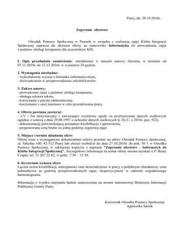 Psary, dn. 20.10.2016r. Zapytanie ofertowe Ośrodek Pomocy Społecznej w Psarach w związku z realizacją zajęć Klubu Integracji Społecznej zaprasza do złożenia oferty na stanowisko Informatyka do prowadzenia zajęć z podstaw obsługi komputera dla uczestników KIS. I. Opis przedmiotu zamówienia: zatrudnienie w ramach umowy zlecenia, w terminie od 07.11.2016r. do 12.12.2016r. w wymiarze 24 godzin. 2. Wymagania niezbędne: - wykształcenie wyższe o kierunku informatycznym, - doświadczenie w przeprowadzaniu szkoleń/kursów. 3. Zakres umowy: - prowadzenie zajęć z podstaw obsługi komputera, - obsługa edytora tekstu, - korzystanie z poczty elektronicznej, - korzystanie z sieci internetu w celu poszukiwania pracy. 4. Oferta powinna zawierać: - CV i list motywacyjny ( zawierające wyrażenie zgody na przetwarzanie danych osobowych zgodnie z ustawą z dnia 29.08.1997 o ochronie danych osobowych tj. Dz.U. z 2016r. poz. 922), - dokumentację potwierdzającą posiadane kwalifikacje i uprawnienia, - proponowaną cenę brutto za jedną godzinę zegarową zajęć. 5. Miejsce i termin składania ofert: Ofertę wraz z wymaganymi dokumentami należy przesłać na adres: Ośrodek Pomocy Społecznej, ul. Szkolna 100, 42-512 Psary lub złożyć osobiście do dnia 27.10.2016r. do pok. Nr 1 w Ośrodku Pomocy Społecznej, w zaklejonej kopercie z napisem "Zapytanie ofertowe – Informatyk do Klubu Integracji Społecznej". Szczegółowe informacje na temat oferty można uzyskać u P. Beaty Czapla, tel. 32 267 22 62, w godz. 7:30 – 15:30. 6. Kryterium wyboru ofert: Łączna ocena kwalifikacji, umiejętności oraz doświadczenie w pracy o podobnym charakterze, cena jednostkowa za godzinę przeprowadzonych zajęć, dyspozycyjność w zakresie uzgodnionego harmonogramu. Informacja o wyniku zapytania będzie umieszczona na stronie internetowej Biuletynu Informacji Publicznej Gminy Psary. Kierownik Ośrodka Pomocy Społecznej Agnieszka Sarnik