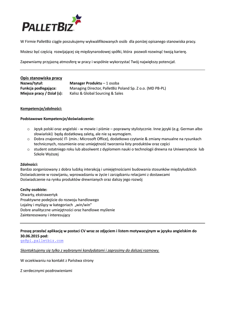 W Firmie PalletBiz ciągle poszukujemy wykwalifikowanych osób dla poniżej opisanego stanowiska pracy. Możesz być częścią rozwijającej się międzynarodowej spółki, która pozwoli rozwinąć twoją karierę. Zapewniamy przyjazną atmosferę w pracy i wspólnie wykorzystać Twój największy potencjał. Opis stanowiska pracy Nazwa/tytuł: Funkcja podlegająca: Miejsce pracy / Dział (s): Manager Produktu – 1 osoba Managing Director, PalletBiz Poland Sp. Z o.o. (MD PB-PL) Kalisz & Global Sourcing & Sales Kompetencje/zdolności: Podstawowe Kompetencje/doświadczenie: o o o Język polski oraz angielski - w mowie i piśmie – poprawny stylistycznie. Inne języki (e.g. German albo słowiański) będą dodatkową zaletą, ale nie są wymogiem. Dobra znajomość IT- (min.: Microsoft Office), dodatkowo czytanie & zmiany manualne na rysunkach technicznych, rozumienie oraz umiejętność tworzenia listy produktów oraz części student ostatniego roku lub absolwent z dyplomem nauki o technologii drewna na Uniwersytecie lub Szkole Wyższej Zdolności: Bardzo zorganizowany z dobra ludzką interakcją i umiejętnościami budowania stosunków międzyludzkich Doświadczenie w rozwijaniu, wprowadzaniu w życie i zarządzaniu relacjami z dostawcami Doświadczenie na rynku produktów drewnianych oraz dalszy jego rozwój Cechy osobiste: Otwarty, ekstrawertyk Proaktywne podejście do rozwoju handlowego Lojalny i myślący w kategoriach „win/win" Dobre analityczne umiejętności oraz handlowe myślenie Zainteresowany i interesujący Proszę przesłać aplikację w postaci CV wraz ze zdjęciem i listem motywacyjnym w języku angielskim do 30.06.2015 pod: [email protected] Skontaktujemy się tylko z wybranymi kandydatami i zaprosimy do dalszej rozmowy. W oczekiwaniu na kontakt z Państwa strony Z serdecznymi pozdrowieniami