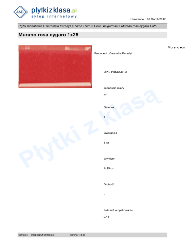 Utworzono : 08 March 2017 Płytki łazienkowe > Ceramika Paradyż > Hiroe / Hiro > Hiroe beige/rosa > Murano rosa cygaro 1x25 Murano rosa cygaro 1x25 Murano ros Producent : Ceramika Paradyż OPIS PRODUKTU ą s la Jednostka miary szt Gatunek k z 1 i tk y ł P Gwarancja 5 lat Wymiary 1x25 cm Grubość - Ilość m2 w opakowaniu 0,48 kontakt : - [email protected] Strona 1/{nb} Utworzono : 08 March 2017 Płytki łazienkowe > Ceramika Paradyż > Hiroe / Hiro > Hiroe beige/rosa > Murano rosa cygaro 1x25 Murano rosa cygaro 1x25 lość sztuk w opakowaniu 108 Rodzaj Dekoracje ścienne ą s la Zastosowanie Wewnątrz k z Pomieszczenia i tk y ł P Łazienka Powierzchnia - Mrozoodporność Nie Klasa ścieralności (PEI) Nie dotyczy Waga opakowania / 1 sztuki 5,30 kg / 0,05 kg Podana cena dotyczy 1 sztuki Sprzedaż produktu Produkt sprzedawany na sztuki kontakt : - [email protected] Strona 2/{nb} Utworzono : 08 March 2017 Płytki łazienkowe > Ceramika Paradyż > Hiroe / Hiro > Hiroe beige/rosa > Murano rosa cygaro 1x25 Murano rosa cygaro 1x25 Cena : 9,67 zł Brutto ( 7,86 zł Netto) ą s la Dostępność: Produkt dostępny w naszym sklepie od 26 September 2013 i tk y ł P kontakt : - [email protected] Strona 3/{nb} k z