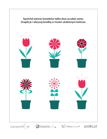 Spośród sześciu kwiatków tylko dwa są takie same. Znajdź je i obrysuj kredką w twoim ulubionym kolorze.