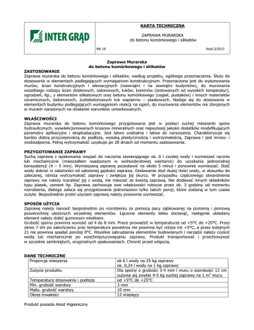 KARTA TECHNICZNA ZAPRAWA MURARSKA do betonu komórkowego i silikatów NR 18 Wyd.3/2013 Zaprawa Murarska do betonu komórkowego i silikatów ZASTOSOWANIE Zaprawa murarska do betonu komórkowego i silikatów, według projektu, ogólnego przeznaczenia. SłuŜy do stosowania w elementach podlegających wymaganiom konstrukcyjnym. Przeznaczona jest do wykonywania murów, ścian konstrukcyjnych i elewacyjnych (wewnątrz i na zewnątrz budynków), do murowania wszelkiego rodzaju ścian działowych, osłonowych, łuków, kominów (izolowanych od wysokich temperatur), ogrodzeń, itp., z elementów silikatowych oraz betonu komórkowego (cegieł, pustaków) i innych materiałów ceramicznych, betonowych, ŜuŜlobetonowych lub wapienno – piaskowych. Nadaje się do stosowania w elementach budynku podlegających wymaganiom reakcji na ogień, do murowania elementów nie zbrojonych w murach naraŜonych na działanie warunków umiarkowanych. WŁAŚCIWOŚCI Zaprawa murarska do betonu komórkowego przygotowana jest w postaci suchej mieszanki spoiw hydraulicznych, wyselekcjonowanych kruszyw mineralnych oraz najwyŜszej jakości dodatków modyfikujących parametry aplikacyjne i eksploatacyjne. Jest łatwo urabialna i łatwa do nanoszenia. Charakteryzuje się bardzo dobrą przyczepnością do podłoŜa, wysoką plastycznością i wytrzymałością. Zaprawa i jest mrozo- i wodoodporna. Pełną wytrzymałość uzyskuje po 28 dniach od momentu zastosowania. PRZYGOTOWANIE ZAPRAWY Suchą zaprawę z opakowania wsypać do naczynia zawierającego ok. 6 l czystej wody i wymieszać ręcznie lub mechanicznie (mieszadłem osadzonym w wolnoobrotowej wiertarce) do uzyskania jednorodnej konsystencji (4 – 5 min). Wymieszaną zaprawę pozostawić na około 5 minut i ponownie wymieszać. Ilość wody dobrać w zaleŜności od załoŜonej gęstości zaprawy. Dodawanie zbyt duŜej ilości wody, w stosunku do zalecanej, obniŜa wytrzymałość zaprawy i zwiększa jej skurcz. W przypadku częściowego stwardnienia zaprawy nie naleŜy rozrabiać jej z wodą, nie mieszać ze świeŜą zaprawą. Nie dodawać innych składników typu piasek, cement itp. Zaprawa zachowuje swe właściwości robocze przez ok. 3 godziny od momentu rozrobienia, dlatego zaleca się przygotowanie jednorazowo tylko takich porcji, które zostaną w tym czasie zuŜyte. Bezpośrednio przed uŜyciem zaprawę naleŜy ponownie wymieszać. SPOSÓB UśYCIA Zaprawę naleŜy nanosić bezpośrednio po rozrobieniu za pomocą pacy ząbkowanej na poziomą i pionową powierzchnię ułoŜonych wcześniej elementów. Łączone elementy lekko docisnąć, następnie układany element naleŜy dobić gumowym młotkiem. Grubość spoiny powinna wynosić od 4 do 8 mm. Prace prowadzić w temperaturze od +5°C do +25°C. Przez okres 7 dni po zakończeniu prac temperatura powietrza nie powinna być niŜsza niŜ +5°C, a przez kolejnych 21 nie powinna spadać poniŜej 0°C. Wszelkie zabrudzenia elementów budowlanych i narzędzi naleŜy czyścić wodą lub mechanicznie po wyschnięciu/związaniu zaprawy. Produkt transportować i przechowywać w szczelnie zamkniętych, oryginalnych opakowaniach. Chronić przed wilgocią. DANE TECHNICZNE Proporcja mieszania ZuŜycie produktu Temperatura stosowania i podłoŜa Min. grubość warstwy Maks. grubość warstwy Okres trwałości Produkt posiada Atest Higieniczny ok 6 l wody na 25 kg zaprawy ok. 0,24 l wody na 1 kg zaprawy Dla spoiny o grubości 3-4 mm i muru o szerokości 12 cm zuŜywa się zwykle 4-5 kg suchej zaprawy na 1 m2 muru od +5°C do +25°C 3 mm 10 mm 12 miesięcy UWAGA! • Zaprawa zawiera cement, a po wymieszaniu z woda posiada odczyn silnie alkaliczny. NaleŜy chronić oczy, układ oddechowy i skórę. W przypadku bezpośredniego kontaktu przemyć duŜą ilością wody. W przypadku wystąpienia jakichkolwiek negatywnych objawów naleŜy skontaktować się z lekarzem. • Preparat po zmieszaniu z wodą będzie zawierał nie więcej niŜ równowartość 0,0002% (2ppm) rozpuszczalnego chromu (VI) w przeliczeniu na całkowitą suchą masę produktu. • Producent nie ponosi odpowiedzialności za skutki powstałe w wyniku uŜycia wyrobu niezgodnie z powyŜszymi wskazówkami, zasadami sztuki budowlanej oraz przepisami BHP. • Produkt transportować i przechowywać w szczelnie zamkniętych oryginalnych opakowaniach w suchych pomieszczeniach. Chronić przed wilgocią. NR serii- patrz data produkcji. Data produkcji znajduje sie na opakowaniu