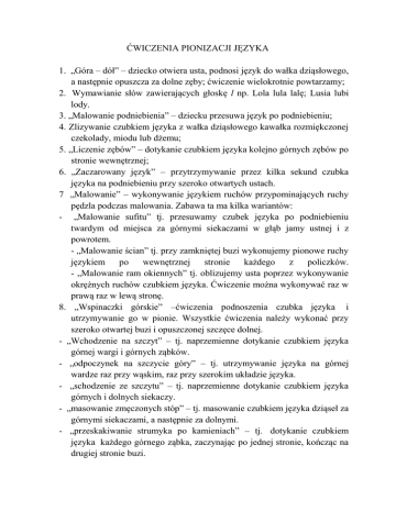 ĆWICZENIA PIONIZACJI JĘZYKA 1. „Góra – dół” – dziecko otwiera usta, podnosi język do wałka dziąsłowego, a następnie opuszcza za dolne zęby; ćwiczenie wielokrotnie powtarzamy; 2. Wymawianie słów zawierających głoskę l np. Lola lula lalę; Lusia lubi lody. 3. „Malowanie podniebienia” – dziecku przesuwa język po podniebieniu; 4. Zlizywanie czubkiem języka z wałka dziąsłowego kawałka rozmiękczonej czekolady, miodu lub dżemu; 5. „Liczenie zębów” – dotykanie czubkiem języka kolejno górnych zębów po stronie wewnętrznej; 6. „Zaczarowany język” – przytrzymywanie przez kilka sekund czubka języka na podniebieniu przy szeroko otwartych ustach. 7 „Malowanie” – wykonywanie językiem ruchów przypominających ruchy pędzla podczas malowania. Zabawa ta ma kilka wariantów: - „Malowanie sufitu” tj. przesuwamy czubek języka po podniebieniu twardym od miejsca za górnymi siekaczami w głąb jamy ustnej i z powrotem. - „Malowanie ścian” tj. przy zamkniętej buzi wykonujemy pionowe ruchy językiem po wewnętrznej stronie każdego z policzków. - „Malowanie ram okiennych” tj. oblizujemy usta poprzez wykonywanie okrężnych ruchów czubkiem języka. Ćwiczenie można wykonywać raz w prawą raz w lewą stronę. 8. „Wspinaczki górskie” –ćwiczenia podnoszenia czubka języka i utrzymywanie go w pionie. Wszystkie ćwiczenia należy wykonać przy szeroko otwartej buzi i opuszczonej szczęce dolnej. - „Wchodzenie na szczyt” – tj. naprzemienne dotykanie czubkiem języka górnej wargi i górnych ząbków. - „odpoczynek na szczycie góry” – tj. utrzymywanie języka na górnej wardze raz przy wąskim, raz przy szerokim układzie języka. - „schodzenie ze szczytu” – tj. naprzemienne dotykanie czubkiem języka górnych i dolnych siekaczy. - „masowanie zmęczonych stóp” – tj. masowanie czubkiem języka dziąseł za górnymi siekaczami, a następnie za dolnymi. - „przeskakiwanie strumyka po kamieniach” – tj. dotykanie czubkiem języka każdego górnego ząbka, zaczynając po jednej stronie, kończąc na drugiej stronie buzi.