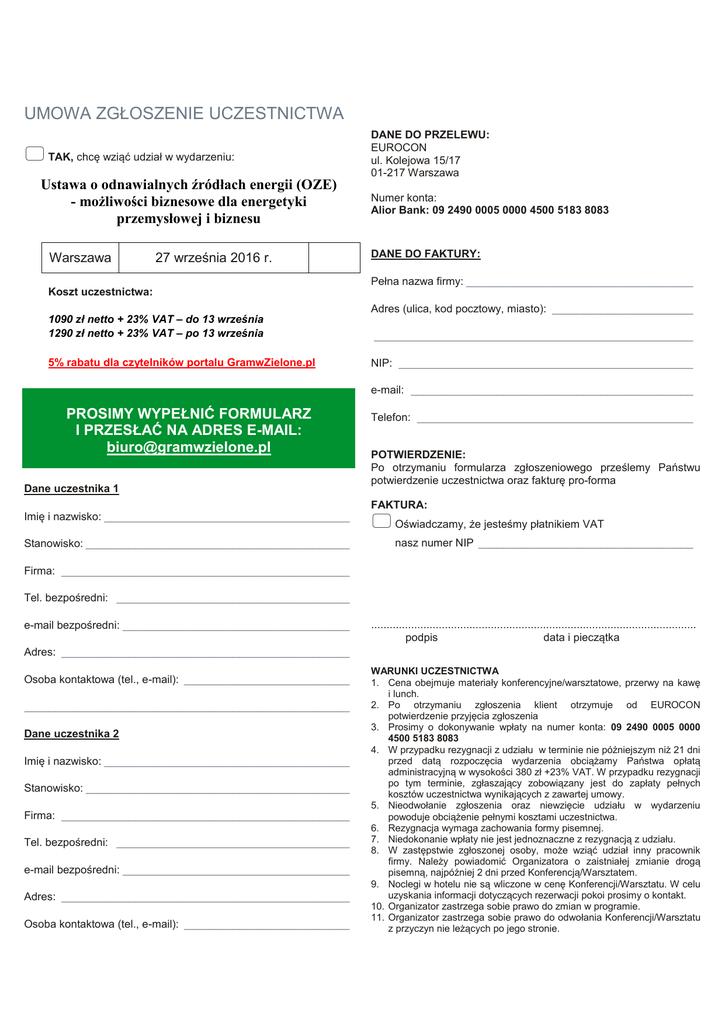 UMOWA ZGŁOSZENIE UCZESTNICTWA TAK, chcę wziąć udział w wydarzeniu: Ustawa o odnawialnych źródłach energii (OZE) - możliwości biznesowe dla energetyki przemysłowej i biznesu Warszawa 27 września 2016 r. DANE DO PRZELEWU: EUROCON ul. Kolejowa 15/17 01-217 Warszawa Numer konta: Alior Bank: 09 2490 0005 0000 4500 5183 8083 DANE DO FAKTURY: Pełna nazwa firmy: _____________________________________ Koszt uczestnictwa: 1090 zł netto + 23% VAT – do 13 września 1290 zł netto + 23% VAT – po 13 września 5% rabatu dla czytelników portalu GramwZielone.pl Adres (ulica, kod pocztowy, miasto): _______________________ ____________________________________________________ NIP: ________________________________________________ e-mail: ______________________________________________ PROSIMY WYPEŁNIĆ FORMULARZ I PRZESŁAĆ NA ADRES E-MAIL: [email protected] Dane uczestnika 1 Imię i nazwisko: ________________________________________ Stanowisko: ___________________________________________ Telefon: _____________________________________________ POTWIERDZENIE: Po otrzymaniu formularza zgłoszeniowego prześlemy Państwu potwierdzenie uczestnictwa oraz fakturę pro-forma FAKTURA: Oświadczamy, że jesteśmy płatnikiem VAT nasz numer NIP ___________________________________ Firma: _______________________________________________ Tel. bezpośredni: ______________________________________ e-mail bezpośredni: _____________________________________ .......................................................................................................... podpis data i pieczątka Adres: _______________________________________________ Osoba kontaktowa (tel., e-mail): ___________________________ _____________________________________________________ Dane uczestnika 2 Imię i nazwisko: ________________________________________ Stanowisko: ___________________________________________ Firma: _______________________________________________ Tel. bezpośredni: ______________________________________ e-mail bezpośredni: _____________________________________ Adres: _______________________________________________ Osoba kontaktowa (tel., e-mail): ___________________________ WARUNKI UCZESTNICTWA 1. Cena obejmuje materiały konferencyjne/warsztatowe, przerwy na kawę i lunch. 2. Po otrzymaniu zgłoszenia klient otrzymuje od EUROCON potwierdzenie przyjęcia zgłoszenia 3. Prosimy o dokonywanie wpłaty na numer konta: 09 2490 0005 0000 4500 5183 8083 4. W przypadku rezygnacji z udziału w terminie nie późniejszym niż 21 dni przed datą rozpoczęcia wydarzenia obciążamy Państwa opłatą administracyjną w wysokości 380 zł +23% VAT. W przypadku rezygnacji po tym terminie, zgłaszający zobowiązany jest do zapłaty pełnych kosztów uczestnictwa wynikających z zawartej umowy. 5. Nieodwołanie zgłoszenia oraz niewzięcie udziału w wydarzeniu powoduje obciążenie pełnymi kosztami uczestnictwa. 6. Rezygnacja wymaga zachowania formy pisemnej. 7. Niedokonanie wpłaty nie jest jednoznaczne z rezygnacją z udziału. 8. W zastępstwie zgłoszonej osoby, może wziąć udział inny pracownik firmy. Należy powiadomić Organizatora o zaistniałej zmianie drogą pisemną, najpóźniej 2 dni przed Konferencją/Warsztatem. 9. Noclegi w hotelu nie są wliczone w cenę Konferencji/Warsztatu. W celu uzyskania informacji dotyczących rezerwacji pokoi prosimy o kontakt. 10. Organizator zastrzega sobie prawo do zmian w programie. 11. Organizator zastrzega sobie prawo do odwołania Konferencji/Warsztatu z przyczyn nie leżących po jego stronie.