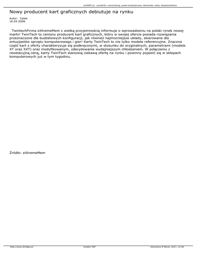 strefaPC.pl - poradniki, overclocking, prasa komputerowa, sterowniki, testy, bezpieczeństwo Nowy producent kart graficznych debiutuje na rynku Autor: Caleb 16.04.2008. TwintechFirma eXtremeMem z wielką przyjemnością informuje o wprowadzeniu na polski rynek nowej marki! TwinTech to ceniony producent kart graficznych, który w swojej ofercie posiada rozwiązania przeznaczone dla budżetowych konfiguracji, jak również najmocniejsze układy, skierowane dla entuzjastów sprzętu komputerowego i gier! Karty TwinTech to nie tylko modele referencyjne. Znaczna część kart z oferty charakteryzuje się podkręconymi, w stosunku do oryginalnych, parametrami (modele XT oraz XXT) oraz modyfikowanym, zdecydowanie wydajniejszym chłodzeniem. W połączeniu z rewelacyjną ceną, karty TwinTech stanowią ciekawą ofertę na rynku i powinny pojawić się w sklepach komputerowych już w tym tygodniu. Źródło: eXtremeMem http://www.strefapc.pl Kreator PDF Utworzono 8 March, 2017, 13:38