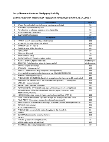 Certyfikowane Centrum Medycyny Podróży Cennik świadczeń medycznych i szczepień ochronnych od dnia 21.04.2016 r. LP 1 2 3 4 5 LP Świadczenie Wizyta (konsultacja lekarska lekarza medycyny podróży) Profilaktyka przeciwmalaryczna Poradnictwo w zakresie szczepień przed podróżą Podanie własnej szczepionki Duplikat żółtej książeczki Szczepionki 1 2 3 4 5 6 7 8 9 10 11 12 13 14 15 16 17 18 19 20 21 HAVRIX wzw A (szczepionka pediatryczna) Wzw A dla dorosłych (HAVRIX Adult) TWINRIX wzw A + wzw B ENGERIX wzw B (dla dorosłych) HBVAX PRO Td (tężec, błonica) IMOVAX Polio (IPV) DULTAVAX Td-IPV (błonica, tężec, polio) ADACEL (błonica, tężec, krztusiec) BOOSTRIX Polio (błonica, tężec, krztusiec, polio) TYPHIM-Vi (dur brzuszny) STAMARIL ( żółta gorączka) NeisVac C MENINGOKOKI (szczepionka koniugowana) Meningokoki szczepionka koniugowana typ ACW135Y NIMENRIX BEXSERO (meningokoki typ B) PNEUMOKOKI SYNFLORIX ( dla dzieci, szczepionka koniugowana, 10 serotypów) PNEUMOKOKI PRENEVAR 13 (szczepionka koniugowana, 13 serotypów) VARILRIX ( ospa wietrzna) PRIORIX (odra, świnka, różyczka) PENTAXIM DTPa-IPV-Hib (błonica, tężec, krztusiec, polio, haemophilus) INFANRIX Hexa DTPa-IPV-Hib-WZW B (błonica, tężec, krztusiec, polio, haemophilus, WZW B) HEXACIMA (błonica, tężec, krztusiec, polio, haemophilus, WZW B) FSME JUNIOR (kleszczowe zapalenie mózgu dla dzieci) do 16 roku życia FSME ADULT (kleszczowe zapalenie mózgu dla dorosłych) SILGARD (wirus brodawczaka ludzkiego, brodawki płciowe, rak szyjki macicy) ROTARIX (rotawirusy) ROTATEQ (rotawirusy) PNEUMO 23 ( pneumokoki, polisacharydowa) dla dorosłych IXIARO DUKORAL Szczepionka przeciw cholerze Tetana HIBERIX (przeciw Haemophilus infl.) VERORAB (przeciw wściekliźnie) Kwalifikacja do pojedynczego szczepienia 22 23 24 25 26 27 28 29 30 31 32 33 34 Cena w zł 50 30 50 30 20 Cena w zł za każdą dawkę 120 175 195 60 50 50 80 105 niedostępna niedostępna 215 195 135 200 380 190 265 215 90 125 200 180 105 115 250 295 190 85 345 150 35 75 150 10