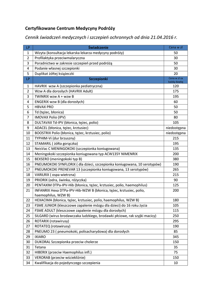 Certyfikowane Centrum Medycyny Podróży Cennik