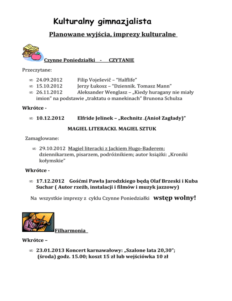 Kulturalny gimnazjalista Planowane wyjścia, imprezy kulturalne Czynne Poniedziałki - CZYTANIE Przeczytane: • 24.09.2012 Filip Voješevič – “Halflife” • 15.10.2012 Jerzy Łukosz – “Dziennik. Tomasz Mann” • 26.11.2012 Aleksander Wenglasz – „Kiedy huragany nie miały imion” na podstawie „traktatu o manekinach” Brunona Schulza Wkrótce • 10.12.2012 Elfride Jelinek – „Rechnitz .(Anioł Zagłady)” MAGIEL LITERACKI. MAGIEL SZTUK Zamaglowane: • 29.10.2012 Magiel literacki z Jackiem Hugo-Baderem; dziennikarzem, pisarzem, podróżnikiem; autor książki: „Kroniki kołymskie” Wkrótce • 17.12.2012 Gośćmi Pawła Jarodzkiego będą Olaf Brzeski i Kuba Suchar ( Autor rzeźb, instalacji i filmów i muzyk jazzowy) Na wszystkie imprezy z cyklu Czynne Poniedziałki wstęp wolny! Filharmonia Wkrótce – • 23.01.2013 Koncert karnawałowy: „Szalone lata 20,30”; (środa) godz. 15.00; koszt 15 zł lub wejściówka 10 zł Opera • 19.11. 2012 - „Córka źle strzeżona” • 23.11.2012 - „Don Giovanni” Wkrótce • 13.01.2013 „Skrzypek na dachu” ;(niedziela) godz.17.00 koszt - 50 zł (IV balkon) Teatr oglądaliśmy • 3.10.2012 - „Mayday” • 8.11. 2012 - „Wallstrasse 13” • 16.11. 2012 – „Pieniądze są w …” Wkrótce: Ad Spectatores: „Opowieść wigilijna”; grudzień 2012 Na grudzień zapraszam do oglądania wystawy IPN Oddział we Wrocławiu – „Stan wojenny – spojrzenie po 20 latach” Czas ekspozycji: od 3.12. do 21.12. 2012r. Spotkanie ze świadkiem historii - 18.12.2012 godz. 10.00 Kornelem Morawieckim polskim politykiem, działaczem opozycji antykomunistycznej w PRL; założycielem i przewodniczącym Solidarności Walczącej. Miejsce ekspozycji i spotkania - MBP Filia nr 40 przy naszej szkole Gimnazjum 24 im. Janusza Korczaka we Wrocławiu, ul. Przybyszewskiego 59 (w godzinach otwarcia biblioteki) Zapraszam. Halina Dudek