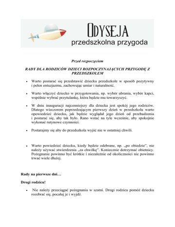 Przed rozpoczęciem RADY DLA RODZICÓW DZIECI ROZPOCZYNAJĄCYCH PRZYGODĘ Z PRZEDSZKOLEM Warto postarać się przedstawić dziecku przedszkole w sposób pozytywny i pełen entuzjazmu, zachowując umiar i naturalność. Warto włączyć dziecko w przygotowania, np. wybór ubrania, wybór kapci, wspólnie wybrać przytulankę, która będzie mu towarzyszyć. W dniu inauguracji najcenniejszy dla dziecka jest spokój jego rodziców. Dlatego wieczorem poprzedzającym pierwszy dzień w przedszkolu warto opowiedzieć dziecku, jak będzie wyglądał jego dzień od przebudzenia i postarać się, aby tak było. Rano wstać na tyle wcześnie, aby spokojnie wykonać rutynowe czynności. Postarajmy się aby do przedszkola wyjść nie w ostatniej chwili. Warto powiedzieć dziecku, kiedy będzie odebrane, np. „po obiedzie”, nie należy używać stwierdzenia „za chwilkę”. Koniecznie dotrzymać obietnicy. Pożegnanie powinno być krótkie i niezależnie od okoliczności nie powinno trwać wiele dłużej. Rady na pierwsze dni… Drogi rodzicu! Nie należy przeciągać pożegnania w szatni. Drogi rodzicu pomóż dziecku rozebrać się, pocałuj je i wyjdź. Nie jest dobrym rozwiązaniem zabieramie dziecka do domu, kiedy płacze przy rozstaniu. Jeśli zrobimy to choć raz, będzie wiedziało, że łzami można wiele wymusić. Największe nasilenie płaczu jest zawsze w dniu drugim i trzecim. Pierwszego dnia większość dzieci nie płacze - zwycięża ciekawość przedszkola. Nie obiecuj: Jeśli pójdziesz do przedszkola, to kupimy Ci…. Gdy przyjdziesz po dziecko, możesz dać mu mały prezencik. Możesz wtedy powiedzieć: Witaj, myślałam/-em o tobie. Mam coś dla ciebie. Kontroluj to, co mówisz. Zamiast: Już możemy wracać do domu, (wydźwięk negatywny) powiedz: Teraz możemy iść do domu – to brzmi dobrze. Nie wymuszaj na dziecku, żeby zaraz po przyjściu do domu opowiedziało, co się wydarzyło w przedszkolu. To powoduje niepotrzebny stres. Jeśli dziecko przy pożegnaniu z mamą płacze, może warto, aby przez kilka dni odprowadzał je do przedszkola tata. Pamiętaj: żegnaj i witaj swoje dziecko zawsze UŚMIECHEM!