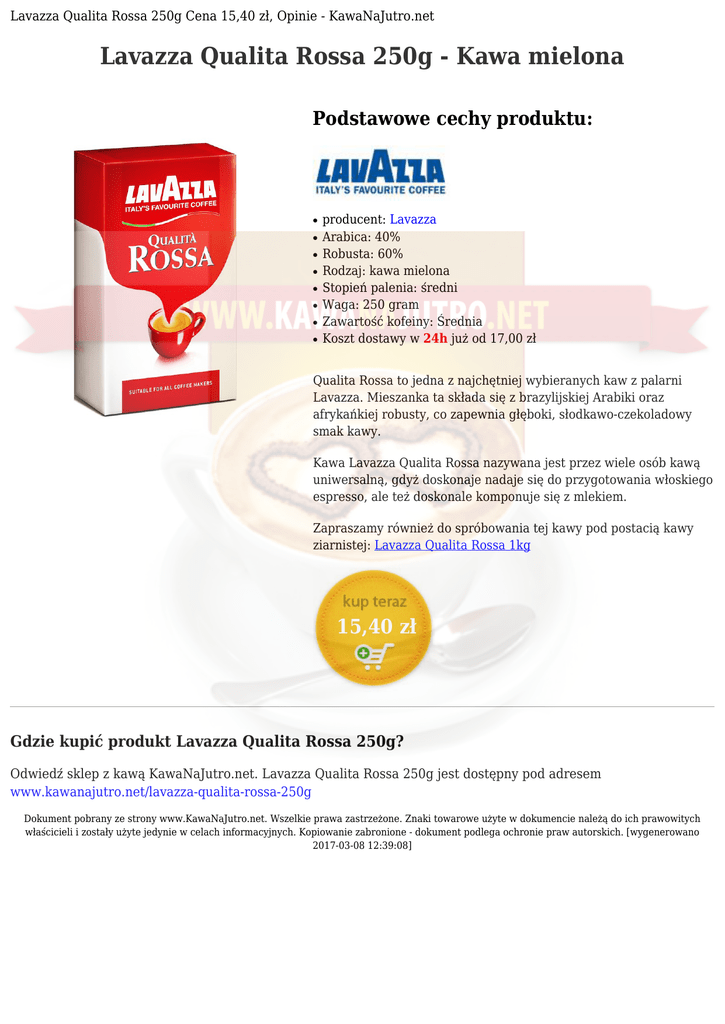 Lavazza Qualita Rossa 250g Cena 15,40 zł, Opinie - KawaNaJutro.net Lavazza Qualita Rossa 250g - Kawa mielona Podstawowe cechy produktu: ● ● ● ● ● ● ● ● producent: Lavazza Arabica: 40% Robusta: 60% Rodzaj: kawa mielona Stopień palenia: średni Waga: 250 gram Zawartość kofeiny: Średnia Koszt dostawy w 24h już od 17,00 zł Qualita Rossa to jedna z najchętniej wybieranych kaw z palarni Lavazza. Mieszanka ta składa się z brazylijskiej Arabiki oraz afrykańkiej robusty, co zapewnia głęboki, słodkawo-czekoladowy smak kawy. Kawa Lavazza Qualita Rossa nazywana jest przez wiele osób kawą uniwersalną, gdyż doskonaje nadaje się do przygotowania włoskiego espresso, ale też doskonale komponuje się z mlekiem. Zapraszamy również do spróbowania tej kawy pod postacią kawy ziarnistej: Lavazza Qualita Rossa 1kg 15,40 zł Gdzie kupić produkt Lavazza Qualita Rossa 250g? Odwiedź sklep z kawą KawaNaJutro.net. Lavazza Qualita Rossa 250g jest dostępny pod adresem www.kawanajutro.net/lavazza-qualita-rossa-250g Dokument pobrany ze strony www.KawaNaJutro.net. Wszelkie prawa zastrzeżone. Znaki towarowe użyte w dokumencie należą do ich prawowitych właścicieli i zostały użyte jedynie w celach informacyjnych. Kopiowanie zabronione - dokument podlega ochronie praw autorskich. [wygenerowano 2017-03-08 12:39:08]