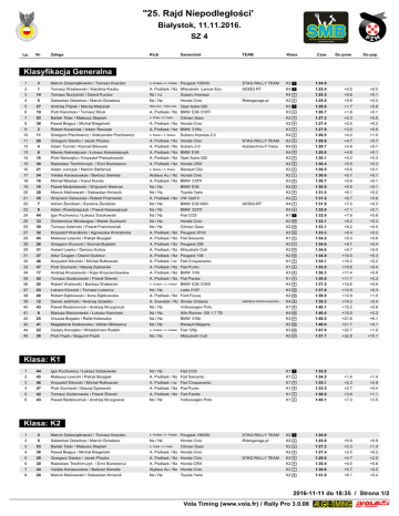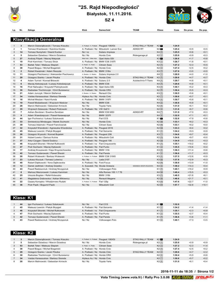 "25. Rajd Niepodległości' Białystok, 11.11.2016. SZ 4 Lp. Nr. Załoga Załoga Klub Samochód TEAM Klasa Czas Do prow. Do pop. Peugeot 106XSi STAG RALLY TEAM K2K21 1:24.9 ADIGO RT K4K41 K4K42 1:25.4 +0.5 +0.5 1:25.5 +0.6 +0.1 K2K22 1:25.8 +0.9 +0.3 K3K31 1:26.6 +1.7 +0.8 K3K32 1:26.7 +1.8 +0.1 K2K23 1:27.2 +2.3 +0.5 Klasyfikacja Generalna 1 3 Marcin Marcin Dziewiątkowski Dziewiątkowski / Tomasz / Tomasz Kraczko Kraczko A. Podlask / A. Podlask 2 1 Tomasz Tomasz Wasilewski Wasilewski / Karolina / Karolina Kiszko Kiszko A. Podlask / Nz Mitsubishi Lancer Evo 3 14 Tomasz Tomasz Nurzyński Nurzyński / Dawid / Dawid Kucbor Kucbor Nz / nz Subaru Impreza 4 5 Sebastian Sebastian Dziadosz Dziadosz / Marcin / Marcin Dziadosz Dziadosz Nz / Nz Honda Civic 5 27 Andrzej Andrzej Filipek Filipek / Maciej / Maciej Matysiak Matysiak Moto Auto / Moto Auto Opel Astra GSI 6 19 Piotr Piotr Kamiński Kamiński / Tomasz / Tomasz Struk Struk A. Podlask / Nz BMW E36 318TI 7 53 Bartek Bartek Teter Teter / Mateusz / Mateusz Stepień Stepień A. Polski / A. Polski 8 38 Paweł Paweł Biegus Biegus / Michał / Michał Biegański Biegański A. Podlask / Nz Honda Civic K2K24 1:27.4 +2.5 +0.2 9 2 Robert Robert Kwaśniak Kwaśniak / Adam / Adam Reszuta Reszuta A. Podlask / Nz BMW 318is K3K33 1:27.9 +3.0 +0.5 10 11 Grzegorz Grzegorz Piechowicz Piechowicz / Aleksander / Aleksander Piechowicz Piechowicz A. Bialsko / A. Bialsko K4K43 1:28.9 +4.0 +1.0 11 29 Grzegorz Grzegorz Sianko Sianko / Jacek / Jacek Pliszka Pliszka A. Podlask / Nz Honda CIvic STAG RALLY TEAM K2K25 1:29.6 +4.7 +0.7 12 4 Adam Adam Tumiel Tumiel / Konrad / Konrad Bitowski Bitowski A. Podlask / Nz Subaru 2.0 Autotechnix-T-Trans K4K44 1:29.7 +4.8 +0.1 13 6 Maciej Maciej Aleksiejczuk Aleksiejczuk / Łukasz / Łukasz Kołodziejczyk Kołodziejczyk A. Podlask / Nz BMW E36 K4K45 1:29.8 +4.9 +0.1 14 16 Piotr Piotr Naliwajko Naliwajko / Krzysztof / Krzysztof Pietrzykowski Pietrzykowski A. Podlask / Nz Opel Astra GSi K3K34 1:30.1 +5.2 +0.3 15 30 Radosław Radosław Trochimczyk Trochimczyk/ Emil / Emil Bursiewicz Bursiewicz A. Podlask / Nz Honda CRX K2K26 1:30.4 +5.5 +0.3 16 21 Adam Adam Junczyk Junczyk / Marcin / Marcin Stefaniuk Stefaniuk A. Bialsko / A. Bialsko Renault Clio K3K35 1:30.5 +5.6 +0.1 17 34 Vaidas Vaidas Karasauskas Karasauskas / Bartosz / Bartosz Siereda Siereda Alytaus Au / Nz Honda Civic K2K27 1:30.6 +5.7 +0.1 18 18 Michał Michał Miezian Miezian / Karol / Karol Kunda Kunda A. Podlask / Nz BMW 318Ti K3K36 1:30.7 +5.8 +0.1 19 10 Paweł Paweł Modzelewski Modzelewski / W/ W ojciech ojciech Nieścier Nieścier Nz / Nz BMW E36 K4K46 1:30.8 +5.9 +0.1 20 28 Marcin Marcin Malinowski Malinowski / Sebastian / Sebastian Kmiecik Kmiecik Nz / Nz Toyota Yaris K2K28 1:31.0 +6.1 +0.2 21 35 Wojciech Wojciech Dzieszuta Dzieszuta / Robert / Robert Piotrowski Piotrowski A. Podlask / Nz VW Golf II K2K29 1:31.6 +6.7 +0.6 22 7 Adrian Adrian Żendzian Żendzian / Ewelina / Ewelina Żendzian Żendzian Nz / Nz BMW E30 M50 K4K47 1:31.9 +7.0 +0.3 23 9 Adam Adam WW awdziejczuk awdziejczuk / Paweł / Paweł Karawajczyk Karawajczyk Nz / Nz BMW 323TI K4K48 1:32.0 +7.1 +0.1 24 44 Igor Igor Puchowicz Puchowicz / Łukasz / Łukasz Sztukowski Sztukowski Nz / Nz Fiat CCS K1K11 1:32.8 +7.9 +0.8 25 33 Simkevicius Simkevicius Mindaugas Mindaugas / Marek / Marek Suchocki Suchocki Nz / Nz Honda Civic K2K210 1:33.1 +8.2 +0.3 25 39 Tomasz Tomasz Adamski Adamski / Paweł / Paweł Franckowiak Franckowiak Nz / Nz Citroen Saxo K2K210 1:33.1 +8.2 +0.0 27 32 Krzysztof Krzysztof Wierzbicki Wierzbicki / Agnieszka / Agnieszka WW ierzbicka ierzbicka A. Podlask / Nz Peugeot 2016 K2K212 1:33.3 +8.4 +0.2 28 45 Mateusz Mateusz Lewicki Lewicki / Patryk / Patryk Bryzgiel Bryzgiel A. Podlask / Nz Fiat Seicento K1K12 1:34.2 +9.3 +0.9 29 26 Grzegorz Grzegorz Wysocki Wysocki / Konrad / Konrad Bujalski Bujalski A. Podlask / Nz Peugeot 206 K3K37 1:34.6 +9.7 +0.4 29 31 Hubert Hubert Lewko Lewko / Dariusz / Dariusz Kulina Kulina A. Podlask / Nz Mitsubishi Colt K2K213 1:34.6 +9.7 +0.0 31 37 Artur Artur Czugan Czugan / Dawid / Dawid Dudzicz Dudzicz A. Podlask / Nz Peugeot 106 K2K214 1:34.9 +10.0 +0.3 32 46 Krzysztof Krzysztof Sikorski Sikorski / Michał / Michał Rutkowski Rutkowski A. Podlask / nz Fiat Cinquecento K1K13 1:35.1 +10.2 +0.2 33 47 Piotr Piotr Sochacki Sochacki / Maciej / Maciej Dybowski Dybowski A. Podlask / Nz Fiat Punto K1K14 1:35.5 +10.6 +0.4 34 17 Andrzej Andrzej Kruszewski Kruszewski / Kaja / Kaja WW oyciechowska oyciechowska A. Podlask / Nz BMW 316i K3K38 1:36.3 +11.4 +0.8 35 42 Tomasz Tomasz Gudanowski Gudanowski / Paweł / Paweł Śliwski Śliwski A. Podlask / Nz Fiat Panda K1K15 1:36.6 +11.7 +0.3 36 20 Robert Robert Walewski W alewski / Bartosz / Bartosz Walewski Walewski A. Podlask / A. Podlask BMW E36 318iS K3K39 1:37.5 +12.6 +0.9 37 23 Łukasz Łukasz Kluczuk Kluczuk / Tomasz / Tomasz Lulewicz Lulewicz Nz / Nz Lada 2107 K3K310 1:37.8 +12.9 +0.3 38 40 Robert Robert Dąbkowski Dąbkowski / Ilona / Ilona Dąbkowska Dąbkowska A. Podlask / Nz Ford Focus K2K215 1:38.8 +13.9 +1.0 39 12 Daniel Daniel Jedliński Jedliński / Andrzej / Andrzej Grześko Grześko A. Suwalsk / Nz Skoda Octawia K4K49 1:39.2 +14.3 +0.4 40 43 Paweł Paweł Radziwoniuk Radziwoniuk / Andrzej / Andrzej Niczyporuk Niczyporuk Nz / Nz Volkswagen Polo K1K16 1:40.1 +15.2 +0.9 41 8 Mariusz Mariusz Maciorowski Maciorowski / Łukasz / Łukasz Kamiński Kamiński Nz / Nz Alfa Romeo 155 1.7 TS K4K410 1:40.4 +15.5 +0.3 42 25 Urszula Urszula Bogdan Bogdan / Rafał / Rafał Kobeszko Kobeszko Nz / Nz BMW 318ti K3K311 1:46.5 +21.6 +6.1 43 41 Magdalena Magdalena Grabowska Grabowska / Adrian / Adrian Mikiewicz Mikiewicz Nz / Nz Renault Megane K2K216 1:46.6 +21.7 +0.1 44 22 Cezary Cezary Konopko Konopko / W/ W łodzimierz łodzimierz Rudzki Rudzki A. Podlask / A. Podlask Fiat 125p K3K312 1:47.6 +22.7 +1.0 45 36 Piotr Piotr Pazik Pazik / Bogumił / Bogumił Pazik Pazik Nz / Nz Mitsubishi Colt K2K217 1:57.7 +32.8 +10.1 Fiat CCS Ridergarage.pl 