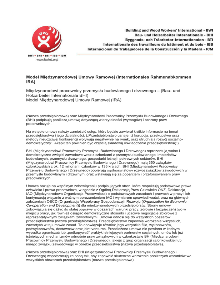 Model Międzynarodowej Umowy Ramowej (Internationales Rahmenabkommen IRA) Międzynarodowi pracownicy przemysłu budowlanego i drzewnego – (Bau- und Holzarbeiter Internationale BHI) Model Międzynarodowej Umowy Ramowej (IRA) (Nazwa przedsiębiorstwa) oraz Międzynarodowi Pracownicy Przemysłu Budowlanego i Drzewnego (BHI) podpisują poniższą umowę dotyczącą wierzytelności (wymogów) i ochrony praw pracowniczych. Na wstępie umowy należy zamieścić ustęp, który będzie zawierał krótkie informacje na temat przedsiębiorstwa i jego działalności. („Przedsiębiorstwo uznaje, iż korupcja, przekupstwo oraz metody nieuczciwej konkurencji wpływają negatywnie na rynek, oraz utrudniają rozwój socjalnodemokratyczny”. Akapit ten powinien być częścią składową oświadczenia przedsiębiorstwa)”). BHI (Międzynarodowi Pracownicy Przemysłu Budowlanego i Drzewnego) reprezentują wolne i demokratyczne związki zawodowe wraz z członkami z przemysłu budowlanego i materiałów budowlanych, przemysłu drzewnego, gospodarki leśnej i pokrewnych sektorów. BHI (Międzynarodowi Pracownicy Przemysłu Budowlanego i Drzewnego) mają 350 związków członkowskich z ok. 12 milionami członków w 135 krajach. BHI (Międzynarodowi Pracownicy Przemysłu Budowlanego i Drzewnego) popierają ogólnoświatowy rozwój związków zawodowych w przemyśle budowlanym i drzewnym, oraz wstawiają się za poparciem i przeforsowaniem praw pracowniczych. Umowa bazuje na wspólnym zobowiązaniu podpisujących stron, które respektują podstawowe prawa człowieka i prawa pracownicze, w zgodzie z Ogólną Deklaracją Praw Człowieka ONZ, Deklaracją IAO (Międzynarodowa Organizacja Pracownicza) o podstawowych zasadach i prawach w pracy i ich kontynuacją włącznie z ważnym porozumieniem IAO i wymiarem sprawiedliwości, oraz na głównych założeniach OECD (Organizacja Współpracy Gospodarczej i Rozwoju (Organization for Economic Co-operation and Development)) dla międzynarodowych przedsiębiorstw. Strony umowy zobowiązują się dążyć do stałej poprawy w obszarach warunki pracy, zdrowie i bezpieczeństwo w miejscu pracy, jak również osiągać demokratyczne stosunki i uczciwe negocjacje zbiorowe z reprezentatywnymi związkami zawodowymi. Umowa odnosi się do wszystkich obszarów przedsiębiorstwa (nazwa przedsiębiorstwa). Przedsiębiorstwo zapewnia wdrożenie wszystkich, zawartych w tej umowie zasad. To obowiązuje również jego wszystkie filie, wykonawców, podwykonawców, dostawców oraz joint ventures. Przedłożona umowa nie powinna w żadnym wypadku ograniczać lub „podkopywać“ praktyk istniejących partnerstw socjalnych, umów lub już istniejących mechanizmów odnośnie praw związkowych w członkostwie BHI(Międzynarodowi Pracownicy Przemysłu Budowlanego i Drzewnego), jakiejś z grup organizacji członkowskiej lub innego związku zawodowego w obrębie przedsiębiorstwa (nazwa przedsiębiorstwa). (Nazwa przedsiębiorstwa) oraz BHI (Międzynarodowi Pracownicy Przemysłu Budowlanego i Drzewnego) współpracują ze sobą tak, aby zapewnić skuteczne wdrożenie poniższych warunków we wszystkich obszarach przedsiębiorstwa (nazwa przedsiębiorstwa). 1. Uznanie wolności zrzeszania się i prawa do kolektywnych negocjacji Wszyscy pracownicy są uprawnieni do zakładania związków zawodowych w wyniku wyborów, lub do wstępowania do nich. Owe związki zawodowe muszą zostać uznane, po to, aby móc prowadzić negocjacje zbiorowe, odpowiednio do porozumienia IAO (Międzynarodowa Organizacja Pracownicza) nr 87 i 98. Reprezentanci pracowników nie mogą być dyskryminowani. Poza tym muszą mieć dostęp do terenów zakładu i miejsc pracy, tak dalece, jak to służy wykonywaniu ich funkcji jako reprezentacji pracowników, odpowiednio do porozumienia IAO nr 135 i polecenia nr 143. Przedsiębiorstwo jest nastawione względem działań związków pozytywnie, włącznie z dostępem związków do pracowników w procesie organizacyjnym. Przedsiębiorstwo wdraża najbardziej efektywne działania, jeśli organizacja członkowska BHI (Międzynarodowi Pracownicy Przemysłu Budowlanego i Drzewnego) domaga się uznania przez związek zawodowy. 2. Dobrowolne zatrudnienie Każda forma pracy przymusowej lub niewolniczej jest zabroniona. Nie można żądać od pracowników, aby oddawali pracodawcy swoje paszporty, dowody osobiste czy przedmioty wartościowe. (Porozumienie IAO (Międzynarodowa Organizacja Pracownicza) 29 i 105). 3. Niedyskryminowanie przy zatrudnieniu Wszyscy pracownicy mają te same szanse i są tak samo traktowani, bez względu na ich etniczne pochodzenie, religię, zapatrywania polityczne, pochodzenie społeczne, lub inne różnice. Pracownicy otrzymują takie samo wynagrodzenie za taką samą pracę (Porozumienie IAO (Międzynarodowa Organizacja Pracownicza) nr 100 i 111). Migranci i pracownicy wysyłani muszą mieć co najmniej tak samo dobre warunki jak rodzima załoga. 4. Niezatrudnianie dzieci Nie można zatrudniać dzieci. Zatrudniani mogą być pracownicy powyżej 15 roku życia, lub powyżej wieku związanego z obowiązkiem szkolnym (Porozumienie IAO (Międzynarodowa Organizacja Pracownicza) nr 138). Dzieci poniżej 18 roku życia nie mogą podejmować żadnej pracy, która byłaby szkodliwa dla nich w danych warunkach, w szczególności dla ich zdrowia, bezpieczeństwa czy moralności. (Porozumienie IAO (Międzynarodowa Organizacja Pracownicza) nr 182). 5. Odpowiednie wynagrodzenie Pracownicy pobierają wynagrodzenie oraz dodatkowe świadczenia za normalny tydzień pracy, które dają im i ich rodzinom odpowiedni standard życia, oraz są lepsze od minimalnych warunków ustalonych przez państwowe ustawodawstwo lub umowy. Wszyscy pracownicy muszą otrzymać jasno sformułowaną ustną i pisemną informację odnośnie warunków wynagrodzenia oraz informacje o ramach czasowych i związanych z tym wypłatom. (Porozumienie nr 131 z roku 1970 o ustaleniu minimalnych pensji, Poroz