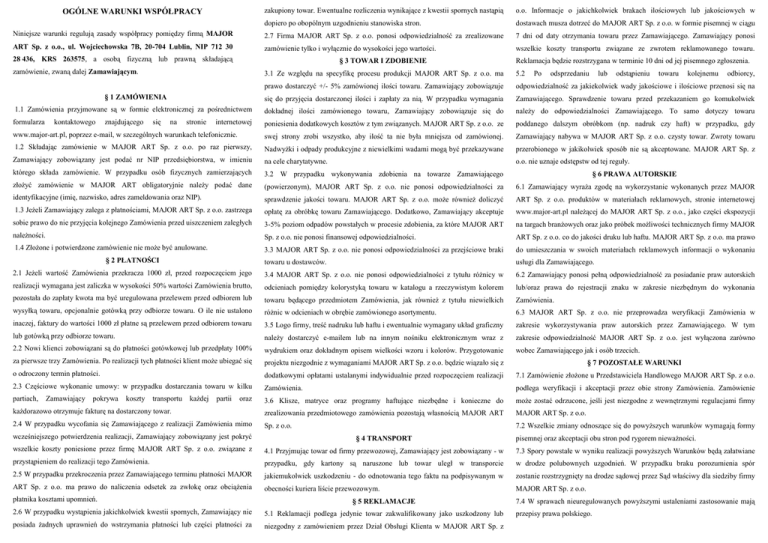 OGÓLNE WARUNKI WSPÓŁPRACY zakupiony towar. Ewentualne rozliczenia wynikające z kwestii spornych nastąpią o.o. Informacje o jakichkolwiek brakach ilościowych lub jakościowych w dopiero po obopólnym uzgodnieniu stanowiska stron. dostawach musza dotrzeć do MAJOR ART Sp. z o.o. w formie pisemnej w ciągu Niniejsze warunki regulują zasady współpracy pomiędzy firmą MAJOR 2.7 Firma MAJOR ART Sp. z o.o. ponosi odpowiedzialność za zrealizowane 7 dni od daty otrzymania towaru przez Zamawiającego. Zamawiający ponosi ART Sp. z o.o., ul. Wojciechowska 7B, 20-704 Lublin, NIP 712 30 zamówienie tylko i wyłącznie do wysokości jego wartości. wszelkie koszty transportu związane ze zwrotem reklamowanego towaru. 28 436, KRS 263575, a osobą fizyczną lub prawną składającą § 3 TOWAR I ZDOBIENIE zamówienie, zwaną dalej Zamawiającym. Reklamacja będzie rozstrzygana w terminie 10 dni od jej pisemnego zgłoszenia. 3.1 Ze względu na specyfikę procesu produkcji MAJOR ART Sp. z o.o. ma 5.2 prawo dostarczyć +/- 5% zamówionej ilości towaru. Zamawiający zobowiązuje odpowiedzialność za jakiekolwiek wady jakościowe i ilościowe przenosi się na się do przyjęcia dostarczonej ilości i zapłaty za nią. W przypadku wymagania Zamawiającego. Sprawdzenie towaru przed przekazaniem go komukolwiek 1.1 Zamówienia przyjmowane są w formie elektronicznej za pośrednictwem dokładnej ilości zamówionego towaru, Zamawiający zobowiązuje się do należy do odpowiedzialności Zamawiającego. To samo dotyczy towaru formularza poniesienia dodatkowych kosztów z tym związanych. MAJOR ART Sp. z o.o. ze poddanego dalszym obróbkom (np. nadruk czy haft) w przypadku, gdy www.major-art.pl, poprzez e-mail, w szczególnych warunkach telefonicznie. swej strony zrobi wszystko, aby ilość ta nie była mniejsza od zamówionej. Zamawiający nabywa w MAJOR ART Sp. z o.o. czysty towar. Zwroty towaru 1.2 Składając zamówienie w MAJOR ART Sp. z o.o. po raz pierwszy, Nadwyżki i odpady produkcyjne z niewielkimi wadami mogą być przekazywane przerobionego w jakikolwiek sposób nie są akceptowane. MAJOR ART Sp. z Zamawiający zobowiązany jest podać nr NIP przedsiębiorstwa, w imieniu na cele charytatywne. o.o. nie uznaje odstępstw od tej reguły. którego składa zamówienie. W przypadku osób fizycznych zamierzających 3.2 W przypadku wykonywania zdobienia na towarze Zamawiającego § 6 PRAWA AUTORSKIE złożyć zamówienie w MAJOR ART obligatoryjnie należy podać dane (powierzonym), MAJOR ART Sp. z o.o. nie ponosi odpowiedzialności za 6.1 Zamawiający wyraża zgodę na wykorzystanie wykonanych przez MAJOR identyfikacyjne (imię, nazwisko, adres zameldowania oraz NIP). sprawdzenie jakości towaru. MAJOR ART Sp. z o.o. może również doliczyć ART Sp. z o.o. produktów w materiałach reklamowych, stronie internetowej 1.3 Jeżeli Zamawiający zalega z płatnościami, MAJOR ART Sp. z o.o. zastrzega opłatę za obróbkę towaru Zamawiającego. Dodatkowo, Zamawiający akceptuje www.major-art.pl należącej do MAJOR ART Sp. z o.o., jako części ekspozycji sobie prawo do nie przyjęcia kolejnego Zamówienia przed uiszczeniem zaległych 3-5% poziom odpadów powstałych w procesie zdobienia, za które MAJOR ART na targach branżowych oraz jako próbek możliwości technicznych firmy MAJOR należności. Sp. z o.o. nie ponosi finansowej odpowiedzialności. ART Sp. z o.o. co do jakości druku lub haftu. MAJOR ART Sp. z o.o. ma prawo 3.3 MAJOR ART Sp. z o.o. nie ponosi odpowiedzialności za przejściowe braki do umieszczania w swoich materiałach reklamowych informacji o wykonaniu towaru u dostawców. usługi dla Zamawiającego. 2.1 Jeżeli wartość Zamówienia przekracza 1000 zł, przed rozpoczęciem jego 3.4 MAJOR ART Sp. z o.o. nie ponosi odpowiedzialności z tytułu różnicy w 6.2 Zamawiający ponosi pełną odpowiedzialność za posiadanie praw autorskich realizacji wymagana jest zaliczka w wysokości 50% wartości Zamówienia brutto, odcieniach pomiędzy kolorystyką towaru w katalogu a rzeczywistym kolorem lub/oraz prawa do rejestracji znaku w zakresie niezbędnym do wykonania pozostała do zapłaty kwota ma być uregulowana przelewem przed odbiorem lub towaru będącego przedmiotem Zamówienia, jak również z tytułu niewielkich Zamówienia. wysyłką towaru, opcjonalnie gotówką przy odbiorze towaru. O ile nie ustalono różnic w odcieniach w obrębie zamówionego asortymentu. 6.3 MAJOR ART Sp. z o.o. nie przeprowadza weryfikacji Zamówienia w inaczej, faktury do wartości 1000 zł płatne są przelewem przed odbiorem towaru 3.5 Logo firmy, treść nadruku lub haftu i ewentualnie wymagany układ graficzny zakresie wykorzystywania praw autorskich przez Zamawiającego. W tym lub gotówką przy odbiorze towaru. należy dostarczyć e-mailem lub na innym nośniku elektronicznym wraz z zakresie odpowiedzialność MAJOR ART Sp. z o.o. jest wyłączona zarówno 2.2 Nowi klienci zobowiązani są do płatności gotówkowej lub przedpłaty 100% wydrukiem oraz dokładnym opisem wielkości wzoru i kolorów. Przygotowanie wobec Zamawiającego jak i osób trzecich. za pierwsze trzy Zamówienia. Po realizacji tych płatności klient może ubiegać się projektu niezgodnie z wymaganiami MAJOR ART Sp. z o.o. będzie wiązało się z § 7 POZOSTAŁE WARUNKI o odroczony termin płatności. dodatkowymi opłatami ustalanymi indywidualnie przed rozpoczęciem realizacji 7.1 Zamówienie złożone u Przedstawiciela Handlowego MAJOR ART Sp. z o.o. 2.3 Częściowe wykonanie umowy: w przypadku dostarczania towaru w kilku Zamówienia. podlega weryfikacji i akceptacji przez obie strony Zamówienia. Zamówienie partiach, 3.6 Klisze, matryce oraz programy haftujące niezbędne i konieczne do może zostać odrzucone, jeśli jest niezgodne z wewnętrznymi regulacjami firmy każdorazowo otrzymuje fakturę na dostarczony towar. zrealizowania przedmiotowego zamówienia pozostają własnością MAJOR ART MAJOR ART Sp. z o.o. 2.4 W pr