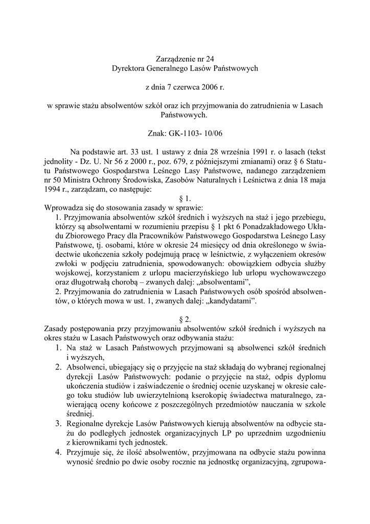 Zarządzenie nr 24 Dyrektora Generalnego Lasów Państwowych z dnia 7 czerwca 2006 r. w sprawie stażu absolwentów szkół oraz ich przyjmowania do zatrudnienia w Lasach Państwowych. Znak: GK-1103- 10/06 Na podstawie art. 33 ust. 1 ustawy z dnia 28 września 1991 r. o lasach (tekst jednolity - Dz. U. Nr 56 z 2000 r., poz. 679, z późniejszymi zmianami) oraz § 6 Statutu Państwowego Gospodarstwa Leśnego Lasy Państwowe, nadanego zarządzeniem nr 50 Ministra Ochrony Środowiska, Zasobów Naturalnych i Leśnictwa z dnia 18 maja 1994 r., zarządzam, co następuje: § 1. Wprowadza się do stosowania zasady w sprawie: 1. Przyjmowania absolwentów szkół średnich i wyższych na staż i jego przebiegu, którzy są absolwentami w rozumieniu przepisu § 1 pkt 6 Ponadzakładowego Układu Zbiorowego Pracy dla Pracowników Państwowego Gospodarstwa Leśnego Lasy Państwowe, tj. osobami, które w okresie 24 miesięcy od dnia określonego w świadectwie ukończenia szkoły podejmują pracę w leśnictwie, z wyłączeniem okresów zwłoki w podjęciu zatrudnienia, spowodowanych: obowiązkiem odbycia służby wojskowej, korzystaniem z urlopu macierzyńskiego lub urlopu wychowawczego oraz długotrwałą chorobą – zwanych dalej: „absolwentami”, 2. Przyjmowania do zatrudnienia w Lasach Państwowych osób spośród absolwentów, o których mowa w ust. 1, zwanych dalej: „kandydatami”. § 2. Zasady postępowania przy przyjmowaniu absolwentów szkół średnich i wyższych na okres stażu w Lasach Państwowych oraz odbywania stażu: 1. Na staż w Lasach Państwowych przyjmowani są absolwenci szkół średnich i wyższych, 2. Absolwenci, ubiegający się o przyjęcie na staż składają do wybranej regionalnej dyrekcji Lasów Państwowych: podanie o przyjęcie na staż, odpis dyplomu ukończenia studiów i zaświadczenie o średniej ocenie uzyskanej w okresie całego toku studiów lub uwierzytelnioną kserokopię świadectwa maturalnego, zawierającą oceny końcowe z poszczególnych przedmiotów nauczania w szkole średniej. 3. Regionalne dyrekcje Lasów Państwowych kierują absolwentów na odbycie stażu do podległych jednostek organizacyjnych LP po uprzednim uzgodnieniu z kierownikami tych jednostek. 4. Przyjmuje się, że ilość absolwentów, przyjmowana na odbycie stażu powinna wynosić średnio po dwie osoby rocznie na jednostkę organizacyjną, zgrupowa- 2 ną w regionalnej dyrekcji Lasów Państwowych. W przypadku zgłoszenia się liczby absolwentów, przekraczającej tę normę, o przyjęciu na staż decyduje średnia ocena uzyskana w toku studiów oraz ocena na dyplomie lub średnia ocen ze świadectwa maturalnego. 5. Jednostki organizacyjne Lasów Państwowych zapewnią miejsca pracy dla stażystów - absolwentów szkół leśnych, zatrudnionych przez powiatowe urzędy pracy w ramach rządowych lub lokalnych programów aktywizacji zawodowej i kierowanych na staż do tych jednostek. § 3. 1. Staż powinien przebiegać według ramowego programu stanowiącego załączniki nr 1 i nr 2 do niniejszego zarządzenia. 2. Programy stażu dla stażystów - absolwentów szkół innych niż leśne - ustala kierownik jednostki, w której stażysta jest zatrudniony. § 4. 1. Kierownik jednostki zatrudniającej stażystę, wyznacza opiekuna stażysty (stażystów), który jest odpowiedzialny za przebieg i realizację programu stażu. 2. Opiekun stażu winien zajmować stanowisko nie niższe niż leśniczy i legitymować się wykształceniem: - co najmniej średnim, jeżeli sprawuje opiekę nad stażystami - absolwentami średnich szkół, - wyższym, jeżeli sprawuje opiekę nad stażystami - absolwentami szkół wyższych. 3. Opiekun stażysty (stażystów) otrzymuje dodatkowe wynagrodzenie za nadzór nad przebiegiem stażu, za zgodą dyrektora regionalnej dyrekcji LP, w wysokości do 15% stawki wyjściowej obowiązującej dla pracowników Służby Leśnej za pierwszego stażystę oraz do 5% tej stawki za każdego kolejnego stażystę. § 5. Przebieg stażu jest rejestrowany w „dzienniku przebiegu stażu”, którego wzór stanowi załącznik nr 3 do zarządzenia. § 6. 1. Warunkiem ukończenia stażu jest pozytywny wynik egzaminu, będącego sprawdzeniem umiejętności i wiedzy nabytej w czasie stażu. 2. Egzamin, o którym mowa w ust. 1, przeprowadza komisja powoływana przez kierownika jednostki organizacyjnej Lasów Państwowych, w której stażysta odbywa staż, w składzie: - zastępca nadleśniczego lub zastępca kierownika innej jednostki organizacyjnej LP, jako przewodniczący komisji, - 2 do 4 członków, w tym: m.in. opiekun stażysty oraz leśniczowie i/lub inni wyznaczeni pracownicy jednostki organizacyjnej LP. 3. Zadaniem komisji, której pracą kieruje jej przewodniczący, jest przeprowadzenie egzaminu i sporządzenie protokołu z jego przebiegu, zawierającego wnioski o zaliczenie lub niezaliczenie stażu. 4. W przypadku pozytywnego wyniku egzaminu stażysta otrzymuje zaświadcze- 3 nie o ukończeniu stażu, zawierające syntetyczną ocenę w skali od 1 do 10, na którą składa się ocena przebiegu stażu oraz ocena wiedzy i kompetencji zawodowych stażysty, gdzie ocena „1” oznacza ocenę najniższą. Wzór zaświadczenia stanowi załącznik nr 4 do zarządzenia. 5. W przypadku braku dostatecznego zaangażowania stażysty w realizację programu stażu i/lub wykazania zbyt niskiego poziomu wiedzy oraz nabytych kompetencji w okresie stażu, Komisja składa wniosek o niezaliczenie stażu przez absolwenta i niewydanie zaświadczenia o jego ukończeniu. 6. Stażyście przysługuje odwołanie od negatywnego wyniku egzaminu w terminie do 7 dni od dnia jego przeprowadzenia, do kierownika jednostki organizacyjnej Lasów Państwowych wyższego szczebla, który może odwołanie odrzucić lub zarządzić powtórny egzamin sprawdzający przed powołaną przez siebie komisją odwoławczą w składzie ustalonym przez siebie. 7. Egzamin sprawdzający przeprowadza się, w terminie nie p