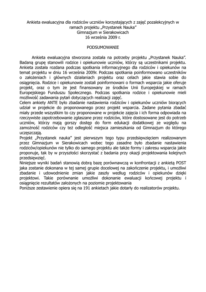 Ankieta ewaluacyjna dla rodziców uczniów korzystających z zajęć pozalekcyjnych w ramach projektu „Przystanek Nauka” Gimnazjum w Sierakowicach 16 września 2009 r. PODSUMOWANIE Ankieta ewaluacyjna stworzona została na potrzeby projektu „Przystanek Nauka”. Badaną grupę stanowili rodzice i opiekunowie uczniów, którzy są uczestnikami projektu. Ankieta została rozdana podczas spotkania informacyjnego dla rodziców i opiekunów na temat projektu w dniu 16 września 2009r. Podczas spotkania poinformowano uczestników o założeniach i głównych działaniach projektu oraz celach jakie stawia sobie do osiągnięcia. Rodzice i opiekunowie zostali poinformowani o formach wsparcia jakie oferuje projekt, oraz o tym że jest finansowany ze środków Unii Europejskiej w ramach Europejskiego Funduszu Społecznego. Podczas spotkania rodzice i opiekunowie mieli możliwość zadawania pytań dotyczących realizacji zajęć. Celem ankiety ANTE było zbadanie nastawienia rodziców i opiekunów uczniów biorących udział w projekcie do proponowanego przez projekt wsparcia. Zadane pytania zbadać miały przede wszystkim to czy proponowane w projekcie zajęcia i ich forma odpowiada na rzeczywiste zapotrzebowanie zgłaszane przez rodziców, które dostosowane jest do potrzeb uczniów, którzy mają gorszy dostęp do form edukacji dodatkowej ze względu na zamożność rodziców czy też odległość miejsca zamieszkania od Gimnazjum do którego uczęszczają. Projekt „Przystanek nauka” jest pierwszym tego typu przedsięwzięciem realizowanym przez Gimnazjum w Sierakowicach wobec tego zasadne było zbadanie nastawienia rodziców/opiekunów nie tylko do samego projektu ale także formy i zakresu wsparcia jakie proponuje, tak by w przyszłości skorzystać z badania przy okazji projektowania kolejnych przedsięwzięć. Niniejsze wyniki badań stanowią dobrą bazę porównawczą w konfrontacji z ankietą POST jaka zostanie dokonana w tej samej grupie docelowej na zakończenie projektu, i umożliwi zbadanie i udowodnienie zmian jakie zaszły według rodziców i opiekunów dzięki projektowi. Takie porównanie umożliwi dokonanie ewaluacji końcowej projektu i osiągnięcie rezultatów założonych na poziomie projektowania Poniższe zestawienie opiera się na 191 ankietach jakie dotarły do realizatorów projektu. 1. Czy uważa Pan/Pani, że program i forma zajęć dodatkowych w ramach projektu „Przystanek Nauka” jest atrakcyjna dla uczniów? TAK – 143 NIE – 13 NIE MAM ZDANIA – 33 BRAK ODPOWIEDZI – 2 TAK NIE NIE MAM ZDANIA BRAK ODPOWIEDZI 74,86% ankietowanych stwierdziło, że proponowana forma i zakres wsparcia oferowanego w ramach zajęć pozalekcyjnych jest atrakcyjna dla ich dzieci. 17,27% pytanych nie było w stanie określić czy forma i zakres są atrakcyjne. Jedynie 6,8% ankietowanych uważa forme wsparcia za nieatrakcyjną. 1,04% pytanych nie udzieliło odpowiedzi na pytanie. 2. Czy uważa Pan/Pani, że projekt „Przystanek Nauka” przyczyni się do wyrównania dysproporcji edukacyjnych pomiędzy obszarami wiejskimi i miejskimi? TAK – 118 NIE – 25 NIE MAM ZDANIA – 46 BRAK ODPOWIEDZI – 2 TAK NIE NIE MAM ZDANIA BRAK ODPOWIEDZI 61,78% ankietowanych uważa, że realizacja projektu przyczyni się do wyrównania tysproporcji edukacyjnych pomiędzy obszarami wiejskimi i miejskimi. 13,08% twierdzi że nie będzie on wyrównywał dysproporcji w tym zakresie. 24,08 % pytanych nie było w stanie stwierdzić jednoznacznie czy projekt przyczyni się do wyrównania dysproporcji, a 1,04% nie udzieliło odpowiedzi na pytanie. 3. Czy dobór zajęć dodatkowych zaproponowanych w projekcie i ich program będzie miał wpływ na lepsze wyniki egzaminu gimnazjalnego Pana/Pani dziecka? TAK – 161 NIE – 6 NIE MAM ZDNIA – 22 BRAK ODPOWIEDZI – 2 TAK NIE NIE MAM ZDANIA BRAK ODPOWIEDZI Znaczna większość ankietowanych – 84,29% twierdzi, iż dobór i program zajęć pozalekcyjnych będzie miał wpływ na lepsze wyniki egzaminów gimnazjalnych uczniów biorących udział w projekcie. Jedynie 3,14% jest odmiennego zdania, a 11,51% nie potrafi określić swojego zdania w tej kwestii. Niniejsze odpowiedzi wskazują na wysoką wartość przedsięwzięcia w oczach rodziców/opiekunów jako cennego wsparcia, które bezpośrednio pomoże uczniom lepiej zdać egzamin gimnazjalny. 4. Czy uważa Pan/Pani, że uczestnictwo w zajęciach w ramach projektu wpłynie na rozwój zainteresowań Pana/Pani dziecka oraz wpłynie na wybór dalszej ścieżki edukacji? TAK – 117 NIE – 26 NIE MAM ZDANIA – 42 BRAK ODPOWIEDZI – 6 TAK NIE NIE MAM ZDANIA BRAK ODPOWIEDZI 61,25% pytanych uważa, że zajęcia dodatkowe wpłyną na rozwój zainteresowań ich dzieci co z kolei zdeterminuje w pewnym stopniu ich wybór ścieżki zawodowej. 21,98% nie ma w tej kwestii zdania, a 13,61% jednoznacznie twierdzi że realizacja zajęć nie będzie miała na to wpływu. 5. Czy uczestnictwo Pana/Pani dziecka w zajęciach dodatkowych w ramach projektu będzie kolidowało z jego obowiązkami domowymi? TAK – 44 NIE – 119 TO BEZ ZNACZENIA – 26 BRAK ODPOWIEDZI – 2 TAK NIE TO BEZ ZNACZENIA BRAK ODPOWIEDZI Większość pytanych 62,3% nie uważa, że udział w zajęciach dodatkowych kolidował będzie z obowiązkami domowymi dzieci, dla 13,61% ankietowanych nie ma to znaczenia, natomiast 23,03 – prawie ¼ pytanych pozytywnie odpowiedziało na pytanie co oznacza, iż zajęcia bezpośrednio kolidować będą z obowiązkami domowymi dzieci. 6. Czy oprócz zajęć dodatkowych przewidzianych w ramach projektu Pana/Pani dziecko korzysta z innych form edukacji pozalekcyjnej lub pozaszkolnej (np. zajęcia z j. obcego, kółka zainteresowań)? TAK – 47 NIE – 139 BRAK ODPOWIEDZI – 5 TAK NIE BRAK ODPOWIEDZI 24,6% pytanych zdeklarowało ze ich dzieci korzystają z dodatkowych zajęć pozaszkolnych w różnych formach: KOŁA ZAINTERESOWAŃ – 24 (przyrodnicze – 5, geograficzne – 3, chemiczne – 3, informatyczne 