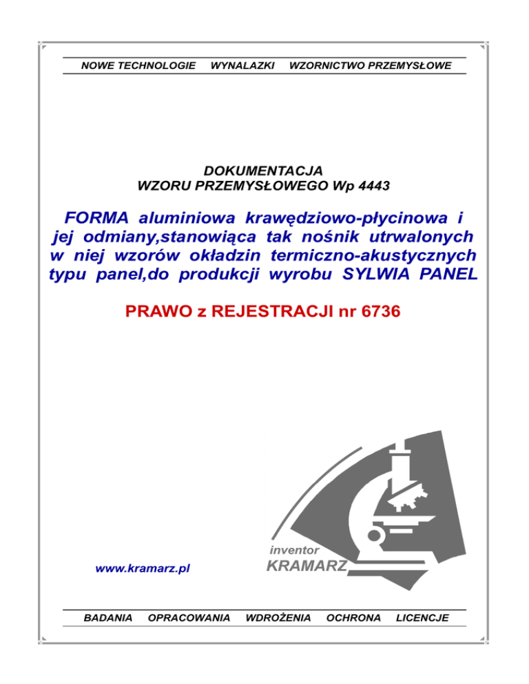 NOWE TECHNOLOGIE WYNALAZKI WZORNICTWO PRZEMYSŁOWE DOKUMENTACJA WZORU PRZEMYSŁOWEGO Wp 4443 FORMA aluminiowa krawędziowo-płycinowa i jej odmiany,stanowiąca tak nośnik utrwalonych w niej wzorów okładzin termiczno-akustycznych typu panel,do produkcji wyrobu SYLWIA PANEL PRAWO z REJESTRACJI nr 6736 www.kramarz.pl BADANIA OPRACOWANIA WDROśENIA OCHRONA LICENCJE Dokumentacja zgł. wzoru przemysłowego - Wp 4443 - z dnia 06.11.2003r.- opis - str.1 Forma aluminiowa krawędziowo-płycinowa i jej odmiany, stanowiąca tak nośnik utrwalonych w niej wzorów okładzin termiczno-akustycznych typu panel, do produkcji wyrobu "SYLWIA PANEL" Przedmiotem wzoru przemysłowego jest jego siedem (7) odmian formy aluminiowo-płycinowej przeznaczonej do przemysłowej i wysoce wydajnej produkcji wyrobu w postaci okładziny ściennej typu panel o nazwie handlowej tego wyrobu "Sylwia Panel". Formy w ich kolejnych odmianach, stanowią i są nośnikiem tak utrwalonych w nich wzorów róŜnych okładzin ściennych albo/i innych typu panel skończony w postaci listwy lub kasetonu o funkcji uŜytkowej termicznej,akustycznej i wykończeniowej. Formy w swych odmianach i konstrukcji dzielą się na jednostronne i dwustronne oraz proste i łamane zawiasami i róŜnie. Formy jednostronne posiadają jednostronnie utrwalony w niej wzór jednego wyrobu natomiast dwustronne,dwustronnie utrwalony w niej wzór dwóch róŜnych wyrobów lub dwóch tak samych. Formy jedno lub dwustronne proste pozwalają na/i produkcję z nich jednego lub dwóch wzorów panela,listwy lub kasetona. Formy łamane,zawiasami wzdłuŜnie,skośnie i poprzecznie tak rozmieszczonymi w miejscu przecięcia form pozwalają w zaleŜności od utrwalonego w niej wzoru tak powstałego przecinaniem i łączeniem płyciny formy,na wyprasowanie i usunięcie z niej kaŜdego wzoru wyrobu, zwłaszcza formowanego czterostronnie lub sześciostronnie tak z okleinowaniem jak i bez. Formy jednostronne proste lub łamane składane z dwóch tak/i prostych,łamanych lub przemiennie stronami z wzorem utrwalonym do siebie tworzą nową postać formy i wzoru w niej utrwalonego o kształcie zamkniętego lub półzamkniętego naczynia.Tak powstałe naczynie z dwóch form (foremników) tworzy trzy następne,kolejne odmiany wzoru formy aluminiowo-płycinowej. Formy w swych odmianach jako wytwór i przedmiot mogą tak/i być wytwarzane w sposób przemysłowy jako kształtowniki lub rzemieślniczy metodą dzielenia i łączenia kształtowników na nowej płycinie,metodą na zawias,metodą na trwałe czy odlewu. Cechą istotną wzoru przemysłowego i jego kolejnych odmian w tym znamiennie ją wyDokumentacja zgł. wzoru przemysłowego - Wp 4443 - z dnia 06.11.2003r.- opis - str.1 PRAWO NR 6736 Wszelkie prawa zastrzeŜone na rzecz Józef Kramarz Dokumentacja zgł. wzoru przemysłowego - Wp 4443 - z dnia 06.11.2003r.- opis - str.2 róŜniającą i odróŜniającą jest kształt wewnętrzny formy jednostronnej, dwustronnej i złoŜonej ustalony linią konturów przekroju poprzecznego form tak zawarty od punktu (a) do punktu (b) podstawy lub wierzchołka formy oraz od punktu (a) poprzez (b i a) do punktu (b) w/i formie złoŜonej z dwóch foremników,tj.form jedno lub dwustronnych. Formy jednostronne i dwustronne korzystnie wykonane są jako kształtowniki aluminiowe w postaci i kształcie listwy szerokości zewnętrznej stałej i długości róŜnej od 2.5 do 6 metrów oraz wysokości róŜnej,zaleŜnej od wykonywanego wyrobu. Formy jednostronne i dwustronne do produkcji kasetonu mają kształt kwadratu,zaleŜny wymiarami zewnętrznymi i wewnętrznymi od wykonywanego nimi wyrobu,wykonywane rzemieślnicze. Tak wykonane formy kształtem i zwłaszcza linią wewnętrzną jej konturów wewnętrznych utrwalają sobą i w sobie jako tzw. nośnik,wzór wykonywanego nią wyrobu w postaci listwy, kasetonu i słuŜą tak do jego kopiowania lub/i zwielokrotnienia. Siedem odmian podstawowych wzoru przemysłowego formy,Fig.1,2,3,4,5,6 i 7 pozwala w zaleŜności od konfiguracji złoŜeń z nich na tworzenie dalszych, minimum trzech odmian ich wzoru. Nadto, płycina kaŜdej z form moŜe być metodą wybrania Fig.3 lub metodą dodania Fig.4 wzbogacona o dodatkową linię,wzór. Ponadto,płycina płaska lub wybrana kaŜdej z form moŜe być i stanowi bazę dla dodawania dodatkowej płyciny (wkładki) tak tworzącej i zmieniającej kształt wewnętrzny formy Fig.6 i 8. Oznacza to,Ŝe odmiany podstawowe wzoru przemysłowego formy w swej uniwersalności pozwalają na produkcję kaŜdego wyrobu w postaci płytki,listwy,kasetona wzbogacanego na swej powierzchni płaskiej dowolnym ornamentem tak wklęsłym jak i wypukłym czy mieszanym wklęsło-wypukłym,podnoszącym jego walor. Nadto, pozwala ją na produkcję w/wwyrobów, tak tapicerowanych. Wzór NR.4 formy jednostronnej,przedstawiony w rysunku Fig.4 o prostej płycinie bez wzbogacenia wykorzystywany był/będzie do produkcji utrwalonego w niej wzoru zdobniczego W 7644 wg. sposobu P 293705 oraz metody P 345226 w/i sposobie P 346435. Dla wzoru wyrobu pt. Płytka panelowa,chronionego świadectwem ochronnym NR 12167 i autorskim NR 5800 o nazwie handlowej w/i czasie obrotu nim SYLWIA PANEL wydano uprawnionemu dwie Oceny Higieniczne Nr B-482/94 przez PZH Dokumentacja zgł. wzoru przemysłowego - Wp 4443 - z dnia 06.11.2003r.- opis - str.2 PRAWO NR 6736 Wszelkie prawa zastrzeŜone na rzecz Józef Kramarz Dokumentacja zgł. wzoru przemysłowego - Wp 4443 - z dnia 06.11.2003r.- opis - str.3 dla okładziny ściennej SYLWIA PANEL w okleinach z drzew oraz sztucznej skóry. Wzór NR.1 formy jednostronnej, przedstawiony w rysunku Fig.1 jako kształtownik,tak stanowiący tajemnicę wykonywany był i będzie wg.matrycy A-6298 uprawnionego jej twórcy/właściciela. Wzór NR. 7 formy dwustronnej, przedstawiony w/na rysunku Fig.7 jako kształtownik,tak stanowiący tajemnicę,wykonywany był i będzie wg.matrycy A6365,uprawnionego jej twórcy/właściciela. Wzór NR.1 fo