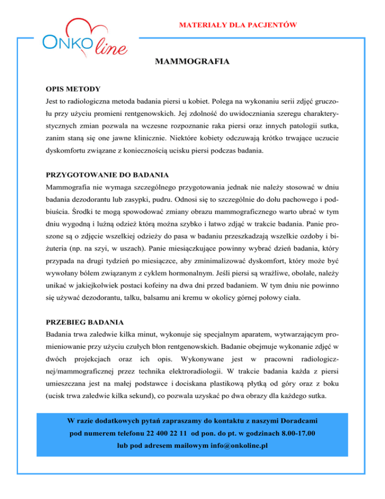 MATERIAŁY DLA PACJENTÓW MAMMOGRAFIA OPIS METODY Jest to radiologiczna metoda badania piersi u kobiet. Polega na wykonaniu serii zdjęć gruczołu przy użyciu promieni rentgenowskich. Jej zdolność do uwidoczniania szeregu charakterystycznych zmian pozwala na wczesne rozpoznanie raka piersi oraz innych patologii sutka, zanim staną się one jawne klinicznie. Niektóre kobiety odczuwają krótko trwające uczucie dyskomfortu związane z koniecznością ucisku piersi podczas badania. PRZYGOTOWANIE DO BADANIA Mammografia nie wymaga szczególnego przygotowania jednak nie należy stosować w dniu badania dezodorantu lub zasypki, pudru. Odnosi się to szczególnie do dołu pachowego i podbiuścia. Środki te mogą spowodować zmiany obrazu mammograficznego warto ubrać w tym dniu wygodną i luźną odzież którą można szybko i łatwo zdjąć w trakcie badania. Panie proszone są o zdjęcie wszelkiej odzieży do pasa w badaniu przeszkadzają wszelkie ozdoby i biżuteria (np. na szyi, w uszach). Panie miesiączkujące powinny wybrać dzień badania, który przypada na drugi tydzień po miesiączce, aby zminimalizować dyskomfort, który może być wywołany bólem związanym z cyklem hormonalnym. Jeśli piersi są wrażliwe, obolałe, należy unikać w jakiejkolwiek postaci kofeiny na dwa dni przed badaniem. W tym dniu nie powinno się używać dezodorantu, talku, balsamu ani kremu w okolicy górnej połowy ciała. PRZEBIEG BADANIA Badania trwa zaledwie kilka minut, wykonuje się specjalnym aparatem, wytwarzającym promieniowanie przy użyciu czułych błon rentgenowskich. Badanie obejmuje wykonanie zdjęć w dwóch projekcjach oraz ich opis. Wykonywane jest w pracowni radiologicz- nej/mammograficznej przez technika elektroradiologii. W trakcie badania każda z piersi umieszczana jest na małej podstawce i dociskana plastikową płytką od góry oraz z boku (ucisk trwa zaledwie kilka sekund), co pozwala uzyskać po dwa obrazy dla każdego sutka. W razie dodatkowych pytań zapraszamy do kontaktu z naszymi Doradcami pod numerem telefonu 22 400 22 11 od pon. do pt. w godzinach 8.00-17.00 lub pod adresem mailowym [email protected]