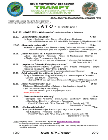 ODZNACZONY ZŁOTĄ HONOROWĄ ODZNAKĄ PTTK „Trzeba wejść na górę dla piękna doliny poznania trzeba się zmęczyć by poznać smak wędrowania…” LATO– III kwartał 2012 r. 04-21.07. „OWRP 2012 – Wielkopolska” z zakończeniem w Lubaszu 08.07. „Szlak Grot Mechowskich” Krokowa – Karlikowo – Jez. Dobre – Domatowo – Mechowo 17 km Zbiórka PKS Wejherowo godz. 8,15 (dojazd SKM Gdańsk godz. 7,00 lub Regio godz. 7,13 z przesiadką w Gdyni) 22.07. „Rezerwaty nadmorskie” 13 km Krokowa – Łętowice – rez. Zielone – Szary Dwór – rez. Widowo – Karwia Zbiórka PKS Wejherowo godz. 8,15 (dojazd SKM Gdańsk godz. 7,00 lub Regio godz. 7,13 z przesiadką w Gdyni) 05.08. „Szlak Kaszubski im. J. Rydzkowskiego” 21 km Lubnia – Małe Gliśno – Kosobudy – Kinice – rz. Niechwaszcz – Czarniż – Giełdon – jez. Trzemeszno – Męcikał Zbiórka ZTM 169 przy pętli tram. w Oliwie godz. 7,15 (odjazd PKP Gdynia godz. 7,40 Gd. Osowa godz. 8,01) 12.08. „Wycieczka Żuławską Koleją Wąskotorową” Trasa: Nowy Dwór Gdański – Cyganek – Tujsk – Stegna – Mikoszewo – Stegna – Sztutowo (muzeum) – Nowy Dwór Gdański Zapisy prowadzi kol. Jarek Kutkowski na wycieczkach i zebraniach klubowych 19.08. „Szlak zaborski i literacki im. A. Łajming” 22 km Brusy – Zalesie – rez. Kręgów Kamiennych – Leśno – Wysoka Zaborska – Dunajki – jez. Rzuno – Dziemiany Zbiórka ZTM 169 przy pętli tram. w Oliwie godz. 7,15 (odjazd PKP Gdynia godz. 7,40 Gd. Osowa godz. 8,01) 02.09. „Szlak Kopernikowski” cz. 2 Milejewo – Milejewska Góra – Rakowo – Jez. Martwe – Jagodnik – jez. Goplanica – Dąbrowa – Elbląg 20 km Zbiórka PKS Gdańsk godz. 9,30 (odjazd godz. 9,50) Uwaga: późny powrót 16.09. „Elektrownie wodne Wierzycy” 21 km Starogard – leśn. Kochanka – elektr. Owidz – Barchnowy – elektr. Kolińcz – Klonówka – Brzeźno – Helenowo – Szpęgawsk Wyjazd PKP Gdynia godz. 7,21, z Oliwy godz. 7,38 i z Gdańska godz. 7,53 (z przesiadką w Tczewie) 30.09. „Kociewskie jeziorka” Pinczyn – Pałubinek – jez. Pani – Lipski Młyn – Jez. Lipskie – Jez. Kazubskie – Płociczno – Kaliska 17 km Wyjazd PKP Gdynia godz. 7,21, z Oliwy godz. 7,38 i z Gdańska godz. 7,53 (z przesiadką w Tczewie) Uwaga: Programy imprez i sprawozdania z wycieczek: http://pttk-trampy.ovh.org/ Uczestnicy ubezpieczają się we własnym zakresie. Ze względu na możliwe zmiany w rozkładach jazdy PKP i PKS prosimy o sprawdzanie aktualnych terminów wyjazdów. 1969 43 lata KTP „Trampy” 2012