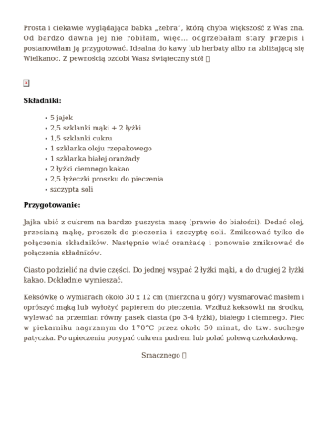 Prosta i ciekawie wyglądająca babka „zebra”, którą chyba większość z Was zna. Od bardzo dawna jej nie robiłam, więc… odgrzebałam stary przepis i postanowiłam ją przygotować. Idealna do kawy lub herbaty albo na zbliżającą się Wielkanoc. Z pewnością ozdobi Wasz świąteczny stół Składniki: 5 jajek 2,5 szklanki mąki + 2 łyżki 1,5 szklanki cukru 1 szklanka oleju rzepakowego 1 szklanka białej oranżady 2 łyżki ciemnego kakao 2,5 łyżeczki proszku do pieczenia szczypta soli Przygotowanie: Jajka ubić z cukrem na bardzo puszysta masę (prawie do białości). Dodać olej, przesianą mąkę, proszek do pieczenia i szczyptę soli. Zmiksować tylko do połączenia składników. Następnie wlać oranżadę i ponownie zmiksować do połączenia składników. Ciasto podzielić na dwie części. Do jednej wsypać 2 łyżki mąki, a do drugiej 2 łyżki kakao. Dokładnie wymieszać. Keksówkę o wymiarach około 30 x 12 cm (mierzona u góry) wysmarować masłem i oprószyć mąką lub wyłożyć papierem do pieczenia. Wzdłuż keksówki na środku, wylewać na przemian równy pasek ciasta (po 3-4 łyżki), białego i ciemnego. Piec w piekarniku nagrzanym do 170°C przez około 50 minut, do tzw. suchego patyczka. Po upieczeniu posypać cukrem pudrem lub polać polewą czekoladową. Smacznego Ciastka z gotowego ciasta francuskiego nadziewane jabłkami, uprażonymi mielonymi migdałami, cynamonem i posypane płatkami migdałowymi. Ekspresowy i pyszny deser do kawy lub herbaty. Polecam Składniki (na 16 ciastek): 3 duże jabłka (użyłam jonagold) 2 opakowania ciasta francuskiego (2 x 275 g) 4 łyżki mielonych migdałów 2 łyżki płatków migdałowych 1 łyżka miodu 1 płaska łyżeczka cynamonu 1 jajko Przygotowanie: Jabłka obrać, pokroić w drobną kostkę i przełożyć do miseczki. Dodać cynamon, miód i uprażone na suchej patelni mielone migdały. Wymieszać. Jeśli jabłka są mało słodkie dodać więcej miodu. Każdy płat ciasta francuskiego pokroić na 8 kwadratów. Po jednej stronie każdego kwadratu zrobić po kilka nacięć. Nałożyć farsz i przykryć ponacinaną stroną (jak kołderką ). Widelcem docisnąć brzegi ciasta i przełożyć na blaszkę wyłożoną papierem do pieczenia. Za pomocą pędzelka każde ciastko posmarować rozbełtanym jajkiem i posypać płatkami migdałowymi. Piec w piekarniku nagrzanym do 200°C przez około 14 minut. Smacznego Brownie to klasyczne amerykańskie ciasto. Bardzo proste do przygotowania i co najważniejsze zawsze wychodzi Jest idealne dla miłośników czekolady, którzy lubią ciężkie, gliniaste i mocno czekoladowe ciasta. Jak dla mnie… Pycha! Składniki: 250 g masła 300 g gorzkiej czekolady 70% 5 dużych jajek 1 i 1/2 szklanki cukru 1 i 1/3 szklanki mąki pszennej szczypta soli 1/2 szklanki orzechów włoskich Przygotowanie: W rondelku roztopić masło, wyłączyć gaz i dodać posiekaną lub połamaną czekoladę. Mieszać do uzyskania gładkiej konsystencji. Jajka zmiksować z cukrem i szczyptą soli, ale tylko do połączenia składników. Dodać mąkę i wymieszać. Następnie wlać roztopioną czekoladę z masłem i zmiksować, aż składniki się połączą. Wsypać posiekane orzechy włoskie i wymieszać. Blaszkę o wymiarach 21 x 31 wyłożyć papierem do pieczenia i przełożyć ciasto. Wyrównać. Piec w piekarniku nagrzanym do 170°C przez 20-25 minut. Wyjąć, przestudzić i pokroić na kwadraty. Smacznego Dzisiaj walentynkowe bajaderki czyli ciastka… z resztek ciast. W planie miałam zupełnie coś innego, niestety… zapomniałam o biszkopcie w piekarniku i go przesuszyłam. Ale nie ma tego złego, co by na dobre nie wyszło Rozkruszyłam wyschnięty biszkopt, dodałam likier amaretto, roztopioną białą czekoladę, trochę serka mascarpone i tak powstały bajaderki na Walentynki Składniki: 2 szklanki pokruszonego suchego biszkoptu lub ciastek, resztek innych ciast (bez kremów, galaretek, owoców) 4 łyżki likieru amaretto 50 g białej czekolady 1 łyżka serka mascarpone czerwony barwnik spożywczy migdały Do obtoczenia: wiórki kokosowe, płatki migdałowe lub posypka Przygotowanie: Czekoladą roztopić w kąpieli wodnej. Ciasto drobno pokruszyć i przełożyć do miseczki. Dodać roztopioną czekoladę, serek mascarpone i likier amaretto. Ugnieść na jednolita masę. Jeśli bajaderki okażą się za miękkie należy dodać więcej pokruszonego ciasta. Jeśli będą za suche, więcej serka mascarpone lub amaretto. Wszystko zależy od tego, jakich resztek ciast użyjecie. Do przygotowania moich bajaderek użyłam czerwonego biszkoptu (zabarwionego czerwonym barwnikiem spożywczym), ale równie dobrze można dodać barwnik w trakcie ugniatania ciasta. Z gotowej masy uformować kulki wielkości orzecha włoskiego, do każdej wkładając po jednym migdale. Obtoczyć w wiórkach kokosowych, posypce lub płatkach migdałowych. Można też obtoczyć najpierw w polewie czekoladowej, a później w posypkach. Schłodzić. Smacznego Pyszne maślane tartaletki wypełnione kremem z serka mascarpone, dojrzałego mango i odrobiny soku z limonki. Schłodzone smakują wyśmienicie… Udekorowałam je małymi, marcepanowymi bombkami oblanymi białą czekoladą i posypanymi cukrowym maczkiem – jeszcze świątecznie Składniki (na około 12 tartaletek): Kruche ciasto: 1 i 1/2 szklanki mąki 120 g masła 2 łyżki cukru pudru 2 żółtka 1/4 łyżeczki proszku do pieczenia „Delecta” szczypta soli Krem: 250 g serka mascarpone 1 średnie mango (dojrzałe!) 3 łyżki cukru pudru sok z 1/2 limonki Bombki marcepanowe: około 150 g masy marcepanowej 100 g białej czekolady 1 łyżeczka masła maczek tutti frutti „Delecta” maczek mango „Delecta” maczek truskawkowy „Delecta” kuleczki zbożowe w różowej skorupce „Delecta” Przygotowanie: Kruche ciasto: Do miski przesiewamy mąkę, dodajemy sól, cukier puder, proszek do pieczenia i żółtka. Dokładamy masło i siekamy na malutkie k
