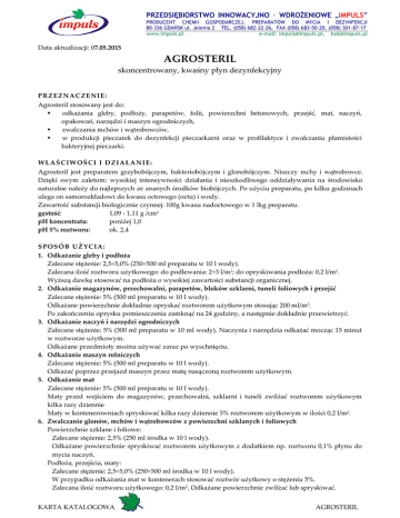 PRZEDSIĘBIORSTWO INNOWACYJNO - WDROŻENIOWE „IMPULS” PRODUCENT CHEMII GOSPODARCZEJ, PREPARATÓW DO MYCIA I DEZYNFEKCJI 80-336 GDAŃSK ul. Jelenia 2 TEL. (058) 682-22-26, FAX (058) 683-50-20, (058) 301-87-17 www.impuls.pl e-mail: [email protected], [email protected] Data aktualizacji: 07.05.2015 AGROSTERIL skoncentrowany, kwaśny płyn dezynfekcyjny P R Z E ZN A C Z E NI E: Agrosteril stosowany jest do: odkażania gleby, podłoży, parapetów, folii, powierzchni betonowych, przejść, mat, naczyń, opakowań, narzędzi i maszyn ogrodniczych, zwalczania mchów i wątrobowców, w produkcji pieczarek do dezynfekcji pieczarkarni oraz w profilaktyce i zwalczaniu plamistości bakteryjnej pieczarki. W ŁA Ś C I W OŚ C I I D Z I A ŁA N I E: Agrosteril jest preparatem grzybobójczym, bakteriobójczym i glonobójczym. Niszczy mchy i wątrobowce. Dzięki swym zaletom: wysokiej intensywności działania i nieszkodliwego oddziaływania na środowisko naturalne należy do najlepszych ze znanych środków biobójczych. Po użyciu preparatu, po kilku godzinach ulega on samorozkładowi do kwasu octowego (octu) i wody. Zawartość substancji biologicznie czynnej: 100g kwasu nadoctowego w 1 lkg preparatu. gęstość: 1,09 - 1,11 g /cm3 pH koncentratu: poniżej 1,0 pH 5% roztworu: ok. 2,4 S P OS Ó B U Ż YC IA : 1. Odkażanie gleby i podłoża Zalecane stężenie: 2,5÷5,0% (250÷500 ml preparatu w 10 l wody). Zalecana ilość roztworu użytkowego: do podlewania: 2÷3 l/m3; do opryskiwania podłoża: 0,2 l/m2. Wyższą dawkę stosować na podłoża o wysokiej zawartości substancji organicznej. 2. Odkażanie magazynów, przechowalni, parapetów, bloków szklarni, tuneli foliowych i przejść Zalecane stężenie: 5% (500 ml preparatu w 10 l wody). Odkażane powierzchnie dokładnie opryskać roztworem użytkowym stosując 200 ml/m2. Po zakończeniu oprysku pomieszczenia zamknąć na 24 godziny, a następnie dokładnie przewietrzyć. 3. Odkażanie naczyń i narzędzi ogrodniczych Zalecane stężenie: 5% (500 ml preparatu w 10 ml wody). Naczynia i narzędzia odkażać mocząc 15 minut w roztworze użytkowym. Odkażane przedmioty można używać zaraz po wyschnięciu. 4. Odkażanie maszyn rolniczych Zalecane stężenie: 5% (500 ml preparatu w 10 l wody). Odkażać poprzez przejazd maszyn przez matę nasączoną roztworem użytkowym. 5. Odkażanie mat Zalecane stężenie: 5% (500 ml preparatu w 10 l wody). Maty przed wejściem do magazynów, przechowalni, szklarni i tuneli zwilżać roztworem użytkowym kilka razy dziennie Maty w kontenerowniach spryskiwać kilka razy dziennie 5% roztworem użytkowym w ilości 0,2 l/m2. 6. Zwalczanie glonów, mchów i wątrobowców z powierzchni szklanych i foliowych Powierzchnie szklane i foliowe: Zalecane stężenie: 2,5% (250 ml środka w 10 l wody). Odkażane powierzchnie spryskiwać roztworem użytkowym z dodatkiem np. roztworu 0,1% płynu do mycia naczyń. Podłoża, przejścia, maty: Zalecane stężenie: 2,5÷5,0% (250÷500 ml środka w 10 l wody). W przypadku odkażania mat w kontenerach stosować roztwór użytkowy o stężeniu 5%. Zalecana ilość roztworu użytkowego: 0,2 l/m2. Odkażane powierzchnie zwilżać lub spryskiwać. KARTA KATALOGOWA AGROSTERIL PRZEDSIĘBIORSTWO INNOWACYJNO - WDROŻENIOWE „IMPULS” PRODUCENT CHEMII GOSPODARCZEJ, PREPARATÓW DO MYCIA I DEZYNFEKCJI 80-336 GDAŃSK ul. Jelenia 2 TEL. (058) 682-22-26, FAX (058) 683-50-20, (058) 301-87-17 www.impuls.pl e-mail: [email protected], [email protected] 7. Dezynfekcja ogólna pieczarkarni Zalecane stężenie AGROSTERILU: 3% (300 ml preparatu w 10l wody). Powierzchnie, narzędzia, szafy do szczepień zwilżać lub spryskiwać trzykrotnie. Czas kontaktu roztworu użytkowego z dezynfekowanymi powierzchniami powinien wynosić minimum 30 minut. Odkażone przedmioty przepłukać wodą wodociągową i zabezpieczyć przed zakażeniem wtórnym. Wycieraczki, maty znajdujące się przed wejściem do komór uprawowych nasączać kilka razy dziennie. Odkażaną płytę fermentacyjną nawilżać lub spryskiwać tak często, aby przez minimum 60 minut była pokryta roztworem preparatu. Opakowanie przeznaczone do zbierania i krótkotrwałego przechowywania pieczarek przed odkażaniem wymyć wodą z detergentem i wysuszyć, następnie spryskać je lub zanurzyć w roztworze użytkowym. Do tej samej serii opakowań stosować zamiennie wymienione sposoby. Regularne stosowanie preparatu do dezynfekcji ogólnej pieczarkarni zapobiega rozwijaniu się chorób bakteryjnych i grzybowych pieczarek. Roztworów użytkowych nie wolno stosować bezpośrednio na owocniki pieczarek. PRZYGOTOWANIE ROZTWORU UŻYTKOWEGO: Odmierzoną ilość produktu wlać do zbiornika opryskiwacza napełnionego częściowo wodą, uzupełnić wodę do potrzebnej ilości i wymieszać hydraulicznie lub mechanicznie. Roztwory użytkowe sporządzać bezpośrednio przed użyciem. Roztwory użytkowe przechowywane w czystych pojemnikach są trwałe przez 12 godzin. WA RU NK I B E ZP I EC Z E ŃS TW A : Informacje dotyczące bezpiecznego stosowania preparatu oraz jego wpływu na środowisko naturalne umieszczone są na etykiecie i w karcie charakterystyki. P R Z EC H OW Y WA N I E: przechowywać pod zamknięciem i chronić przed dziećmi przechowywać w temperaturze 0-30°C w dobrze wentylowanym miejscu w oryginalnych opakowaniach z zaworem odpowietrzającym przechowywać z dala od żywności, napojów i pasz, materiałów palnych T RW A Ł OŚ Ć: 6 miesięcy od daty produkcji OP A KO WA N IA : Butelki 1kg, kanistry z tworzyw sztucznych: 5kg i 20kg DO KU ME N T Y: pozwolenie Ministra Zdrowia na obrót produktem biobójczym nr 1118/04 karta charakterystyki KARTA KATALOGOWA AGROSTERIL