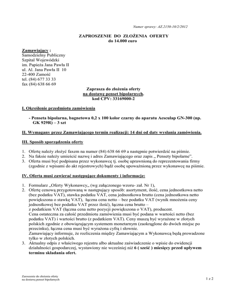 Numer sprawy: AZ.2150-10/2/2012 ZAPROSZENIE DO ZŁOŻENIA OFERTY do 14.000 euro Zamawiający : Samodzielny Publiczny Szpital Wojewódzki im. Papieża Jana Pawła II ul. Al. Jana Pawła II 10 22-400 Zamość tel. (84) 677 33 33 fax (84) 638 66 69 Zaprasza do złożenia oferty na dostawę penset bipolarnych. kod CPV: 33169000-2 I. Określenie przedmiotu zamówienia - Penseta bipolarna, bagnetowa 0,2 x 100 kolor czarny do aparatu Aesculap GN-300 (np. GK 929R) – 3 szt II. Wymagany przez Zamawiającego termin realizacji: 14 dni od daty wysłania zamówienia. III. Sposób sporządzenia oferty 1. Ofertę należy złożyć faxem na numer (84) 638 66 69 a następnie potwierdzić na piśmie. 2. Na faksie należy umieścić nazwę i adres Zamawiającego oraz zapis „ Pensety bipolarne”. 3. Oferta musi być podpisana przez wykonawcę tj. osobę uprawnioną do reprezentowania firmy (zgodnie z wpisami do akt rejestrowych) bądź osobę upoważnioną przez wykonawcę na piśmie. IV. Oferta musi zawierać następujące dokumenty i informacje: 1. Formularz „Oferty Wykonawcy„ (wg załączonego wzoru- zał. Nr 1), 2. Ofertę cenową przygotowaną w następujący sposób: asortyment, ilość, cena jednostkowa netto (bez podatku VAT), stawka podatku VAT, cena jednostkowa brutto (cena jednostkowa netto powiększona o stawkę VAT), łączna cena netto – bez podatku VAT (wynik mnożenia ceny jednostkowej bez podatku VAT przez ilość), łączna cena brutto – z podatkiem VAT (łączna cena netto pozycji powiększona o VAT), producent. Cena ostateczna za całość przedmiotu zamówienia musi być podana w wartości netto (bez podatku VAT) i wartości brutto (z podatkiem VAT). Ceny muszą być wyrażone w złotych polskich zgodnie z obowiązującym systemem monetarnym (zaokrąglone do dwóch miejsc po przecinku), łączna cena musi być wyrażona cyfrą i słownie. Zamawiający informuje, że rozliczenia między Zamawiającym a Wykonawcą będą prowadzone tylko w złotych polskich. 3. Aktualny odpis z właściwego rejestru albo aktualne zaświadczenie o wpisie do ewidencji działalności gospodarczej, wystawiony nie wcześniej niż 6 ( sześć ) miesięcy przed upływem terminu składania ofert. Zaroszenie do złożenia oferty na dostawę penset bipolarnych 1z2 V. Termin złożenia oferty: 12 czerwca 2012r. VI. Osobami uprawnionymi do kontaktów z Wykonawcami są: - w sprawach merytorycznych – mgr Irma Adamczyk tel. (84)677 38 59, - w sprawach formalnych – mgr Wojciech Michoński, tel.(84) 677 32 78. VII. Przy wyborze oferty Zamawiający będzie kierował się kryterium: cena – 100 % . VIII. Ceny podane przez Wykonawcę nie mogą ulec podwyższeniu przez okres obowiązywania zamówienia. IX. Informacja o wyborze oferty zostanie zamieszczona na stronie internetowej Szpitala. X. Po wyborze najkorzystniejszej oferty Zamawiający wyśle do Wykonawcy zamówienie. Załączniki: 1. 2. Formularz oferty Wykonawcy Formularz oferty cenowej Z-ca Dyrektora Samodzielnego Publicznego Szpitala Wojewódzkiego Im. Papieża Jana Pawła II w Zamościu Ds. Administracyjnych Mgr inż. Bernarda Petryk Zaroszenie do złożenia oferty na dostawę penset bipolarnych 2z2 Załącznik Nr 1 do zaproszenia OFERTA WYKONAWCY Dane dotyczące Wykonawcy: Dane dotyczące Zamawiającego: Nazwa: ...................................................................... Nazwa: Samodzielny Publiczny Szpital Wojewódzki im Papieża Jana Pawła II Siedziba (dokładny adres): ....................................... Adres: ul. Aleje Jana Pawła II 10 22-400 Zamość ..................................................................................... Numer telefonu : ........................................................ Numer telefonu: (84) 677 33 33 Numer faxu : ......................................................... Numer faxu: (84) 638 66 69 Numer NIP : ......................................................... Numer NIP: 922-22-92-491 Zobowiązania wykonawcy: 1. Nawiązując do zaproszenia do złożenia oferty (numer sprawy: AZ.2150-10/2/2012) na dostawę penset bipolarnych oferuję wykonanie przedmiotu zamówienia za cenę: a) netto: ................................zł (słownie: ........................................................................................ ........................................................................................................................złotych) 2. stawka podatku VAT: ................... % c) brutto: ..............................zł (słownie: ......................................................................................... ........................................................................................................................złotych). 3. Oświadczam, że zapoznałem się z opisem przedmiotu zamówienia i nie wnoszę do niego zastrzeżeń. 4. Oferuję termin płatności ....... dni licząc od daty otrzymania przez Zamawiającego faktury VAT (minimalny wymagany przez Zamawiającego – 30 dni). 5. Oświadczam, że oferowane pensety bipolarne spełniają warunki techniczne określone w pkt. I zaproszenia. 6. Oświadczam, że oferowane pensety bipolarne są kompatybilne z aparatem Aesculap GN-300. 7. Oświadczam, że oferowany przedmiot zamówienia spełnia wymogi określone w przepisach obowiązującego prawa, jest bezpieczny i dopuszczony do używania na terenie Polski. 8. Oświadczam, że na oferowany przedmiot zamówienia (pensety bipolarne) udzielam ....... miesięcy gwarancji licząc od dnia dostawy (minimalny wymagany przez Zamawiającego – 24 miesiące). 9. Załączniki: - oferta cenowa Aktualny odpis z właściwego rejestru albo aktualne zaświadczenie o wpisie do ewidencji działalności gospodarczej, wystawiony nie wcześniej niż 6 ( sześć ) miesięcy przed upływem terminu składania ofert ................................dnia................... .................................................. (podpis osoby uprawnionej lub upoważnionej*) • n