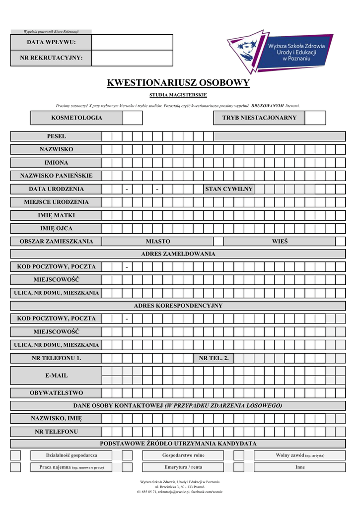 KWESTIONARIUSZ OSOBOWY - Wyższa Szkoła Zdrowia, Urody i