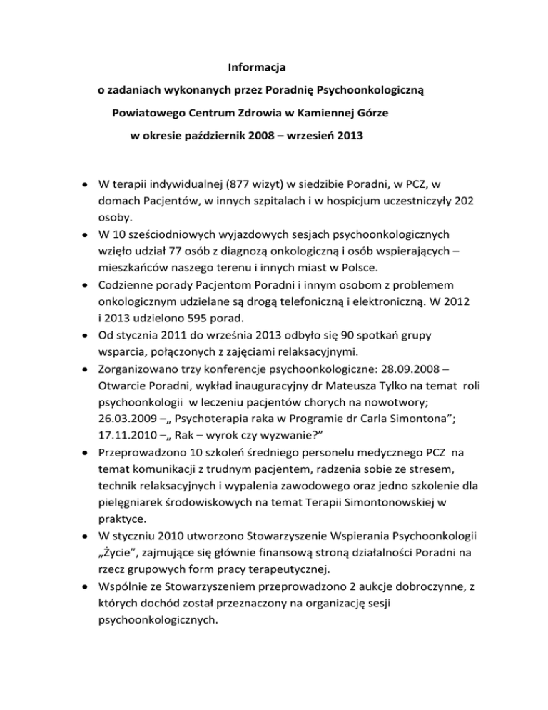 Informacja o zadaniach wykonanych przez Poradnię Psychoonkologiczną Powiatowego Centrum Zdrowia w Kamiennej Górze w okresie październik 2008 – wrzesień 2013 W terapii indywidualnej (877 wizyt) w siedzibie Poradni, w PCZ, w domach Pacjentów, w innych szpitalach i w hospicjum uczestniczyły 202 osoby. W 10 sześciodniowych wyjazdowych sesjach psychoonkologicznych wzięło udział 77 osób z diagnozą onkologiczną i osób wspierających – mieszkańców naszego terenu i innych miast w Polsce. Codzienne porady Pacjentom Poradni i innym osobom z problemem onkologicznym udzielane są drogą telefoniczną i elektroniczną. W 2012 i 2013 udzielono 595 porad. Od stycznia 2011 do września 2013 odbyło się 90 spotkań grupy wsparcia, połączonych z zajęciami relaksacyjnymi. Zorganizowano trzy konferencje psychoonkologiczne: 28.09.2008 – Otwarcie Poradni, wykład inauguracyjny dr Mateusza Tylko na temat roli psychoonkologii w leczeniu pacjentów chorych na nowotwory; 26.03.2009 –„ Psychoterapia raka w Programie dr Carla Simontona”; 17.11.2010 –„ Rak – wyrok czy wyzwanie?” Przeprowadzono 10 szkoleń średniego personelu medycznego PCZ na temat komunikacji z trudnym pacjentem, radzenia sobie ze stresem, technik relaksacyjnych i wypalenia zawodowego oraz jedno szkolenie dla pielęgniarek środowiskowych na temat Terapii Simontonowskiej w praktyce. W styczniu 2010 utworzono Stowarzyszenie Wspierania Psychoonkologii „Życie”, zajmujące się głównie finansową stroną działalności Poradni na rzecz grupowych form pracy terapeutycznej. Wspólnie ze Stowarzyszeniem przeprowadzono 2 aukcje dobroczynne, z których dochód został przeznaczony na organizację sesji psychoonkologicznych. Utworzono stronę internetową Stowarzyszenia (WWW.stowarzyszeniezycie.org). Na uznanie zasługuje Pan Patryk Straus, który pomógł w pierwszym etapie pracy i przez rok administrował stronę nieodpłatnie. Wspólnie ze Stowarzyszeniem i z pomocą sponsorów wyremontowano i urządzono w PCZ gabinet psychoonkologiczny. Dzięki współpracy z MG Network w Warszawie oraz darom Państwa Bożeny i Adama Ziemiańskich, zorganizowano w PCZ bibliotekę dla pacjentów, z której korzystają także pielęgniarki. Na oddziale pediatrycznym PCZ pełnione są dyżury wolontariuszek – uczennic szkół gimnazjalnych i Liceum Ogólnokształcącego. Aktualnie grupa wolontariuszek liczy 14 osób. Nawiązano współpracę z Fundacją Simontonowski Instytut Zdrowia, z Dolnośląskim Centrum Psychoonkologii i Rehabilitacji, z Dolnośląskim Centrum Onkologii, z Wojewódzkim Centrum Szpitalnym Kotliny Jeleniogórskiej (dr Kazimierz Pichlak – ordynator oddziału chirurgii onkologicznej jest stałym gościem naszych sesji psychoonkologicznych i aukcji dobroczynnych). Kierownik Poradni uczestniczyła w szkoleniach psychologicznych i psychoonkologicznych, organizowanych przez Fundację Simontonowski Instytut Zdrowia (dwukrotnie Terapia Simontonowska – certyfikacja dyplomu oraz „Racjonalna Terapia Zachowania”), praktykę lekarską dr nauk med. Ilsę Kutchera z Niemiec („Zastosowanie ustawień systemowych w leczeniu chorób somatycznych”) oraz Dolnośląskie Centrum Psychoterapii („Diagnoza i terapia zaburzeń stresu pourazowego u dorosłych”). Wystąpienie Kierownika Poradni z tematem „Psychologiczny wymiar raka i jego znaczenie dla jakości życia osób z diagnozą onkologiczną” na I Międzynarodowym Sympozjum Naukowym we Wrocławiu „Co nowego w pediatrii i onkologii” (2010). Aktualnie z usług Poradni korzysta 20 osób – 9 Pacjentów z diagnozą onkologiczną, 6 osób wspierających oraz 5 Pacjentów uczestniczących w grupie wsparcia i zajęciach relaksacyjnych. Są to mieszkańcy Kamiennej Góry, Marciszowa, Pastewnika, Ciechanowic, Szarocina, Przedwojowa, Lubawki oraz Wałbrzycha, Świerzawy i Jeleniej Góry. Osoby spoza terenu powiatu kamiennogórskiego obowiązuje cennik usług Powiatowego Centrum Zdrowia. Porady telefoniczne i elektroniczne udzielane są regularnie uczestnikom sesji terapeutycznych i osobom zwracającym się o pomoc psychoonkologiczną – mieszkańcom Białegostoku, Warszawy, Krynicy Morskiej, Częstochowy, Opola, Wrocławia, Chocianowa, Jeleniej Góry, Wałbrzycha, Niemiec i Wielkiej Brytanii. Poradnia w mediach ogólnopolskich: TVN Fakty TVP2 – „Pytanie na śniadanie” (dwukrotnie) Radio Tok FM GW, Duży Format GW, edycja wrocławska (trzykrotnie) wrocławski miesięcznik kulturalny „Klatka” Miesięcznik „Dobre Rady” Magazyn o Zdrowiu „VITA” – cykl 9 publikacji na temat „Siła, która może pokonać raka” We wrześniu 2013 otrzymaliśmy zaproszenie do współpracy od Fundacji „Tam i z Powrotem”, działającej na rzecz onkologicznych pacjentów szpitalnych (otrzymaliśmy w darze 360 egz. sześciu tytułów poradników dla osób chorych na raka i ich bliskich) oraz od Ogólnopolskiej Organizacji na rzecz Walki z Rakiem Szyjki Macicy „Kwiat Kobiecości”. Nasi Sponsorzy i Darczyńcy w okresie pięciu lat: Nadleśnictwo Kamienna Góra Tauron EkoEnergia Jelenia góra Energia Pro S.A. Jelenia Góra Jeleniogórskie Kopalnie Surowców Mineralnych Bank Zachodni Kamienna Góra Bank Spółdzielczy Kamienna Góra Kredyt Bank Kamienna Góra Bank Gospodarki Żywnościowej Wałbrzych Nadleśnictwo Jawor Marta Pawłowska, MG Network, Warszawa Bożena i Adam Ziemiańscy Wioletta i Piotr Popowiczowie – Apteka „Remedium” Kamienna Góra Danuta Suska, Tadeusz Suski, Marek Suski – Apteka „Miejska” Kamienna Góra Krystyna Cebula Wałbrzych Beata Kopia – Kawka – Notariusz Kamienna Góra Ireneusz Barciś – Notariusz Kamienna Góra Dr Schneider Automotive Polska sp. z o.o., Radomierz Rotary Club Jelenia Góra „BO – WA – DE” Kamienna góra „Bricomarche” Kamienna Góra „Pagaz” Kamienna Góra „Stef – Bud” Wojcieszów „Sopi” Kamienna Góra „Kamex” Kamienna Góra „M 2 Meble” Lubawka