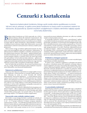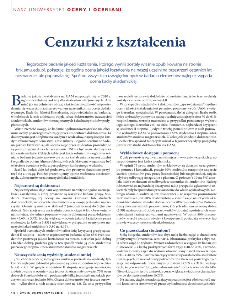 NAsz uNIWersytet OCENY I OCENIANI Cenzurki z kształcenia tegoroczne badanie jakości kształcenia, którego wyniki zostały właśnie opublikowane na stronie brjk.amu.edu.pl, pokazuje, że ogólna ocena jakości kształcenia na naszej uczelni na przestrzeni ostatnich lat nieznacznie, ale poprawiła się. spośród wszystkich uwzględnionych w badaniu elementów najlepiej wypada ocena kadry akademickiej. B adanie jakości kształcenia na UAM rozpoczęło się w 2010 r. ogólnouczelnianą ankietą dla studentów stacjonarnych. Aby mieć jak najpełniejszy obraz, a także dać możliwość wypowiedzenia się wszystkim zainteresowanym uczestnikom procesu dydaktycznego, Rada ds. Jakości Kształcenia, odpowiedzialna za badanie, w kolejnych latach ankietami objęła także doktorantów, nauczycieli akademickich, studentów niestacjonarnych i słuchaczy studiów podyplomowych. Warto zwrócić uwagę, że badanie ogólnouniwersyteckie nie obejmuje oceny poszczególnych zajęć przez studentów i doktorantów. Ta dokonywana jest odrębnie na każdym z wydziałów, najczęściej po każdym zakończonym semestrze. Obie ankiety – ogólnouczelniane badanie jakości kształcenia, jak i ocena zajęć przez studentów prowadzone są przez program Ankieter w systemie USOS i być może stąd wynika ich częste mylenie. Cel tych ankiet jest także odmienny – ogólnouczelniane badanie jedynie zarysowuje obraz kształcenia na naszej uczelni i sygnalizuje potencjalne problemy, których faktyczna waga może być właściwie oceniona tylko z perspektywy konkretnego wydziału. Sześć lat badań daje już podstawy, aby pewnym zjawiskom przyjrzeć się z uwagą. Poniżej prezentujemy opinie studentów stacjonarnych, doktorantów oraz nauczycieli akademickich. Najsurowsi są doktoranci Najszerszy obraz daje nam wspomniana na wstępie ogólna ocena jakości kształcenia, o którą proszone są wszystkie badane grupy. Studenci dokonują tej oceny na swoim kierunku lub studiach doktoranckich, nauczyciele akademiccy – w swojej jednostce macierzystej. Ocenić ją można w skali od 2 (niedostateczna) do 5 (bardzo dobra). Gdy spojrzymy na średnią ocen w ciągu 6 lat, obserwujemy najmniejszą, ale jednak poprawę w ocenie dokonanej przez doktorantów (3,60 na 3,72), trochę większą w ocenie jakości kształcenia przez studentów (z 3,60 na 3,83) i największą w przypadku oceny przez nauczycieli akademickich (z 3,80 na 4,12). Spośród oceniających studentów najbardziej krytyczną grupą są studenci II stopnia – także w tegorocznym badaniu tylko 63% tych studentów postrzega jakość kształcenia na swoim kierunku jako dobrą i bardzo dobrą, podczas gdy w ten sposób widzi ją 73% studentów pierwszego stopnia i 75% studentów studiów magisterskich. Nauczyciele cenią wydziały, studenci mniej Jeśli chodzi o ocenę swojego kierunku w podziale na wydziały, tylko trzy najlepsze jednostki plasowane są przez studentów w przedziale 4,0 – 4,1. W grupie studentów II stopnia występuje największe zróżnicowanie w ocenie – trzy jednostki otrzymały powyżej 75% ocen dobrych i bardzo dobrych, podczas gdy kilka jednostek ma takich pozytywnych ocen jedynie 50%. Ocena doktorantów jest jeszcze surowsza – tylko dwie z nich zostały ocenione na 4,0. Za to w przypadku 14 | ŻYCIE UNIWERSYTECKIE | grudzień 2015 nauczycieli jest prawie dokładnie odwrotnie, tzn. tylko trzy wydziały zostały ocenione poniżej oceny 4,0. W przypadku studentów i doktorantów „sprawdzianem” ogólnej oceny jakości kształcenia jest pytanie o ponowny wybór UAM, swojego kierunku i specjalności. W porównaniu do lat ubiegłych liczba osób, które wybrałyby ponownie naszą uczelnię zmniejszyła się z 70 do 61% respondentów, wzrosła natomiast w przypadku ponownego wyboru tego samego kierunku z 61 na 66%. Ponownie, najbardziej krytyczni są studenci II stopnia – jedynie trochę ponad połowa z nich ponownie wybrałaby UAM, w porównaniu z 63% studentów I stopnia i 66% studentów studiów magisterskich. Z kolei jeśli chodzi o doktorantów, niecałe 60% spośród biorących udział w tegorocznej edycji podjęłoby jeszcze raz studia doktoranckie na UAM. Wykładowcy dostępni i pomocni Z całą pewnością ogniwem najsilniejszym w ocenie wszystkich grup respondentów jest kadra akademicka. W opinii 75 proc. studentów wykładowcy są dostępni oraz gotowi do pomocy i konsultacji, prawie 90% studentów otrzymuje wsparcie swoich opiekunów przy pracy licencjackiej lub magisterskiej, zajęcia i dyżury odbywają się zgodnie z planem. O połowę (z 10 na 5%) zmalała liczba zachowań obraźliwych w stosunku do studentów. Należy odnotować, że najbardziej drastyczne takie przypadki zgłaszane w ankietach były bezpośrednio przekazywane do władz wydziałowych. Dobrego zdania o kadrze są też doktoranci – ze wsparcia promotorów zadowolonych jest 80% doktorantów, a kwalifikacje nauczycieli akademickich dobrze i bardzo dobrze ocenia 70% respondentów. Potwierdzają to oceny samych pracowników, których zdaniem na ocenę dobrą (3,99) można ocenić dobór pracowników do zajęć zgodnie z ich kompetencjami i zainteresowaniami naukowymi. W opinii 80% pracowników wysoki poziom wiedzy i kompetencji posiadają wszyscy lub prawie wszyscy nauczyciele akademiccy. Co przeszkadza studentom? Stałą bolączką studentów jest zbyt mała liczba zajęć o charakterze praktycznym (ćwiczenia, seminaria, laboratoria, praktyki) i zbyt mała oferta zajęć do wyboru. Wzrost zadowolenia w ciągu 6 lat badań jest tu niewielki – z liczby praktycznych form zajęć z 40 do 43%, a w zadowoleniu z oferty zajęć do wyboru obserwujemy nawet niewielki spadek – z 40 na 39%. Bardzo znaczący wzrost wykazała liczba studentów uważających, że nakład pracy potrzebny do zaliczenia poszczególnych zajęć nie odpowiada przyznanym punktom ECTS – z 31% uważających, że „raczej nie” lub „zdecydowanie nie” liczba ta wzrosła do 