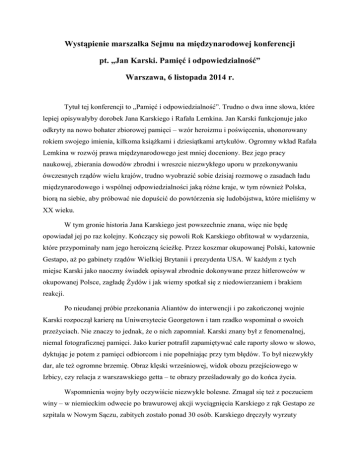 Wystąpienie marszałka Sejmu na międzynarodowej konferencji pt. „Jan Karski. Pamięć i odpowiedzialność” Warszawa, 6 listopada 2014 r. Tytuł tej konferencji to „Pamięć i odpowiedzialność”. Trudno o dwa inne słowa, które lepiej opisywałyby dorobek Jana Karskiego i Rafała Lemkina. Jan Karski funkcjonuje jako odkryty na nowo bohater zbiorowej pamięci – wzór heroizmu i poświęcenia, uhonorowany rokiem swojego imienia, kilkoma książkami i dziesiątkami artykułów. Ogromny wkład Rafała Lemkina w rozwój prawa międzynarodowego jest mniej doceniony. Bez jego pracy naukowej, zbierania dowodów zbrodni i wreszcie niezwykłego uporu w przekonywaniu ówczesnych rządów wielu krajów, trudno wyobrazić sobie dzisiaj rozmowę o zasadach ładu międzynarodowego i wspólnej odpowiedzialności jaką różne kraje, w tym również Polska, biorą na siebie, aby próbować nie dopuścić do powtórzenia się ludobójstwa, które mieliśmy w XX wieku. W tym gronie historia Jana Karskiego jest powszechnie znana, więc nie będę opowiadał jej po raz kolejny. Kończący się powoli Rok Karskiego obfitował w wydarzenia, które przypominały nam jego heroiczną ścieżkę. Przez koszmar okupowanej Polski, katownie Gestapo, aż po gabinety rządów Wielkiej Brytanii i prezydenta USA. W każdym z tych miejsc Karski jako naoczny świadek opisywał zbrodnie dokonywane przez hitlerowców w okupowanej Polsce, zagładę Żydów i jak wiemy spotkał się z niedowierzaniem i brakiem reakcji. Po nieudanej próbie przekonania Aliantów do interwencji i po zakończonej wojnie Karski rozpoczął karierę na Uniwersytecie Georgetown i tam rzadko wspominał o swoich przeżyciach. Nie znaczy to jednak, że o nich zapomniał. Karski znany był z fenomenalnej, niemal fotograficznej pamięci. Jako kurier potrafił zapamiętywać całe raporty słowo w słowo, dyktując je potem z pamięci odbiorcom i nie popełniając przy tym błędów. To był niezwykły dar, ale też ogromne brzemię. Obraz klęski wrześniowej, widok obozu przejściowego w Izbicy, czy relacja z warszawskiego getta – te obrazy prześladowały go do końca życia. Wspomnienia wojny były oczywiście niezwykle bolesne. Zmagał się też z poczuciem winy – w niemieckim odwecie po brawurowej akcji wyciągnięcia Karskiego z rąk Gestapo ze szpitala w Nowym Sączu, zabitych zostało ponad 30 osób. Karskiego dręczyły wyrzuty sumienia, jak wielu milczał przez lata. Dopiero w 1978 r. opowiedział swoją historię w filmie „Shoah”. Z dnia na dzień zyskał ogromne zainteresowanie. Od tego czasu niestrudzenie działał na rzecz zachowania pamięci o Zagładzie, setki razy opowiadając swoją traumatyczną historię i przeżywając ją na nowo. Jan Karski bywa redukowany do roli nieskazitelnego pomnika, osoby pełnej tak nieprawdopodobnej szlachetności i uporu, że łatwiej traktować go jako abstrakcyjną figurę z zamierzchłej przeszłości niż realną postać, ale do tego nie powinniśmy dopuścić. Do dziedzictwa Karskiego, do pamięci o nim i jego czynach należy sięgać jak najczęściej, tak żeby nie mogły zbyt szybko przejść do tej zbyt odległej historii i aby mogły pozostać jako wzór do naśladowania. Rafał Lemkin to wybitny teoretyk prawa, twórca pojęcia ludobójstwo, kilkakrotnie nominowany do Pokojowej Nagrody Nobla, który w przeciwieństwie do Karskiego, jest nadal w Polsce i na świecie szerzej nieznany. Urodził się w 1900 r. w rodzinie żydowskiej i ukończył, tak samo jak Karski, Uniwersytet Jana Kazimierza. Po uzyskaniu dyplomu kontynuował naukę w Berlinie, Heidelbergu i Sorbonie. W 1927 roku uzyskał doktorat z prawa. Obsesyjne myślenie o nienazwanej jeszcze wtedy zbrodni ludobójstwa towarzyszyło mu od dziecięcej lektury „Quo Vadis”, które fascynowało, jeszcze wtedy młodego Lemkina, opisami masakry pierwszych chrześcijan. Przyszły twórca terminu ludobójstwo próbował zrozumieć i zanalizować mechanizmy stojące za okrucieństwem Rzymian. Kolejnym, dużo późniejszym, punktem zwrotnym dla Lemkina, było zabójstwo Taalata Paszy, jednego z architektów rzezi Ormian, przez ormiańskiego zamachowca w 1921 r. Lemkin nie potrafił zrozumieć dlaczego człowiek odpowiedzialny za śmierć setek tysięcy ludzi, chodził wolno, a osoba która targnęła się na jego życie będzie sądzona za morderstwo. W 1933 r. na konferencji Ligii Narodów w Madrycie Lemkin zaprezentował raport, w którym wyróżniał pięć nowych rodzajów zbrodni. Szczególnie ważne miejsce zajmowała nowa definicja „barbarzyństwa”. Według Lemkina było to działanie mające na celu fizyczną eliminację członków konkretnej grupy religijnej lub rasowej, która nie jest elementem tradycyjnie pojmowanych działań wojennych. Wykazał się też niezwykłą jak na owe czasy wyobraźnią, zaliczając na przykład do „barbarzyństwa” niszczenie kultury narodów czy grup etnicznych, w tym kultury materialnej. Lemkin położył podwaliny pod prawo międzynarodowe na podstawie historycznych wydarzeń takich jak rzeź Ormian czy Asyryjczyków. Nie był jednak w stanie przewidzieć, że nadchodzące lata przyniosą ze sobą jeszcze większą tragedię – tragedię Holokaustu. Samemu Lemkinowi w 1940 r. udało się zbiec do USA, ale w Zagładzie zginęła niemal cała jego rodzina. W trakcie pobytu w Stanach Zjednoczonych pracował nad książką „Rządy Państw Osi w okupowanej Europie”. To w tym, wydanym w 1944 r., dziele po raz pierwszy pojawia się termin ludobójstwo definiowany jako „destrukcja narodu lub grupy etnicznej”. Co ciekawe, Lemkin opisywał ludobójstwo nie tylko jako fizyczną eksterminację, ale również starania o całkowite zniszczenie grupy pod względem społecznym, kulturowym lub historycznym. W książce postulował również utworzenie międzynarodowego systemu sprawiedliwości, który ścigałyby i karał osoby odpowiedzialne za tę zbrodnię. Jeszcze w statucie Mię