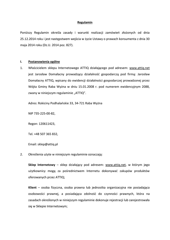 Regulamin Poniższy Regulamin określa zasady i warunki realizacji zamówień złożonych od dnia 25.12.2014 roku i jest następstwem wejścia w życie Ustawy o prawach konsumenta z dnia 30 maja 2014 roku (Dz.U. 2014 poz. 827). I. Postanowienia ogólne 1. Właścicielem sklepu Internetowego ATTIQ działającego pod adresem: www.attiq.net jest Jarosław Domałacny prowadzący działalność gospodarczą pod firmą: Jarosław Domałacny ATTIQ, wpisany do ewidencji działalności gospodarczej prowadzonej przez Wójta Gminy Raba Wyżna w dniu 15.01.2008 r. pod numerem ewidencyjnym 2088, zwany w niniejszym regulaminie „ATTIQ”. Adres: Rokiciny Podhalańskie 33, 34-721 Raba Wyżna NIP 735-225-00-82, Regon: 120611423, Tel. +48 507 365 832, Email: [email protected] 2. Określenia użyte w niniejszym regulaminie oznaczają: Sklep Internetowy – sklep działający pod adresem: www.attiq.net, w którym jego użytkownicy mogą za pośrednictwem Internetu dokonywać zakupów produktów oferowanych przez ATTIQ; Klient – osoba fizyczna, osoba prawna lub jednostka organizacyjna nie posiadająca osobowości prawnej, a posiadająca zdolność do czynności prawnych, która na zasadach określonych w niniejszym regulaminie dokonuje rejestracji lub zarejestrowała się w Sklepie Internetowym; Konsument – Klient będący osobą fizyczną, korzystającą ze Sklepu Internetowego w celu niezwiązanym bezpośrednio z jego działalnością gospodarczą lub zawodową, który na zasadach określonych w niniejszym regulaminie dokonuje rejestracji lub zarejestrował się w Sklepie Internetowym; Dni robocze – wszystkie dni tygodnia od poniedziałku do piątku, z wyłączeniem dni ustawowo wolnych od pracy; Czas realizacji zamówienia – czas, w jakim ATTIQ skompletuje zamówienie i przekaże do wysłania za pośrednictwem poczty lub kuriera, na adres wskazany przez Klienta; Koszyk – element Sklepu Internetowego, za pomocą którego Klient precyzuje szczegóły zamówienia takie jak: ilość produktów, adres dostawy, dane do faktury, sposób dostawy, sposób płatności, itp.; Strona produktowa – strona w Sklepie Internetowym, na której przedstawione są informacje na temat produktu; Dane bilingowe – dane Klienta, w tym jego dane osobowe, pozwalające poprawnie wystawić przez ATTIQ fakturę za wykupione produkty objęte zamówieniem. 3. Regulamin określa prawa i obowiązki Klientów jak również prawa i obowiązki Sprzedawcy jako podmiotu zarządzającego i prowadzącego Sklep. 4. Regulamin jest dostępny w polskiej wersji językowej. 5. Klienci zobowiązani są do przestrzegania autorskich praw majątkowych oraz praw wynikających z rejestracji wynalazków, patentów, znaków towarowych, wzorów użytkowych i przemysłowych. II. Rejestracja i logowanie 1. Warunkiem dokonywania zakupów w Sklepie Internetowym jest dokonanie rejestracji. 2. W celu dokonania rejestracji należy na stronie internetowej www.attiq.net wybrać w zakładce „moje konto” opcję „zarejestruj się”, a następnie wypełnić formularz rejestracyjny podając następujące dane: imię i nazwisko (lub firma), adres e-mail (login), nr telefonu oraz hasło. 3. Założenie konta Klienta jest nieodpłatne. 4. Warunkiem rejestracji jest zapoznanie się i zaakceptowanie niniejszego regulaminu, a także wyrażenie zgody na przetwarzanie przez ATTIQ danych osobowych niezbędnych dla realizacji zamówień składanych w Sklepie Internetowym. 5. Po dokonaniu czynności, o której mowa w ust. 2 ATTIQ prześle na adres e-mail Klienta podany w formularzu rejestracyjnym wiadomość zawierającą link, którego uruchomienie stanowi potwierdzenie rejestracji i kończy procedurę rejestracyjną. 6. Po dokonaniu rejestracji, Klient może zalogować się do Sklepu Internetowego przy pomocy podanych w trakcie rejestracji adresu e-mail jako loginu oraz hasła. 7. Klient nie może przekazywać hasła dostępu do konta w Sklepie internetowym osobom trzecim. 8. Po zalogowaniu Klient w zakładce „Moje konto” może, wypełniając formularz, uzupełnić swoje dane lub dokonać zmiany podanych danych oraz zmiany hasła. 9. Podanie danych adresowych jest konieczne dla realizacji zamówień składanych przez Klienta w Sklepie internetowym. III. Składanie zamówień 1. Klient może składać zamówienia przez 24 godziny na dobę za pośrednictwem strony internetowej www.attiq.net. Klient po zarejestrowaniu się i zalogowaniu składa zamówienie, wskazując na Stronie produkt, którym jest zainteresowany, poprzez uruchomienie linku ukrytego pod polem „Dodaj do koszyka”, a następnie w Koszyku wskazując sposób odbioru i płatności za zamówienie. 2. W zamówieniu (w Koszyku), Klient wskazuje: zamawiany towar i rozmiar produktu, jeżeli produkt oferowany jest w różnych rozmiarach; adres, na jaki ma być dostarczony towar; Dane bilingowe (nieobowiązkowo); sposób dostawy; sposób płatności. 3. Procedura składania zamówienia kończy się w momencie uruchomienia przez Klienta linku ukrytego pod polem „Zamawiam z obowiązkiem zapłaty”. Dokonanie tej czynności oznacza złożenie zamówienia i zawarcie z ATTIQ umowy kupna-sprzedaży produktów objętych zamówieniem. 4. Do momentu uruchomienia przez Klienta linku ukrytego pod polem „Zamawiam z obowiązkiem zapłaty” Klient ma możliwość modyfikacji wprowadzonych danych oraz zawartości Koszyka. W tym celu należy kierować się wyświetlanymi Klientowi komunikatami oraz informacjami dostępnymi na stronie. 5. Klient zobowiązuje się do podania prawdziwych danych. 6. Na adres e-mail wskazany podczas rejestracji ATTIQ wysyła wiadomość potwierdzającą przyjęcie zamówienia do realizacji, zawierającą wszystkie istotne elementy zamówienia, tj: dane Sklepu w tym dokładny adres korespondencyjny, adres e-mail oraz nr telefonu, opis produktu ( np. ilość, kolor, wymiary), jednostkową i łączną cenę wszystkich produktów, cenę zamówienia = cena łączna produktów + koszty w