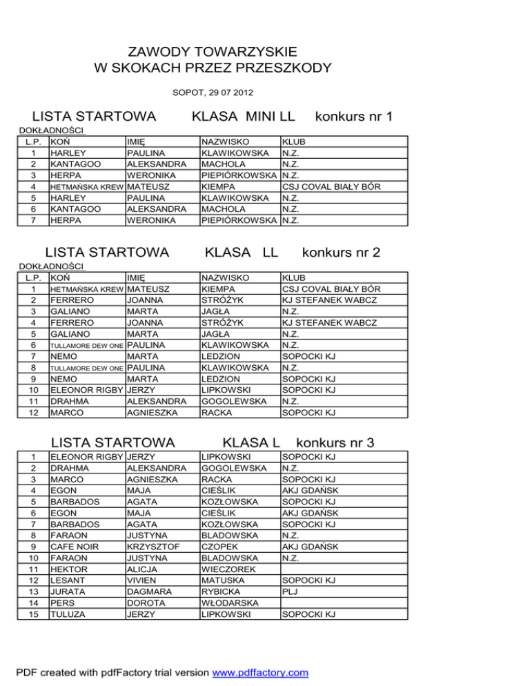 ZAWODY TOWARZYSKIE W SKOKACH PRZEZ PRZESZKODY SOPOT, 29 07 2012 LISTA STARTOWA DOKŁADNOŚCI L.P. KOŃ 1 HARLEY 2 KANTAGOO 3 HERPA 4 HETMAŃSKA KREW 5 HARLEY 6 KANTAGOO 7 HERPA IMIĘ PAULINA ALEKSANDRA WERONIKA MATEUSZ PAULINA ALEKSANDRA WERONIKA LISTA STARTOWA DOKŁADNOŚCI L.P. KOŃ 1 HETMAŃSKA KREW 2 FERRERO 3 GALIANO 4 FERRERO 5 GALIANO 6 TULLAMORE DEW ONE 7 NEMO 8 TULLAMORE DEW ONE 9 NEMO 10 ELEONOR RIGBY 11 DRAHMA 12 MARCO IMIĘ MATEUSZ JOANNA MARTA JOANNA MARTA PAULINA MARTA PAULINA MARTA JERZY ALEKSANDRA AGNIESZKA LISTA STARTOWA 1 2 3 4 5 6 7 8 9 10 11 12 13 14 15 ELEONOR RIGBY DRAHMA MARCO EGON BARBADOS EGON BARBADOS FARAON CAFE NOIR FARAON HEKTOR LESANT JURATA PERS TULUZA JERZY ALEKSANDRA AGNIESZKA MAJA AGATA MAJA AGATA JUSTYNA KRZYSZTOF JUSTYNA ALICJA VIVIEN DAGMARA DOROTA JERZY KLASA MINI LL konkurs nr 1 NAZWISKO KLAWIKOWSKA MACHOLA PIEPIÓRKOWSKA KIEMPA KLAWIKOWSKA MACHOLA PIEPIÓRKOWSKA KLUB N.Z. N.Z. N.Z. CSJ COVAL BIAŁY BÓR N.Z. N.Z. N.Z. KLASA LL konkurs nr 2 NAZWISKO KIEMPA STRÓŻYK JAGŁA STRÓŻYK JAGŁA KLAWIKOWSKA LEDZION KLAWIKOWSKA LEDZION LIPKOWSKI GOGOLEWSKA RACKA KLASA L LIPKOWSKI GOGOLEWSKA RACKA CIEŚLIK KOZŁOWSKA CIEŚLIK KOZŁOWSKA BLADOWSKA CZOPEK BLADOWSKA WIECZOREK MATUSKA RYBICKA WŁODARSKA LIPKOWSKI KLUB CSJ COVAL BIAŁY BÓR KJ STEFANEK WABCZ N.Z. KJ STEFANEK WABCZ N.Z. N.Z. SOPOCKI KJ N.Z. SOPOCKI KJ SOPOCKI KJ N.Z. SOPOCKI KJ konkurs nr 3 SOPOCKI KJ N.Z. SOPOCKI KJ AKJ GDAŃSK SOPOCKI KJ AKJ GDAŃSK SOPOCKI KJ N.Z. AKJ GDAŃSK N.Z. SOPOCKI KJ PLJ SOPOCKI KJ PDF created with pdfFactory trial version www.pdffactory.com LISTA STARTOWA L.P. 1 2 3 4 5 6 7 8 9 10 KOŃ CAFE NOIR HEKTOR LESANT JURATA PERS TULUZA BARBADOS JENY DABELLA Z CASMARON K IMIĘ KRZYSZTOF ALICJA VIVIEN DAGMARA DOROTA JERZY ERYK MAGDA ANNA KLAUDYNA LISTA STARTOWA L.P. 1 2 3 4 5 KOŃ JENY DABELLA Z CASMARON K MY DREAM KORSARZ IMIĘ MAGDA ANNA KLAUDYNA ALEKSANDRA KAROLINA LISTA STARTOWA L.P. 1 2 KOŃ MY DREAM KORSARZ IMIĘ ALEKSANDRA KAROLINA KLASA P NAZWISKO CZOPEK WIECZOREK MATUSKA RYBICKA WŁODARSKA LIPKOWSKI ROGALSKI KORYNT ANDROSIUK JĘDRZEJEWSKA KLASA N NAZWISKO KORYNT ANDROSIUK JĘDRZEJEWSKA FURGO ROGALA KLASA C NAZWISKO FURGO ROGALA konkurs nr4 KLUB AKJ GDAŃSK SOPOCKI KJ PLJ SOPOCKI KJ N.Z. STADO OGIERÓW SOPOCKI KJ SOPOCKI KJ konkurs nr 5 KLUB STADO OGIERÓW SOPOCKI KJ SOPOCKI KJ KJ LEŚNA PODKOWA DAMASZKA SOPOCKI KJ konkurs nr 6 KLUB KJ LEŚNA PODKOWA DAMASZKA SOPOCKI KJ PDF created with pdfFactory trial version www.pdffactory.com
