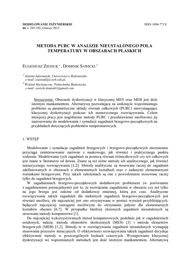 MODELOWANIE INŻYNIERSKIE 44, s. 285-292, Gliwice 2012 ISSN 1896-771X METODA PURC W ANALIZIE NIEUSTALONEGO POLA TEMPERATURY W OBSZARACH PŁASKICH EUGENIUSZ ZIENIUK a , DOMINIK SAWICKI b a Instytut Informatyki, Uniwersytet w Białymstoku e-mail: [email protected], b Wydział Mechaniczny, Politechnika Białostocka e-mail: [email protected] Streszczenie. Obecność dyskretyzacji w klasycznej MES oraz MEB jest dość istotnym mankamentem. Alternatywą pozwalającą na uniknięcie wspomnianego problemu są parametryczne układy równań całkowych (PURC) niewymagające klasycznej dyskretyzacji podczas ich numerycznego rozwiązywania. Celem niniejszej pracy jest uogólnienie metody PURC i przedstawienie możliwości jej zastosowania do modelowania i symulacji zagadnień brzegowo-początkowych na przykładach dotyczących problemów temperaturowych. 1. WSTĘP Modelowanie i symulacja zagadnień brzegowych i brzegowo-początkowych niezmiennie przyciąga zainteresowanie zarówno z naukowego, jak również i praktycznego punktu widzenia. Modelowanie tych zagadnień za pomocą równań różniczkowych czy też całkowych jest znane w literaturze od dawna. Znane są też różne metody ich analitycznego, jak również numerycznego rozwiązywania [1,2]. Metody analityczne są stosowane raczej do zagadnień zdefiniowanych w obszarach o elementarnych kształtach oraz z zadanymi elementarnymi warunkami brzegowymi. Przy takich założeniach są one z powodzeniem stosowane raczej tylko do zagadnień brzegowych. W zagadnieniach brzegowo-początkowych dodatkowym problemem (w porównaniu z zagadnieniami potencjalnymi) jest to, że rozwiązanie zagadnienia w obszarze czy też tylko na jego brzegu jest zależne od dodatkowej zmiennej, którą jest czas. Analityczne rozwiązywanie takich zagadnień dla niektórych zagadnień brzegowo-początkowych jest również możliwe, ale najczęściej jest ono otrzymywane w postaci wyrażeń przybliżających, będących najczęściej szeregami możliwymi do otrzymania jedynie dla elementarnych kształtów obszaru [6,7]. W przypadku bardziej złożonych zagadnień nieustalonych są stosowane metody komputerowe [1]. Do najczęściej wykorzystywanych metod komputerowych, podobnie jak w zagadnieniach ustalonych, należą: metoda elementów skończonych (MES) [3] i metoda elementów brzegowych (MEB) [1,2]. Metody te w rozwiązywaniu zagadnień nieustalonych wymagają stosowania procesów iteracyjnych. O efektywności rozwiązywania takich zagadnień decyduje efektywność metody w poszczególnych krokach czasowych. Występowanie klasycznej dyskretyzacji we wspomnianych metodach jest dość istotnym mankamentem. Alternatywą 286 E. ZIENIUK, D. SAWICKI pozwalającą na uniknięcie wspomnianego problemu są parametryczne układy równań całkowych (PURC) eliminujące klasyczną dyskretyzację brzegu. PURC z dużą efektywnością były stosowane dla zagadnień potencjalnych definiowanych różnymi równaniami różniczkowymi [4]. Celem niniejszej pracy jest uogólnienie metody PURC i przedstawienie możliwości jej zastosowania do modelowania i symulacji zagadnień brzegowo-początkowych na przykładach dotyczących problemów temperaturowych mających rozwiązania dokładne. 2. PURC DLA ZAGADNIEŃ NIEUSTALONYCH Równanie różniczkowe Fouriera opisujące nieustalone pole wewnętrznych źródeł jest przedstawiane w postaci [1] u ( x,t ) c k 2u ( x,t ), xΩ t temperatury bez (1) gdzie k [W/mK] jest to współczynnik przewodzenia ciepła, u(x,t) pole temperatury zależne od czasu, c[J/m3K] jest to ciepło właściwe odniesione do jednostki objętości, natomiast t jest to czas, zaś 2u ( x,t ) 2u ( x,t ) 2u ( x , t ) . x12 x22 Klasyczne brzegowe równanie całkowe (BRC) dla równania różniczkowego (1) jest przedstawiane w postaci [1] 1 0 .5 u ( ξ , t ) c F tF 1 0 Γ U ( ξ , x ,t ,t ) p ( x ,t )dΓ dt c t tF F * U F 0 P ( ξ , x ,t F ,t ) u ( x ,t )d dt (2) t0 Γ 0 ( ξ , x ,t ,t ) u ( x ,t ) dΩ ( x ), Ω gdzie 1 r2 exp , F F 4πa (t t ) 4a (t t ) r 2 ( x1 1 )2 ( x2 2 )2 , kd r2 exp , 2 F 2 F 8πa (t t ) 4a (t t ) d x1 ξ1 n1 x2 ξ 2 n2 . U * (ξ,x,t F ,t ) P* (ξ,x,t F ,t ) Po zastosowaniu analitycznej modyfikacji klasycznych BRC analogicznej, jaka była stosowana w przypadku zagadnień ustalonych [4], otrzymano PURC dla zagadnień nieustalonych, który jest przedstawiony za pomocą wyrażenia tF sj 1 n 0.5ul ( s1,t ) U lj ( s1,s,t F ,t ) p j ( s,t ) Plj (s1,s,t F ,t )u j ( s,t ) J j s dsdt c t 0 j 1 s j 1 F * F 0 0 U l ( s1,y,t ,t )u ( y,t )dΩ ( y ). Ω (3) METODA PURC W ANALIZIE NIEUSTALONEGO POLA TEMPERATURY W OBSZARACH …. 287 Funkcje podcałkowe w (3) są przedstawiane w następującej postaci 1 2 * U lj ( s1 , s,t F ,t ) exp , F F 4πa (t t ) 4a (t t ) kd 2 Plj (s1 , s,t ,t ) exp , 2 F 2 F 8πa (t t ) 4a (t t ) * F gdzie 2 2 2 1 2 , 0.5 S (1) ( s) S (j 2) (s ) , J j (s) j s s d 1n1 2n2 , 1 S l( 1 ) ( s1 ) S (j 1 ) ( s), 2 Sl( 2 ) ( s1 ) S (j 2 ) (s), S i (s) [ Si(1) , Si( 2 ) ]T . Si (s ) jest krzywą opisującą i ty segment brzegu. Funkcja podcałkowa w drugiej całce (3) jest przedstawiana w postaci 1 2 * F 0 U l ( s1 , y,t ,t ) exp , F 0 2 F 0 4πa (t t ) 4 a (t t ) 2 2 gdzie 1 Sl( 1 ) ( s1 ) y1 , 2 Sl( 2 ) ( s1 ) y2 . 2 1 2 , Na podstawie (3) można otrzymać tylko rozwiązania na brzegu rozpatrywanego zagadnienia brzegowo-początkowego. Podobnie jak w przypadku klasycznych BRC, mając rozwiązania na brzegu, można otrzymać rozwiązania w obszarze na podstawie tożsamości całkowej. Po otrzymaniu rozwiązań na brzegu na bazie równ. (3), rozwiązania w obszarze otrzyma się na podstawie zmodyfikowanej klasycznej tożsamości całkowej dla rozwiązań w obszarze. Przy podobnym postępowaniu jak w [4] zmodyfikowana tożsamość całkowa dla zagadnień nieustalonych przyjmuje następującą postać tF sj 1 n u ( x,t ) Uˆ j ( x,s, t F ,t ) p j ( s,t ) Pˆj ( x,s,t F ,t )u j ( s,t ) J j s dsdt c t 0 j 1 s j 1 F ˆ U * ( x,y,t F ,t 0 )u ( y,t 0 )dΩ ( y ). Ω Funk