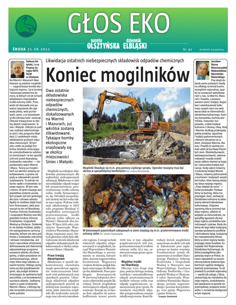 GŁOS EKO ŚRODA 31.08.2011 Tadeusz Ratyński, I z-ca Prezesa Zarządu WFOŚiGW w Olsztynie Na Warmii i Mazurach likwidowane są ostatnie mogilniki — najgroźniejsze bomby ekologiczne regionu. Są to bunkry i betonowe podziemne komory, w których od lat 50-tych składowano nieprzydatne środki ochrony roślin. Przez wiele lat stanowiły one poważne zagrożenie dla ujęć wody pitnej, wód gruntowych, jezior, a w konsekwencji dla zdrowia ludzi i zwierząt. Obecnie trwają prace w okolicy dwóch miejscowości: Siniec i Matyski. Odkryto je podczas realizacji zakończonego w 2007 roku programu likwidacji 17 podobnych miejsc składowania groźnych odpadów chemicznych. W tym roku udało się podjąć konkretne działania zmierzające do unieszkodliwienia substancji chemicznych i w ten sposób uchronić przed degradacją środowisko naturalne — niepowtarzalny walor Warmii i Mazur. Tereny po mogilnikach już wkrótce zostaną zrekultywowane, a groźne odpady w odpowiedni sposób zutylizowane. To jednak nie koniec walki o środowisko naszego regionu. W tym roku z terenu 18 gmin naszego województwa zostanie usuniętych prawie 550 ton groźnego dla życia i zdrowia azbestu. Będzie to możliwe dzięki środkom finansowym, jakie przeznaczył na ten cel Narodowy Fundusz Ochrony Środowiska i Gospodarki Wodnej oraz Wojewódzki Fundusz Ochrony Środowiska i Gospodarki Wodnej w Olsztynie. Działanie te nie byłoby możliwe, gdyby nie zaangażowanie samorządowców, którym nie obca jest troska o środowisko naturalne i zdrowie mieszkańców. Jednymi z warunków otrzymania dofinasowania jest stworzenie odpowiedniego programu usuwania azbestu dla danej gminy, a także posiadanie zinwentaryzowanego, aktualnego stanu tego odpadu na swoim terenie. Dlatego zachęcamy już dziś przedstawicieli gmin, aby podjęli działania zmierzające do spełnienia tych warunków, a w konsekwencji usunięcia azbestu. Zadbajmy razem o czyste środowisko Warmii i Mazur, z którego będzie korzystało przecież jeszcze wiele pokoleń. Nr 43 Likwidacja ostatnich niebezpiecznych składowisk odpadów chemicznych Koniec mogilników Dwa ostatnie składowiska niebezpiecznych odpadów chemicznych, zlokalizowanych na Warmii i Mazurach, już wkrótce zostaną zlikwidowane. Tykające bomby ekologiczne znajdowały się w okolicy miejscowości Siniec i Matyski. Mogilniki są rodzajem składowiska przeznaczonym dla najbardziej niebezpiecznych substancji. Składowano w nich nierozkładalne odpady trujące lub promieniotwórcze, przeterminowane środki ochrony roślin, środki farmaceutyczne, itp. Od takich niespodzianek niestety nie był wolny także nasz region. Podczas realizacji zakończonego w 2007 roku programu likwidacji 17 mogilników zawierających przeterminowane środki ochrony roślin odkryto na Warmii i Mazurach dwa kolejne. W lipcu 2011 roku z inicjatywy Samorządu Województwa Warmińsko-Mazurskiego rozpoczęto prace, których głównym celem było zlikwidowanie dwóch składowisk odpadów niebezpiecznych zlokalizowanych w okolicy miejscowości Siniec i Matyski. Prace trwają dwuetapowo Składowane w sposób niekontrolowany chemikalia mogły spowodować zagrożenie zanieczyszczenia lokalnych wód podziemnych oraz sąsiednich gruntów. Likwidacja składowisk odpadów niebezpiecznych pozwoli na definitywne usunięcie zagrożenia, jakie stanowią mogilniki dla środowiska naturalnego oraz zdrowia mieszkań- Mogilniki likwiduje się m.in. przy pomocy ciężkiego sprzętu. Operator maszyny musi być ubrany w specjalistyczny kombinezon Fot. Justyna Staniszewska W betonowych pojemnikach zakopanych w ziemi znajdują się m.in. przeterminowane środki ochrony roślin Fot. Justyna Staniszewska ców regionu. Z uwagi na brak właścicieli odpadów zdeponowanych w mogilnikach, Zarząd Województwa Warmińsko-Mazurskiego w porozumieniu ze starostą kętrzyńskim, starostą węgorzewskim, burmistrzem Węgorzewa i wójtem Srokowa podjął działania zmierzające do likwidacji obu składowisk. Prace przebiegały dwuetapowych. W pierwszej kolejności stworzono odpowiedni projekt likwidacji dwóch mogilników zawierających odpady pogalwaniczne. Szacuje się, że łączna ilość odpadów do unieszkodliwienia wynosi prawie 2100 ton, w tym: odpadów pogalwanicznych 408 ton, przeterminowanych środków ochrony roślin 32,5 ton, zanieczyszczonego gruzu i gruntu 1657 ton. Wspólne środki na likwidację Obecnie trwa drugi etap prac, podczas którego zostaną wydobyte i unieszkodliwione odpady przeterminowanych środków ochrony roślin oraz odpady pogalwaniczne, zanieczyszczony gruz i grunt. Po usunięciu wszystkich odpadów przeprowadzona zostanie rekultywacja terenu. Koszt lik- widacji dwóch mogilników oszacowano na około 1,42 mln zł. Zakończenie prac zaplanowano na koniec września. Przedsięwzięcie zostało sfinansowane ze środków Narodowego Funduszu Ochrony Środowiska i Gospodarki Wodnej w Warszawie oraz Wojewódzkiego Funduszu Ochrony Środowiska i Gospodarki Wodnej w Olsztynie, a także Samorządu Województwa Warmińsko-Mazurskiego, powiatu węgorzewskiego i powiatu kętrzyńskiego, oraz gminy Węgorzewo i gminy Srokowo. Grzegorz Siemieniuk dodatek bezpłatny Jarosław Słoma Wicemarszałek Województwa WarmińskoMazurskiego Przy okazji dożynek warto poświęcić chwilę na refleksję na temat kuchni, szczególnie regionalnej, opartej na surowcach wyhodowanych u nas, na Warmii, Mazurach i Powiślu, z poszanowaniem ziemi i tradycji. Bogactwo i wielobarwność kulturowa naszych ziem ma swój wyraz także w różnorodności dziedzictwa kulinarnego. Kuchnia staropolska, kuchnia warmińska, mazurska i kurpiowska, a także tradycje kulinarne z Ukrainy, Litwy, Rosji i Niemiec skutkują przebogatą paletą smaków, zapachów i tradycji gastronomicznych, z którymi obcujemy na co dzień. Dzisiejsze Warmia, Mazury i Powiśle to swoisty produkt setek lat burzliwej historii tych ziem. Wielokulturowość, wielowyznaniowość, wielonarodo