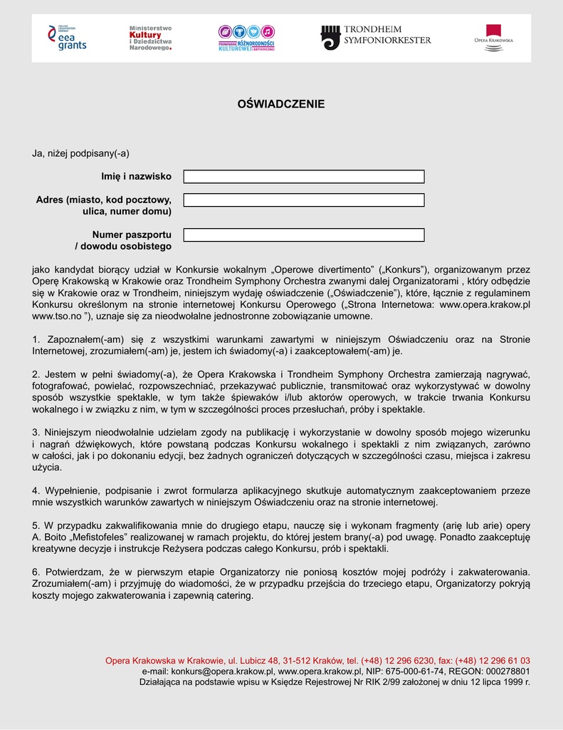 OŚWIADCZENIE Ja, niżej podpisany(-a) Imię i nazwisko Adres (miasto, kod pocztowy, ulica, numer domu) Numer paszportu / dowodu osobistego jako kandydat biorący udział w Konkursie wokalnym „Operowe divertimento” („Konkurs”), organizowanym przez Operę Krakowską w Krakowie oraz Trondheim Symphony Orchestra zwanymi dalej Organizatorami , który odbędzie się w Krakowie oraz w Trondheim, niniejszym wydaję oświadczenie („Oświadczenie”), które, łącznie z regulaminem Konkursu określonym na stronie internetowej Konkursu Operowego („Strona Internetowa: www.opera.krakow.pl www.tso.no ”), uznaje się za nieodwołalne jednostronne zobowiązanie umowne. 1. Zapoznałem(-am) się z wszystkimi warunkami zawartymi w niniejszym Oświadczeniu oraz na Stronie Internetowej, zrozumiałem(-am) je, jestem ich świadomy(-a) i zaakceptowałem(-am) je. 2. Jestem w pełni świadomy(-a), że Opera Krakowska i Trondheim Symphony Orchestra zamierzają nagrywać, fotografować, powielać, rozpowszechniać, przekazywać publicznie, transmitować oraz wykorzystywać w dowolny sposób wszystkie spektakle, w tym także śpiewaków i/lub aktorów operowych, w trakcie trwania Konkursu wokalnego i w związku z nim, w tym w szczególności proces przesłuchań, próby i spektakle. 3. Niniejszym nieodwołalnie udzielam zgody na publikację i wykorzystanie w dowolny sposób mojego wizerunku i nagrań dźwiękowych, które powstaną podczas Konkursu wokalnego i spektakli z nim związanych, zarówno w całości, jak i po dokonaniu edycji, bez żadnych ograniczeń dotyczących w szczególności czasu, miejsca i zakresu użycia. 4. Wypełnienie, podpisanie i zwrot formularza aplikacyjnego skutkuje automatycznym zaakceptowaniem przeze mnie wszystkich warunków zawartych w niniejszym Oświadczeniu oraz na stronie internetowej. 5. W przypadku zakwalifikowania mnie do drugiego etapu, nauczę się i wykonam fragmenty (arię lub arie) opery A. Boito „Mefistofeles” realizowanej w ramach projektu, do której jestem brany(-a) pod uwagę. Ponadto zaakceptuję kreatywne decyzje i instrukcje Reżysera podczas całego Konkursu, prób i spektakli. 6. Potwierdzam, że w pierwszym etapie Organizatorzy nie poniosą kosztów mojej podróży i zakwaterowania. Zrozumiałem(-am) i przyjmuję do wiadomości, że w przypadku przejścia do trzeciego etapu, Organizatorzy pokryją koszty mojego zakwaterowania i zapewnią catering. Opera Krakowska w Krakowie, ul. Lubicz 48, 31-512 Kraków, tel. (+48) 12 296 6230, fax: (+48) 12 296 61 03 e-mail: [email protected], www.opera.krakow.pl, NIP: 675-000-61-74, REGON: 000278801 Działająca na podstawie wpisu w Księdze Rejestrowej Nr RIK 2/99 założonej w dniu 12 lipca 1999 r. 7. Dodatkowo uznaję i akceptuję fakt, że nie otrzymam i nie jestem upoważniony(-a) do jakiegokolwiek wynagrodzenia dla wykonawcy podczas I, II i III etapu Konkursu. Jeżeli zostanę wybrany(-a) do obsady w spektaklu w III etapie, zaakceptuję standardową umowę z wynagrodzeniem zgodnym ze standardową strukturą wynagrodzeń Opery. Przyjmuję także do wiadomości, że liczba spektakli i czas ich trwania mogą ulec zmianie z przyczyn, na które nie mają wpływu dyrekcje Opery i Trondheim Symphony Orchestra. 8. W przypadku naruszenia przeze mnie umowy lub zwolnienia mnie z dowolnego powodu, w tym w szczególności z powodu opieszałości lub wcześniejszego opuszczenia ustalonych prób lub spektakli, nieprofesjonalnego zachowania lub niemożliwej do pogodzenia różnicy poglądów artystycznych, umowa traci ważność, a niżej podpisany(a) zrzeka się wszelkich roszczeń w stosunku do Organizatorów i wszelkich powiązanych stron. Decyzja o zwolnieniu Artysty należy wyłącznie do Dyrektorów Opery Krakowskiej i Trondheim Symphony Orchestra. 9. Jeżeli z jakiegokolwiek powodu Artysta nie może wystąpić, niniejsza umowa traci ważność. Odpowiedzialność stron z tytułu niniejszej umowy jest wyłączona jeżeli występ nie może się odbyć z powodu działania siły wyższej, fizycznej niedyspozycji, działań państwowych organów regulacyjnych lub związków zawodowych, problemów pracowniczych, strajków, wojny, epidemii lub z innych przyczyn leżących poza kontrolą Organizatorów lub Artysty. Organizatorzy nie są zobowiązani do zmiany powyższego postanowienia w przypadku, gdy Artysta nie może wystąpić. 10. Niniejszym potwierdzam, że niniejsza umowa podlega prawu polskiemu. Potwierdzam, że w przypadku braku możliwości polubownego rozwiązania sporów pomiędzy mną a Organizatorami wynikających z niniejszego Oświadczenia lub powstałych w związku z nim, sądem posiadającym wyłączną jurysdykcję w odniesieniu do każdego sporu jest sąd właściwy dla Krakowa. Data Opera Krakowska w Krakowie, ul. Lubicz 48, 31-512 Kraków, tel. (+48) 12 296 6230, fax: (+48) 12 296 61 03 e-mail: [email protected], www.opera.krakow.pl, NIP: 675-000-61-74, REGON: 000278801 Działająca na podstawie wpisu w Księdze Rejestrowej Nr RIK 2/99 założonej w dniu 12 lipca 1999 r.