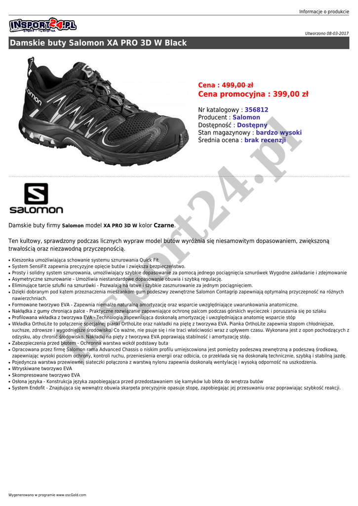 Informacje o produkcie Utworzono 08-03-2017 Damskie buty Salomon XA PRO 3D W Black Cena : 499,00 zł Cena promocyjna : 399,00 zł sp or t2 4. p l Nr katalogowy : 356812 Producent : Salomon Dostępność : Dostępny Stan magazynowy : bardzo wysoki Średnia ocena : brak recenzji Damskie buty firmy Salomon model XA PRO 3D W kolor Czarne. Ten kultowy, sprawdzony podczas licznych wypraw model butów wyróżnia się niesamowitym dopasowaniem, zwiększoną trwałością oraz niezawodną przyczepnością. ● ● ● ● ● ● ● ● ● ● ● ● ● ● ● ● Kieszonka umożliwiająca schowanie systemu sznurowania Quick Fit System SensiFit zapewnia precyzyjne opięcie butów i zwiększa bezpieczeństwo. Prosty i solidny system sznurowania, umożliwiający szybkie dopasowanie za pomocą jednego pociągnięcia sznurówek Wygodne zakładanie i zdejmowanie Asymetryczne sznurowanie - Umożliwia niestandardowe dopasowanie obuwia i szybką regulację. Eliminujące tarcie szlufki na sznurówki - Pozwalają na łatwe i szybkie zasznurowanie za jednym pociągnięciem. Dzięki dobranym pod kątem przeznaczenia mieszankom gum podeszwy zewnętrzne Salomon Contagrip zapewniają optymalną przyczepność na różnych nawierzchniach. Formowane tworzywo EVA - Zapewnia niemalże naturalną amortyzację oraz wsparcie uwzględniające uwarunkowania anatomiczne. Nakłądka z gumy chroniąca palce - Praktyczne rozwiązanie zapewniające ochronę palcom podczas górskich wycieczek i poruszania się po szlaku Profilowana wkładka z tworzywa EVA - Technologia zapewniająca doskonałą amortyzację i uwzględniająca anatomię wsparcie stóp Wkładka OrthoLite to połączenie specjalnej pianki OrthoLite oraz nakładki na piętę z tworzywa EVA. Pianka OrthoLite zapewnia stopom chłodniejsze, suchsze, zdrowsze i wygodniejsze środowisko. Co ważne, nie psuje się i nie traci właściwości wraz z upływem czasu. Wykonana jest z opon pochodzących z odzysku, aby chronić środowisko. Nakładki na pięty z tworzywa EVA poprawiają stabilność i amortyzację stóp. Zabezpieczenia przed błotem - Ochronna warstwa wokół podstawy buta Opracowana przez firmę Salomon rama Advanced Chassis o niskim profilu umiejscowiona jest pomiędzy podeszwą zewnętrzną a podeszwą środkową, zapewniając wysoki poziom ochrony, kontroli ruchu, przeniesienia energii oraz odbicia, co przekłada się na doskonałą technicznie, szybką i stabilną jazdę. Pojedyncza warstwa przewiewnej siateczki połączona z warstwą nylonu zapewnia doskonałą wentylację i wysoką odporność na uszkodzenia. Wtryskiwane tworzywo EVA Skompresowane tworzywo EVA Osłona języka - Konstrukcja języka zapobiegająca przed przedostawaniem się kamyków lub błota do wnętrza butów System Endofit - Znajdująca się wewnątrz obuwia skarpeta precyzyjnie opasuje stopę, zapobiegając jej przesuwaniu oraz poprawiając szybkość reakcji. in ● Wygenerowano w programie www.oscGold.com l 4. p sp or t2 in Kolekcja: 2015 Dostępne opcje Damskie buty Salomon XA PRO 3D W Black Rozmiar: 37 1/3, 38 2/3, 40.