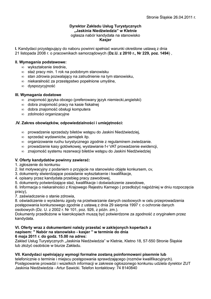 Stronie Śląskie 26.04.2011 r. Dyrektor Zakładu Usług Turystycznych „Jaskinia Niedźwiedzia” w Kletnie ogłasza nabór kandydata na stanowisko Kasjer I. Kandydaci przystępujący do naboru powinni spełniać warunki określone ustawą z dnia 21 listopada 2008 r. o pracownikach samorządowych (Dz.U. z 2010 r., Nr 229, poz. 1494) , II. Wymagania podstawowe: • wykształcenie średnie, • staŜ pracy min. 1 rok na podobnym stanowisku • stan zdrowia pozwalający na zatrudnienie na tym stanowisku, • niekaralność za przestępstwo popełnione umyślne, • dyspozycyjność III. Wymagania dodatowe • znajomość języka obcego (preferowany język niemiecki,angielski) • dobra znajomość pracy na kasie fiskalnej • dobra znajomość obsługi komputera • zdolności organizacyjne .IV. Zakres obowiązków, odpowiedzialności i umiejętności: • • • • • prowadzenie sprzedaŜy biletów wstępu do Jaskini Niedźwiedziej, sprzedaŜ wydawnictw, pamiątek itp. organizowanie ruchu turystycznego zgodnie z regulaminem zwiedzanie. prowadzenie kasy gotówkowej, wystawianie f-r VAT prowadzenie ewidencji, znajomość systemu rezerwacji biletów wstępu do Jaskini Niedźwiedziej V. Oferty kandydatów powinny zawierać: 1. zgłoszenie do konkursu 2. list motywacyjny z podaniem o przyjęcie na stanowisko objęte konkursem, cv, 3. dokumenty stwierdzające posiadanie wykształcenie i kwalifikacje, 4. opisany przez kandydata przebieg pracy zawodowej, 5. dokumenty potwierdzające staŜ, kwalifikacje i doświadczenie zawodowe, 6. Informacja o niekaralności z Krajowego Rejestru Karnego ( przedłoŜyć najpóźniej w dniu rozpoczęcia pracy), 7. zaświadczenie o stanie zdrowia, 8. oświadczenie o wyraŜeniu zgody na przetwarzanie danych osobowych w celu przeprowadzenia postępowania konkursowego zgodnie z ustawą z dnia 29 sierpnia 1997 r. o ochronie danych osobowych (Dz. U. z 2002 r. Nr 101, poz. 926, z późn. zm.). Dokumenty przedłoŜone w kserokopiach muszą być potwierdzone za zgodność z oryginałem przez kandydata. VI. Oferty wraz z dokumentami naleŜy przesłać w zaklejonych kopertach z napisem: " Nabór na stanowisko - kasjer '' w terminie do dnia 6 maja 2011 r. do godz. 15.00 na adres: Zakład Usług Turystycznych „Jaskinia Niedźwiedzia” w Kletnie, Kletno 18, 57-550 Stronie Śląskie lub złoŜyć osobiście w biurze Zakładu. VII. Kandydaci spełniający wymogi formalne zostaną poinformowani pisemnie lub telefonicznie o terminie i miejscu postępowania sprawdzającego (rozmów kwalifikacyjnych). Postępowanie prowadzi i wszelkich informacji w zakresie ogłoszonego konkursu udziela dyrektor ZUT Jaskinia Niedźwiedzia - Artur Sawicki. Telefon kontaktowy: 74 8140840