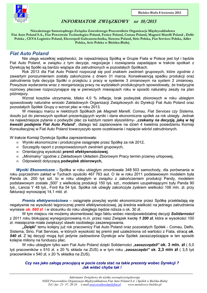 Bielsko-Biała 8 kwietnia 2013 Informator Związkowy 10/2013 ------------------------------------------------------------------------------------------------------------------------------------------------ INFORMATOR ZWIĄZKOWY nr 10/2013 Ć Niezależnego Samorządnego Związku Zawodowego Pracowników Organizacja Międzyzakładowa Fiat Auto Poland S.A., Fiat Powertrain Technologies Poland, Fenice Poland, Comau Poland, Magneti Marelli Poland , Delfo Polska , CEVA Logistics Poland, Electropoli Galwanotechnika, Sistema Poland, Sirio Polska, Fiat Services Polska, Adler Polska, Avio Polska w Bielsku-Białej. Fiat Auto Poland Nie ulega wszelkiej wątpliwości, że najważniejszą Spółką w Grupie Fiata w Polsce jest był i będzie Fiat Auto Poland, w związku z tym decyzje, negocjacje i rozwiązania zapadające w trakcie spotkań z Dyrekcją tej Spółki są bardzo wiążące dla zatrudnionych w pozostałych Spółkach. Rok 2013 dla Fiat Auto Poland rozpoczął się pod znakiem zwolnień grupowych, które zgodnie z zawartym porozumieniem zostały zakończone z dniem 31 marca. Konsekwencją spadku produkcji oraz zatrudnienia była decyzja Spółki o przejściu z pracy w systemie 3 zmianowym na system 2 zmianowy. Powyższe wydarzenia wraz z reorganizacją pracy na wydziałach produkcyjnych spowodowały, że tradycyjne rozmowy płacowe rozpoczynające się w pierwszych miesiącach roku w sposób naturalny zeszły na plan późniejszy. Wzrost kosztów utrzymania, blisko 4,0 % inflacja, brak podwyżek zbiorowych w roku ubiegłym spowodowały naturalne wnioski Zakładowych Organizacji Związkowych do Dyrekcji Fiat Auto Poland oraz pozostałych Spółek Grupy o wzrost płac w roku 2013. W miesiącu marcu w niektórych Spółkach jak Magneti Marelli, Comau, Fiat Services czy Sistema, doszło już do pierwszych spotkań prezentujących wyniki i dane ekonomiczne spółek za rok ubiegły. Jednak na najważniejsze pytanie o podwyżki płac za każdym razem słyszeliśmy- „czekamy na decyzję, jaką w tej kwestii podejmie Fiat Auto Poland”, dlatego też zaplanowane na dzień 4 kwietnia posiedzeniu Komisji Konsultacyjnej w Fiat Auto Poland towarzyszyło spore oczekiwanie i napięcie wśród zatrudnionych. W trakcie Komisji Dyrekcja Spółka zaprezentowała: • Wyniki ekonomiczne i produkcyjne osiągnięte przez Spółkę za rok 2012, • Szczegóły raport z przeprowadzonych zwolnień grupowych, • Orientacyjną wysokość premii efektywnościowej, • „Minimalny” zgodnie z Zakładowym Układem Zbiorowym Pracy termin przerwy urlopowej, • Odpowiedź dotyczącą podwyżek zbiorowych, Wyniki Ekonomiczne - Spółka w roku ubiegłym zmontowała 348 503 samochody, dla porównania w roku poprzednim zakład w Tychach opuściło 467 763 aut. O ile w roku 2011 podstawowym modelem była Panda ok. 200 tyś szt. to w roku ubiegłym w związku z zakończeniem produkcji Pandy, modelem podstawowym została „500” z wielkością produkcji 150 tyś. szt., modelami uzupełniającymi były Panda 90 tyś., Lancia Y 48 tyś., Ford Ka 54 tyś. Spółka rok ubiegły zakończyła zyskiem wielkości 106 mln. zł. przy fakturacji wynoszącej 14,1 mld. zł. Premia efektywnościowa – osiągnięte powyżej wyniki ekonomiczne przez Spółkę przekładają się negatywnie na wysokość tegorocznej premii efektywnościowej, jej średnia wielkość na jednego zatrudnienia wyniesie ok. 660 zł. i w stosunku do roku ubiegłego będzie niższa o ok. 30 zł. W tym miejscu nie możemy skomentować tego faktu wobec nieodpowiedzialnej decyzji Solidarności z 2011 roku blokującej wynegocjonowaną m.in. przez nasz Związek kwotę 1 200 zł, która w wysokości 100 zł. miesięcznie miała zwiększyć stawki osobistego zaszeregowania. „Dzięki” temu kolejny już rok pracownicy Fiat Auto Poland oraz pozostałych Spółek - Comau, Delfo, Sistema, Sirio, Fiat Services, w których wysokość tej premii jest uzależniona od wartości z Fiata, stracą ok. 540 zł. Z tej decyzji mogą być jedynie zadowolone Dyrekcje w/w Spółek zaoszczędzające w ten sposób kolejne miliony na funduszu płac. W roku ubiegłym tylko sam Fiat Auto Poland dzięki Solidarności „zaoszczędził” ok. 3 mln. zł ( 5,0 tyś pracowników x 510 zł. x 20 % składa na ZUS) a w tym roku „zaoszczędzi” ok. 2,3 mln zł ( 3,5 tyś pracowników x 540 zł, x 20 % składka na ZUS). Czy nas jako załogę pracującą w pocie czoła stać na takie prezenty wobec Dyrekcji ? Jak widać chyba tak ! -----------------------------------------------------------------------------------------------------------------------------------------------Informator Związkowy do użytku wewnątrzzwiązkowego NSZZ Pracowników Organizacja Międzyzakładowa Fiat Auto Poland S.A. i Spółek w Bielsku-Białej Tel./ fax 21- 37, 20-24 e-mail [email protected] www.metalowcy-bielsko.pl Informator Związkowy 10/2013 -----------------------------------------------------------------------------------------------------------------------------------------------Zwolnienia grupowe - do dnia 31 marca ze Spółki zostało zwolnionych 1394 pracowników, w tym 1256 zatrudnionych na etatach fizycznych i 138 zatrudnionych na etatach umysłowych. Wśród zwolnionych większość stanowili mężczyźni tj. ok. 80 %, blisko 800 osobowa grupa to osoby do 40 roku życia, ponad 300 osób będących poza kryteriami było inicjatorem własnego odejścia. Do końca roku w ramach tych zwolnień odejdzie jeszcze ok. 40 osób, które będą pracować do końca lipca, lub dopracują do wymaganego przez ustawę o świadczeniach przedemerytalnych wieku lub lat pracy. Najważniejszą informacja tego raportu jest zapewnienie ze strony Dyrekcji, że więcej zwolnień nie będzie, co tym samym ucina krążące po wydziałach plotki w tym zakresie. Przerwa wakacyjna – chociaż do wakacji jeszcze sporo czasu ale już w tej chwili w biurach podróży oraz na kwaterach prywatnych zaczyna się rezerwowanie terminów, dla