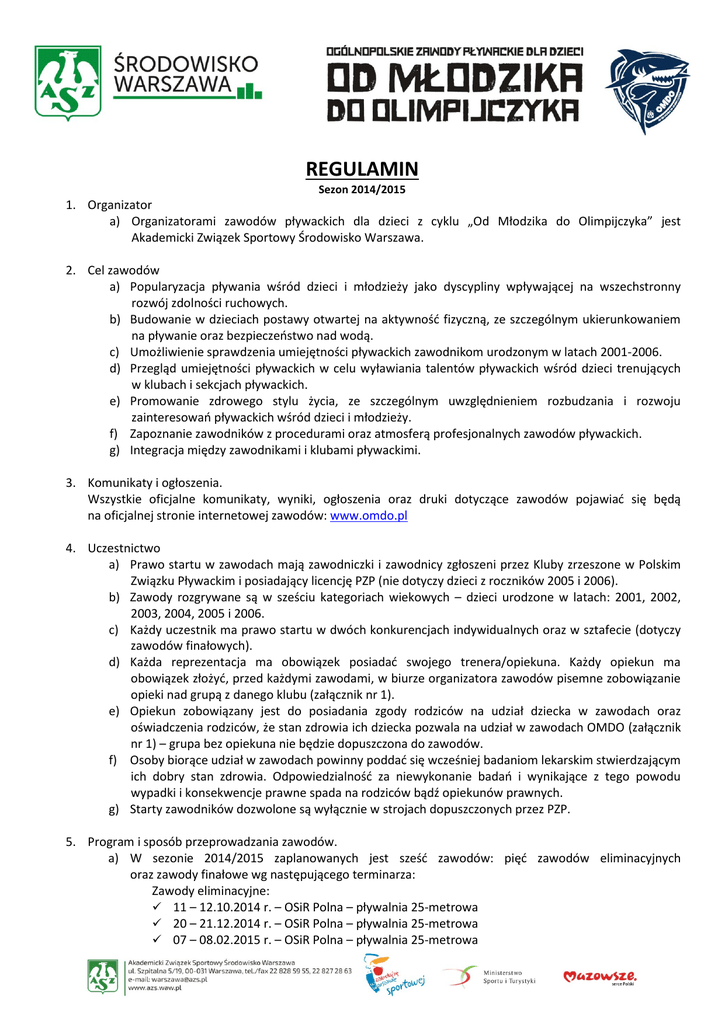REGULAMIN Sezon 2014/2015 1. Organizator a) Organizatorami zawodów pływackich dla dzieci z cyklu „Od Młodzika do Olimpijczyka” jest Akademicki Związek Sportowy Środowisko Warszawa. 2. Cel zawodów a) Popularyzacja pływania wśród dzieci i młodzieży jako dyscypliny wpływającej na wszechstronny rozwój zdolności ruchowych. b) Budowanie w dzieciach postawy otwartej na aktywność fizyczną, ze szczególnym ukierunkowaniem na pływanie oraz bezpieczeństwo nad wodą. c) Umożliwienie sprawdzenia umiejętności pływackich zawodnikom urodzonym w latach 2001-2006. d) Przegląd umiejętności pływackich w celu wyławiania talentów pływackich wśród dzieci trenujących w klubach i sekcjach pływackich. e) Promowanie zdrowego stylu życia, ze szczególnym uwzględnieniem rozbudzania i rozwoju zainteresowań pływackich wśród dzieci i młodzieży. f) Zapoznanie zawodników z procedurami oraz atmosferą profesjonalnych zawodów pływackich. g) Integracja między zawodnikami i klubami pływackimi. 3. Komunikaty i ogłoszenia. Wszystkie oficjalne komunikaty, wyniki, ogłoszenia oraz druki dotyczące zawodów pojawiać się będą na oficjalnej stronie internetowej zawodów: www.omdo.pl 4. Uczestnictwo a) Prawo startu w zawodach mają zawodniczki i zawodnicy zgłoszeni przez Kluby zrzeszone w Polskim Związku Pływackim i posiadający licencję PZP (nie dotyczy dzieci z roczników 2005 i 2006). b) Zawody rozgrywane są w sześciu kategoriach wiekowych – dzieci urodzone w latach: 2001, 2002, 2003, 2004, 2005 i 2006. c) Każdy uczestnik ma prawo startu w dwóch konkurencjach indywidualnych oraz w sztafecie (dotyczy zawodów finałowych). d) Każda reprezentacja ma obowiązek posiadać swojego trenera/opiekuna. Każdy opiekun ma obowiązek złożyć, przed każdymi zawodami, w biurze organizatora zawodów pisemne zobowiązanie opieki nad grupą z danego klubu (załącznik nr 1). e) Opiekun zobowiązany jest do posiadania zgody rodziców na udział dziecka w zawodach oraz oświadczenia rodziców, że stan zdrowia ich dziecka pozwala na udział w zawodach OMDO (załącznik nr 1) – grupa bez opiekuna nie będzie dopuszczona do zawodów. f) Osoby biorące udział w zawodach powinny poddać się wcześniej badaniom lekarskim stwierdzającym ich dobry stan zdrowia. Odpowiedzialność za niewykonanie badań i wynikające z tego powodu wypadki i konsekwencje prawne spada na rodziców bądź opiekunów prawnych. g) Starty zawodników dozwolone są wyłącznie w strojach dopuszczonych przez PZP. 5. Program i sposób przeprowadzania zawodów. a) W sezonie 2014/2015 zaplanowanych jest sześć zawodów: pięć zawodów eliminacyjnych oraz zawody finałowe wg następującego terminarza: Zawody eliminacyjne: 11 – 12.10.2014 r. – OSiR Polna – pływalnia 25-metrowa 20 – 21.12.2014 r. – OSiR Polna – pływalnia 25-metrowa 07 – 08.02.2015 r. – OSiR Polna – pływalnia 25-metrowa 11.04.2015 r. – Wodny Park Warszawianka – pływalnia 50-metrowa 16.05.2015 r. – Wodny Park Warszawianka – pływalnia 50-metrowa b) c) d) e) f) g) Finał: 13.06.2015 r. – Wodny Park Warszawianka – pływalnia 50-metrowa Zawody na pływalni 25-metrowej rozgrywane są w ciągu dwóch dni (sobota i niedziela), w trzech blokach, podzielonych ze względu na wiek zawodników: I blok – sobota w godz. 9.00 – 14.00 – dzieci urodzone w latach 2005 i 2006 II blok – sobota w godz. 16.00 – 20.00 – dzieci urodzone w latach 2001 i 2002 III blok – niedziela w godz. 9.00 – 14.00 – dzieci urodzone w latach 2003 i 2004 Zawody na pływalni 50-metrowej rozgrywane są jednego dnia (sobota) w godz. 9.00 – 15.00. Wykaz konkurencji, w których startują zawodnicy / zawodniczki z poszczególnych kategorii wiekowych znajdują się w załączniku nr 2. Wszystkie zawody (poszczególne bloki) poprzedzone są rozgrzewką rozpoczynającą się jedną godzinę przed rozpoczęciem danego bloku. Zawody przeprowadzane są seriami na czas. Uzyskany rezultat czasowy decyduje o uzyskanym miejscu w danej konkurencji. Zawody finałowe – Wielki Finał sezonu 2014/2015 – zostaną przeprowadzone w konkurencjach indywidualnych, w których przeprowadzane są zawody (z wyjątkiem stylu zmiennego) oraz w sztafecie 8 x 50 metrów stylem dowolnym. W zawodach finałowych w każdej konkurencji indywidualnej i kategorii wiekowej biorą udział 3 osoby, które uzyskały w sezonie 2014/2015 najlepsze wyniki według punktów FINA oraz najlepszych 13 osób według zestawienia punktów FINA uwzględniającego cztery najlepsze wyniki ze wszystkich zawodów. W zawodach finałowych w sztafecie 8 x 50 metrów stylem dowolnym, prawo startu ma tylko jedna sztafeta z każdego klubu w 8-osobowym składzie mieszanym, w tym minimalnie 3 dziewczęta oraz obowiązkowo jeden trener. Trener płynie na ostatniej zmianie. 6. Zgłoszenia do zawodów a) Zgłoszenia do zawodów należy przesłać w nieprzekraczalnym terminie do 5 dni przed zawodami w pliku lxf (format Lenex) na adres [email protected] b) Niezbędnym do prawidłowego zgłoszenia zawodnika / zawodniczki jest nr licencji PZP (nie dotyczy dzieci z roczników 2005 i 2006). c) Prawo zgłaszania i wygłaszania zawodników z danego klubu przysługuje jedynie trenerowi lub innej osobie pisemnie upoważnionej przez Klub. d) Liczba zgłoszeń jest ograniczona – decyduje kolejność zgłoszeń. Ze względu na duże zainteresowanie zawodami prosimy o wcześniejsze przesyłanie zgłoszeń. e) Zgłoszenie do zawodów równoznaczne jest z akceptacją postanowień niniejszego regulaminu. f) Termin zgłoszeń upływa z datą określoną w komunikacie dotyczącym danych zawodów. g) Wykreślenia zawodników możliwe są nie później niż w terminie i w sposób określony w komunikacie danych zawodów. Po tym terminie Klub ma obowiązek dokonać opłaty startowej za zgłoszoną ilość zawodników / zawodniczek. W przypadku niewpłacenia całej należnej kwoty dany Klub zostaje wykluczony z kolejnyc