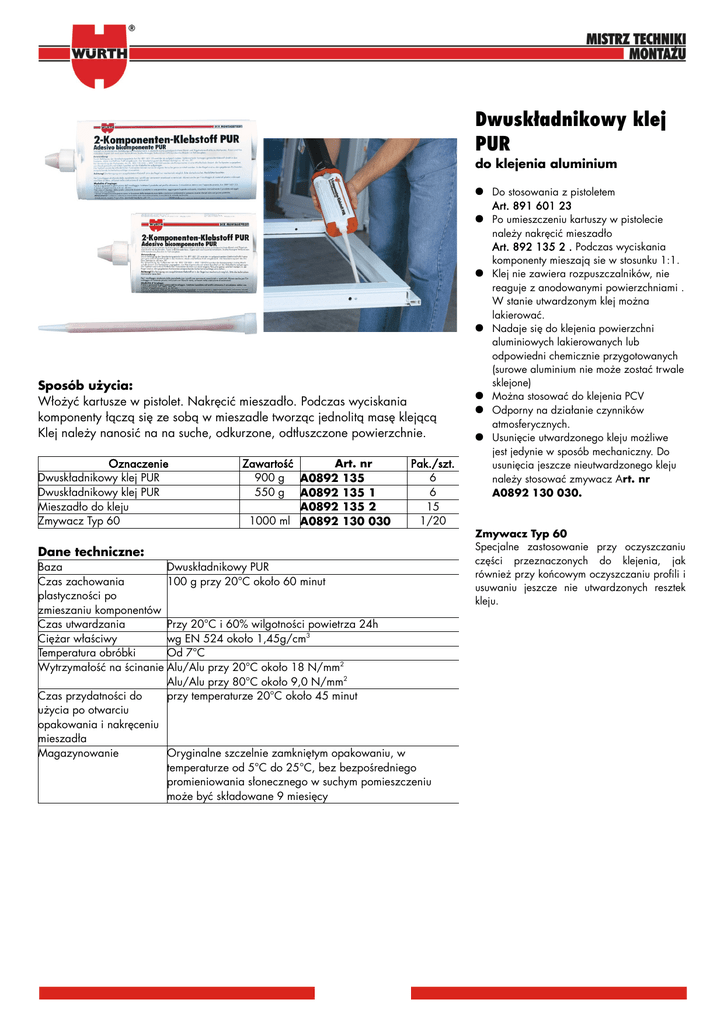 Dwuskładnikowy klej PUR do klejenia aluminium ● Do stosowania z pistoletem Art. 891 601 23 ● Po umieszczeniu kartuszy w pistolecie ● ● Sposób użycia: Włożyć kartusze w pistolet. Nakręcić mieszadło. Podczas wyciskania komponenty łączą się ze sobą w mieszadle tworząc jednolitą masę klejącą Klej należy nanosić na na suche, odkurzone, odtłuszczone powierzchnie. Oznaczenie Dwuskładnikowy klej PUR Dwuskładnikowy klej PUR Mieszadło do kleju Zmywacz Typ 60 Zawartość Art. nr 900 g A0892 135 550 g A0892 135 1 A0892 135 2 1000 ml A0892 130 030 Pak./szt. 6 6 15 1/20 Dane techniczne: Baza Dwuskładnikowy PUR Czas zachowania 100 g przy 20°C około 60 minut plastyczności po zmieszaniu komponentów Czas utwardzania Przy 20°C i 60% wilgotności powietrza 24h Ciężar właściwy wg EN 524 około 1,45g/cm3 Temperatura obróbki Od 7°C Wytrzymałość na ścinanie Alu/Alu przy 20°C około 18 N/mm2 Alu/Alu przy 80°C około 9,0 N/mm2 Czas przydatności do przy temperaturze 20°C około 45 minut użycia po otwarciu opakowania i nakręceniu mieszadła Magazynowanie Oryginalne szczelnie zamkniętym opakowaniu, w temperaturze od 5°C do 25°C, bez bezpośredniego promieniowania słonecznego w suchym pomieszczeniu może być składowane 9 miesięcy ● ● ● należy nakręcić mieszadło Art. 892 135 2 . Podczas wyciskania komponenty mieszają sie w stosunku 1:1. Klej nie zawiera rozpuszczalników, nie reaguje z anodowanymi powierzchniami . W stanie utwardzonym klej można lakierować. Nadaje się do klejenia powierzchni aluminiowych lakierowanych lub odpowiedni chemicznie przygotowanych (surowe aluminium nie może zostać trwale sklejone) Można stosować do klejenia PCV Odporny na działanie czynników atmosferycznych. Usunięcie utwardzonego kleju możliwe jest jedynie w sposób mechaniczny. Do usunięcia jeszcze nieutwardzonego kleju należy stosować zmywacz Art. nr A0892 130 030. Zmywacz Typ 60 Specjalne zastosowanie przy oczyszczaniu części przeznaczonych do klejenia, jak również przy końcowym oczyszczaniu profili i usuwaniu jeszcze nie utwardzonych resztek kleju.