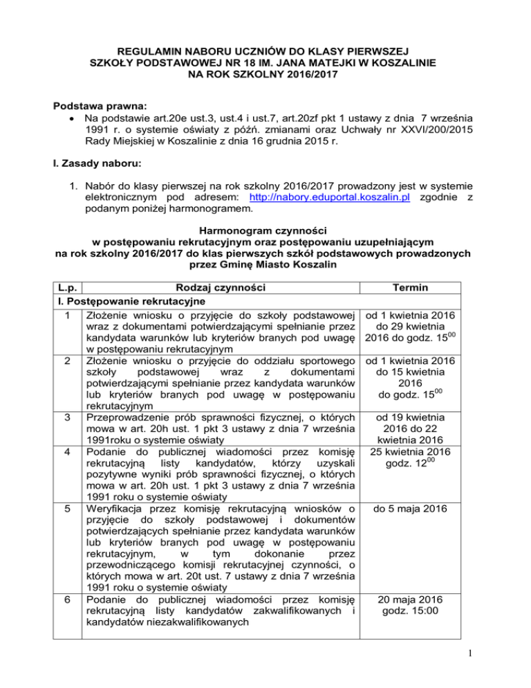 REGULAMIN NABORU UCZNIÓW DO KLASY PIERWSZEJ SZKOŁY PODSTAWOWEJ NR 18 IM. JANA MATEJKI W KOSZALINIE NA ROK SZKOLNY 2016/2017 Podstawa prawna: Na podstawie art.20e ust.3, ust.4 i ust.7, art.20zf pkt 1 ustawy z dnia 7 września 1991 r. o systemie oświaty z późń. zmianami oraz Uchwały nr XXVI/200/2015 Rady Miejskiej w Koszalinie z dnia 16 grudnia 2015 r. I. Zasady naboru: 1. Nabór do klasy pierwszej na rok szkolny 2016/2017 prowadzony jest w systemie elektronicznym pod adresem: http://nabory.eduportal.koszalin.pl zgodnie z podanym poniżej harmonogramem. Harmonogram czynności w postępowaniu rekrutacyjnym oraz postępowaniu uzupełniającym na rok szkolny 2016/2017 do klas pierwszych szkół podstawowych prowadzonych przez Gminę Miasto Koszalin L.p. Rodzaj czynności Termin I. Postępowanie rekrutacyjne 1 Złożenie wniosku o przyjęcie do szkoły podstawowej od 1 kwietnia 2016 wraz z dokumentami potwierdzającymi spełnianie przez do 29 kwietnia kandydata warunków lub kryteriów branych pod uwagę 2016 do godz. 1500 w postępowaniu rekrutacyjnym 2 Złożenie wniosku o przyjęcie do oddziału sportowego od 1 kwietnia 2016 szkoły podstawowej wraz z dokumentami do 15 kwietnia potwierdzającymi spełnianie przez kandydata warunków 2016 lub kryteriów branych pod uwagę w postępowaniu do godz. 1500 rekrutacyjnym 3 Przeprowadzenie prób sprawności fizycznej, o których od 19 kwietnia mowa w art. 20h ust. 1 pkt 3 ustawy z dnia 7 września 2016 do 22 1991roku o systemie oświaty kwietnia 2016 4 Podanie do publicznej wiadomości przez komisję 25 kwietnia 2016 rekrutacyjną listy kandydatów, którzy uzyskali godz. 1200 pozytywne wyniki prób sprawności fizycznej, o których mowa w art. 20h ust. 1 pkt 3 ustawy z dnia 7 września 1991 roku o systemie oświaty 5 Weryfikacja przez komisję rekrutacyjną wniosków o do 5 maja 2016 przyjęcie do szkoły podstawowej i dokumentów potwierdzających spełnianie przez kandydata warunków lub kryteriów branych pod uwagę w postępowaniu rekrutacyjnym, w tym dokonanie przez przewodniczącego komisji rekrutacyjnej czynności, o których mowa w art. 20t ust. 7 ustawy z dnia 7 września 1991 roku o systemie oświaty 6 Podanie do publicznej wiadomości przez komisję 20 maja 2016 rekrutacyjną listy kandydatów zakwalifikowanych i godz. 15:00 kandydatów niezakwalifikowanych 1 7 Potwierdzenie przez rodzica kandydata woli przyjęcia w do 24 maja 2016 postaci pisemnego oświadczenia do godz. 15:00 8 Podanie do publicznej wiadomości przez komisję 25 maja 2016 rekrutacyjną listy kandydatów przyjętych i kandydatów godz. 15:00 nieprzyjętych II. Postępowanie uzupełniające 1 Złożenie wniosku o przyjęcie do szkoły podstawowej od 1 czerwca 2016 wraz z dokumentami potwierdzającymi spełnianie przez do 24 czerwca kandydata warunków lub kryteriów branych pod uwagę 2016 w postępowaniu rekrutacyjnym do godz. 1500 2 3 4 5 6 7 8 Złożenie wniosku o przyjęcie do oddziału sportowego od 1 czerwca 2016 szkoły podstawowej wraz z dokumentami do 10 potwierdzającymi spełnianie przez kandydata warunków czerwca2016 lub kryteriów branych pod uwagę w postępowaniu do godz. 1500 rekrutacyjnym Przeprowadzenie prób sprawności fizycznej, o których do 15 czerwca mowa w art. 20h ust. 1 pkt 3 ustawy z dnia 7 września 2016 1991roku o systemie oświaty Podanie do publicznej wiadomości przez komisję do 17 czerwca rekrutacyjną listy kandydatów, którzy uzyskali 2016 pozytywne wyniki prób sprawności fizycznej, o których mowa w art. 20h ust. 1 pkt 3 ustawy z dnia 7 września 1991 roku o systemie oświaty Weryfikacja przez komisję rekrutacyjną wniosków o do 29 czerwca przyjęcie do szkoły podstawowej i dokumentów 2016 potwierdzających spełnianie przez kandydata warunków lub kryteriów branych pod uwagę w postępowaniu rekrutacyjnym, w tym dokonanie przez przewodniczącego komisji rekrutacyjnej czynności, o których mowa w art. 20t ust. 7 ustawy z dnia 7 września 1991 roku o systemie oświaty Podanie do publicznej wiadomości przez komisję 30 czerwca 2016 rekrutacyjną listy kandydatów zakwalifikowanych i godz. 1500 kandydatów niezakwalifikowanych Potwierdzenie przez rodzica kandydata woli przyjęcia do 4 lipca 2016 w postaci pisemnego oświadczenia do godz. 1500 Podanie do publicznej wiadomości przez komisję 5 lipca 2016 rekrutacyjną listy kandydatów przyjętych i kandydatów godz. 1500 nieprzyjętych 2. Do dopełnienia czynności związanych ze zgłoszeniem dziecka do szkoły zobowiązani są jego rodzice lub prawni opiekunowie. 3. Do klasy pierwszej przyjmowane są dzieci podlegające obowiązkowi szkolnemu, które w 2016 r. ukończą 7 lat. 4. Na wniosek rodziców naukę w klasie pierwszej może także rozpocząć dziecko, które w roku kalendarzowym 2016 kończy 6 lat, jeżeli korzystało z wychowania przedszkolnego w roku szkolnym 2015/2016 albo posiada opinię o możliwości rozpoczęcia nauki w szkole podstawowej, wydana przez poradnię psychologiczno - pedagogiczną. 2 5. Dzieci zamieszkałe w obwodzie szkoły mają z urzędu zapewnione miejsce w szkole i są przyjmowane na wniosek rodziców/opiekunów prawnych złożony drogą elektroniczną. 6. Zgłoszenie dziecka do klasy pierwszej polega na wprowadzeniu informacji do systemu informatycznego w ramach Elektronicznego Systemu Zarządzania Oświatą http://nabory.eduportal.koszalin.pl o dokonanym przez rodziców/opiekunów prawnych wyborze placówki. 7. Wydrukowane i podpisane przez rodziców/opiekunów prawnych podanie należy złożyć w kancelarii szkoły. 8. W terminie wskazanym w harmonogramie czynności w postępowaniu rekrutacyjnym do szkół podstawowych kandydaci zakwalifikowani muszą potwierdzić w kancelarii szkoły wolę podjęcia nauki w Szkole Podstawowej nr 18 im. Jana Matejki w Koszalinie . 9. Dzieci zamieszkałe poza obwodem szkoły zostaną przyjęte w miarę wolnych miejsc na zasadach rekrutacji na wolne miejsca. II. Zasady rekrutacji na wolne miejsca: 1. 